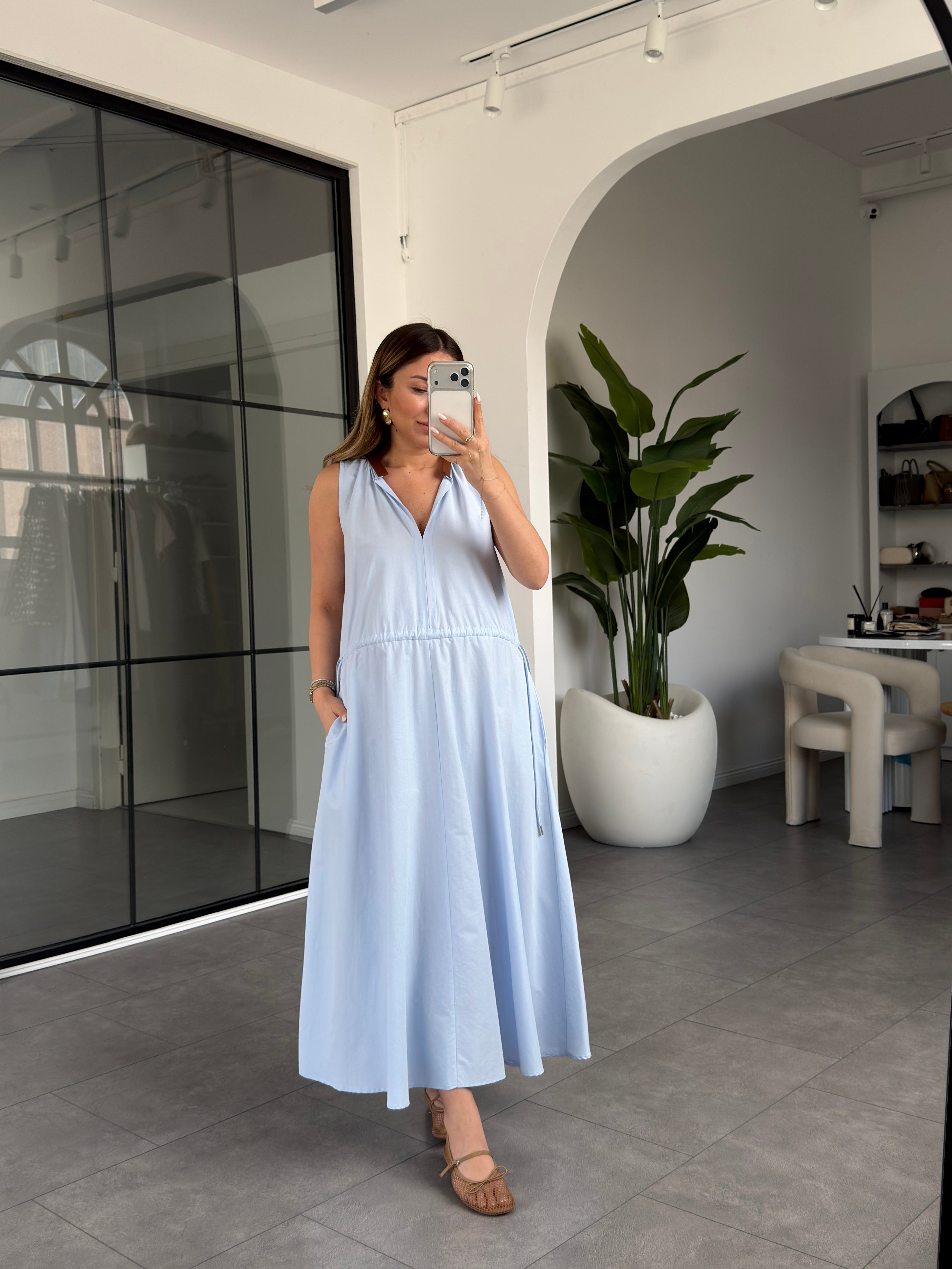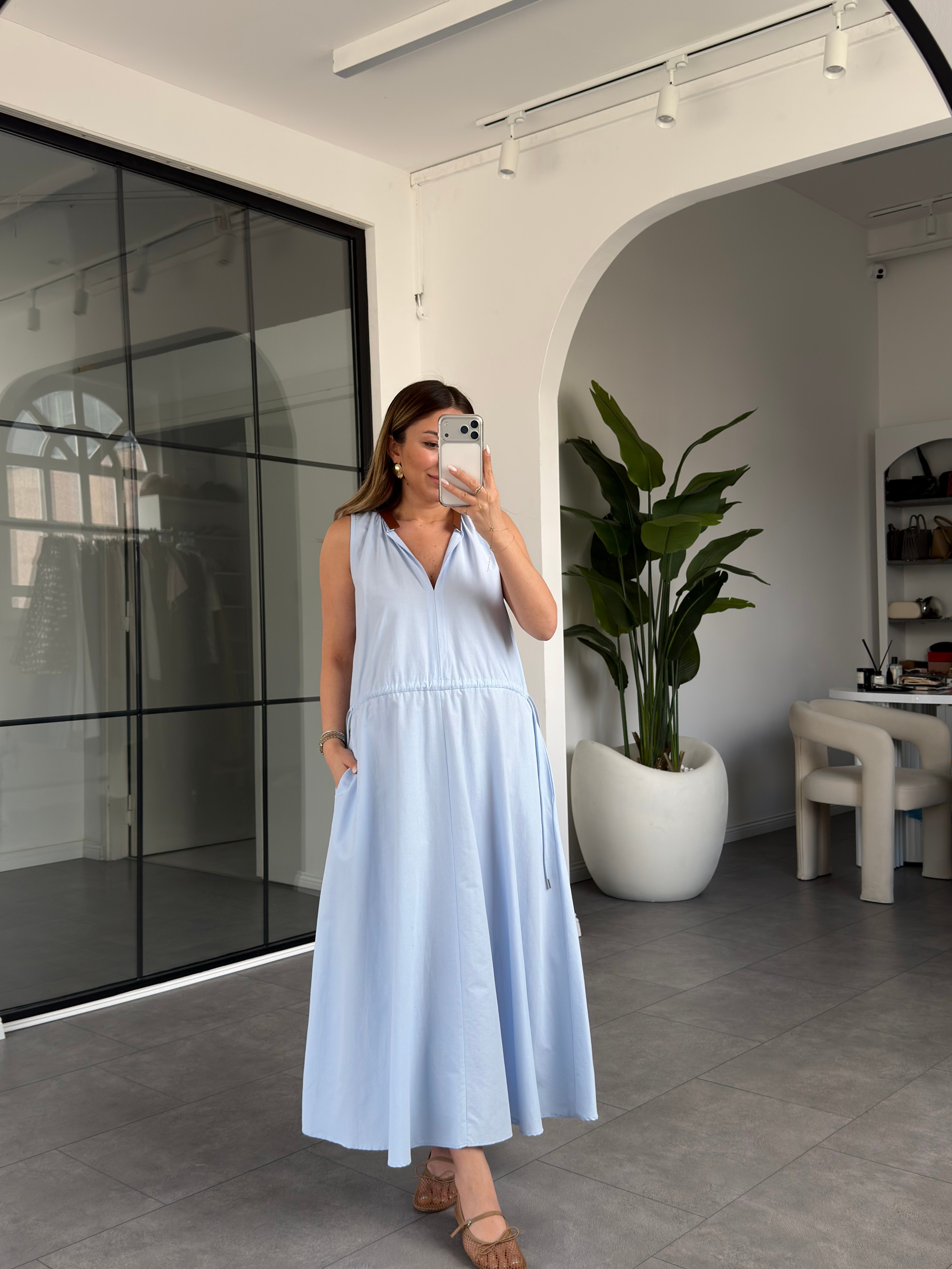 Yakası Deri Detaylı Beli Büzgülü Elbise 3938