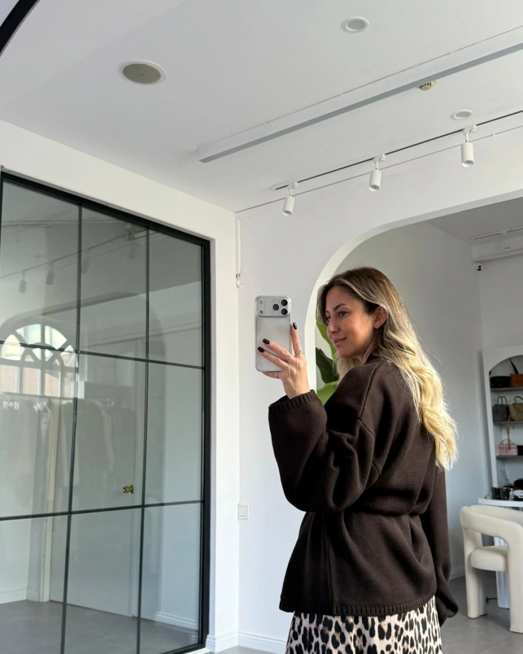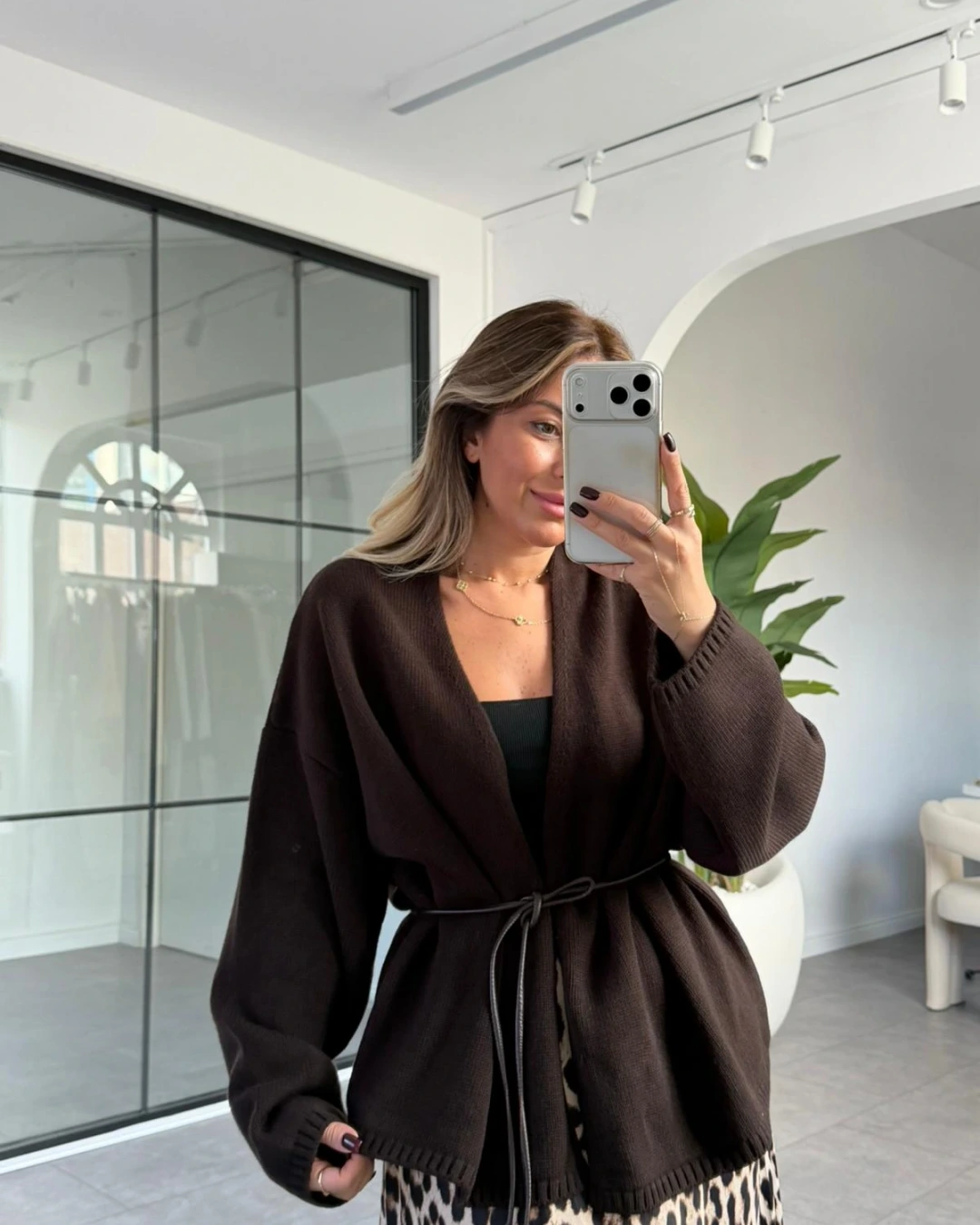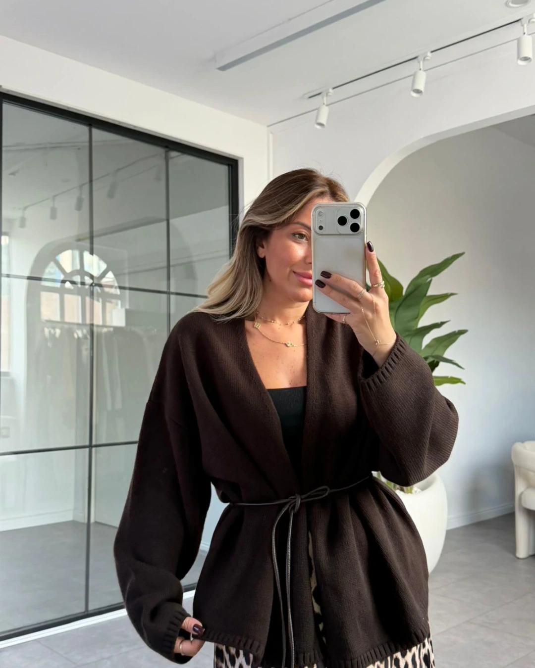 ACI KAHVE DERİ KEMER DETAY TRİKO HIRKA