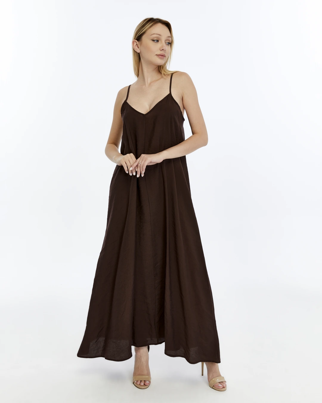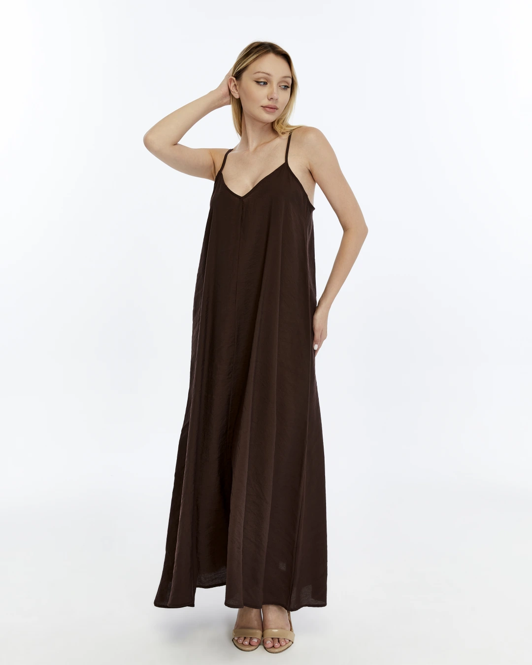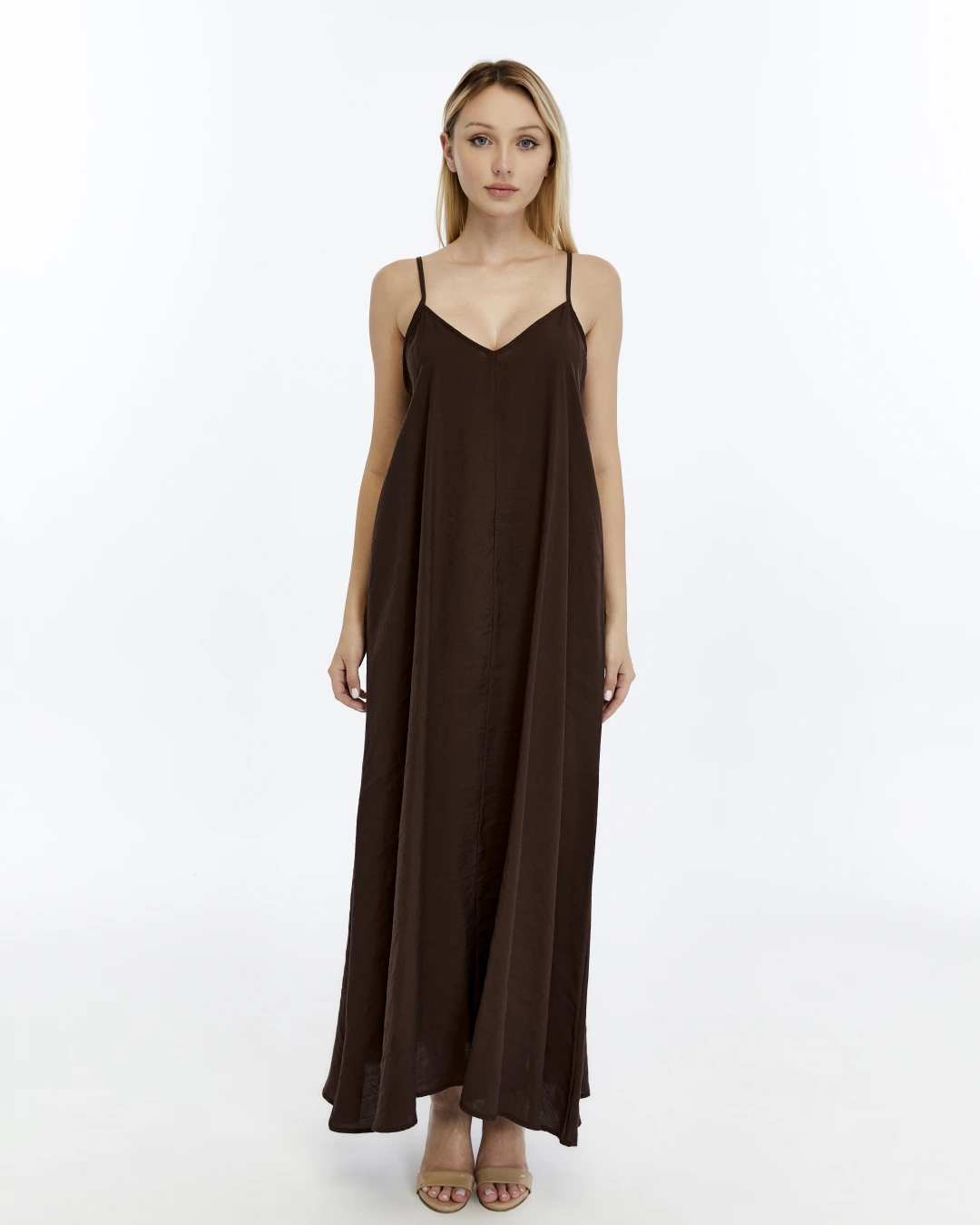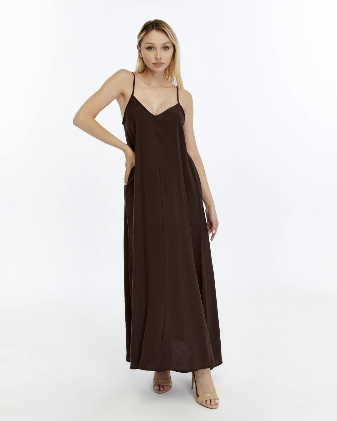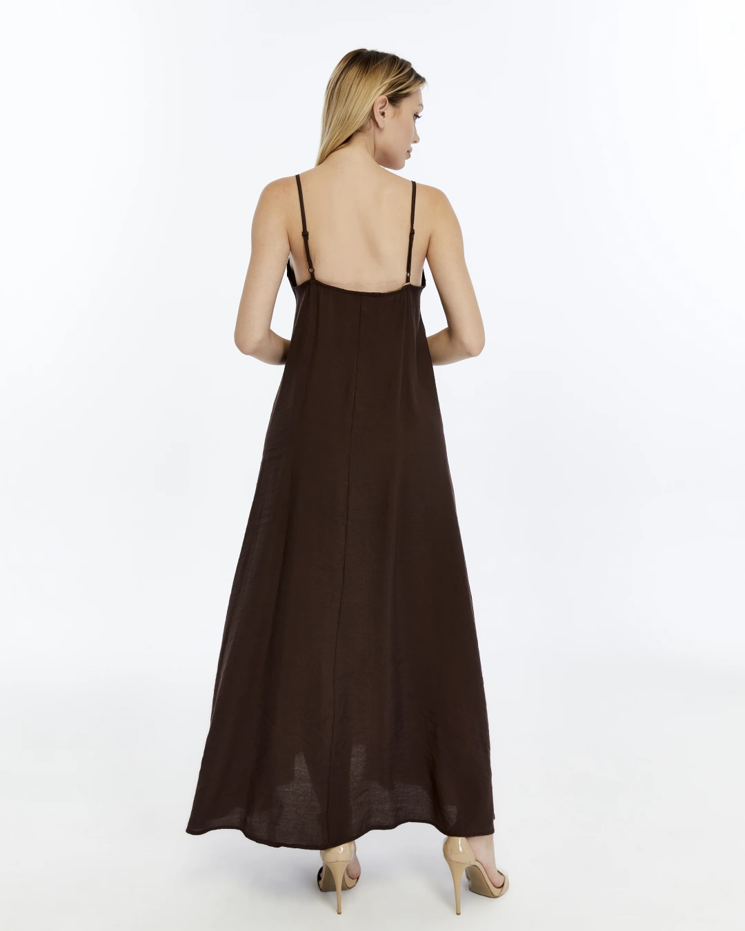 ACI KAHVE V YAKA İP ASKILI ELBİSE