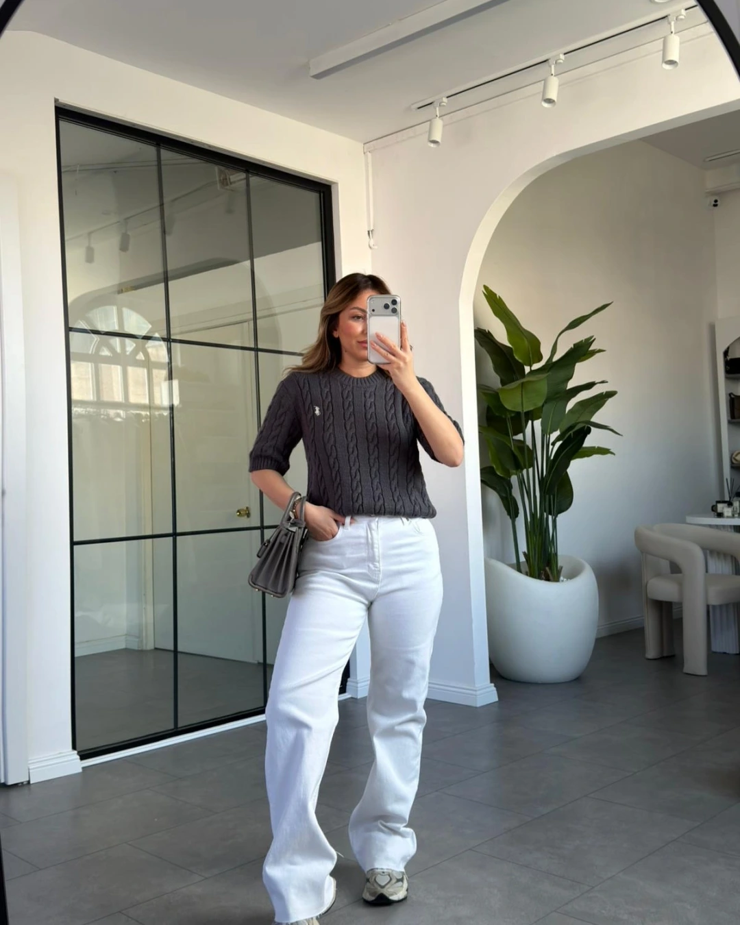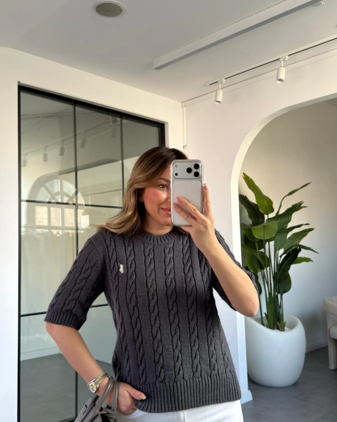 ANTRASİT BİSİKLET YAKA SAÇ ÖRGÜ DESEN KISA KOLLU TRİKO