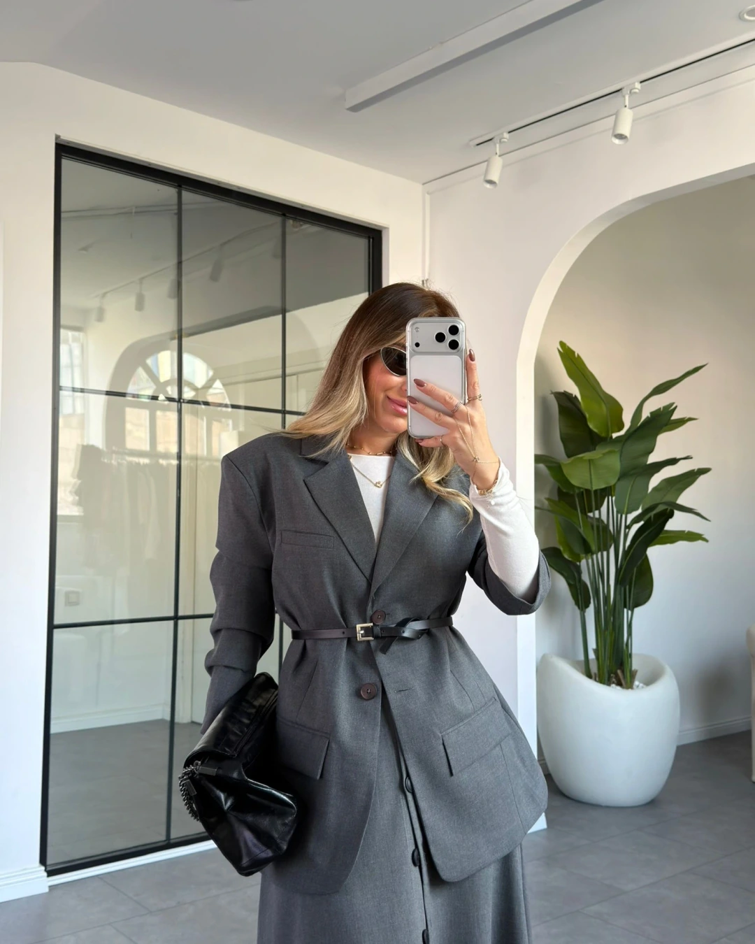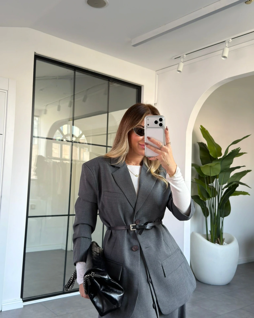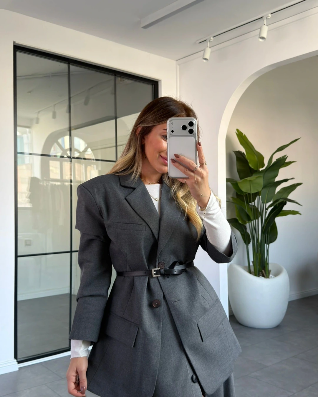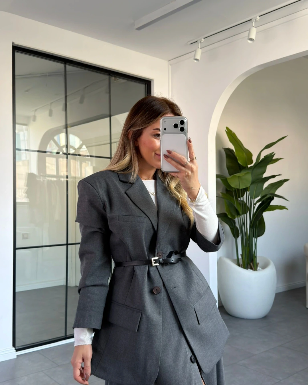 KAHVE KEMERLİ BLAZER KAŞE CEKET