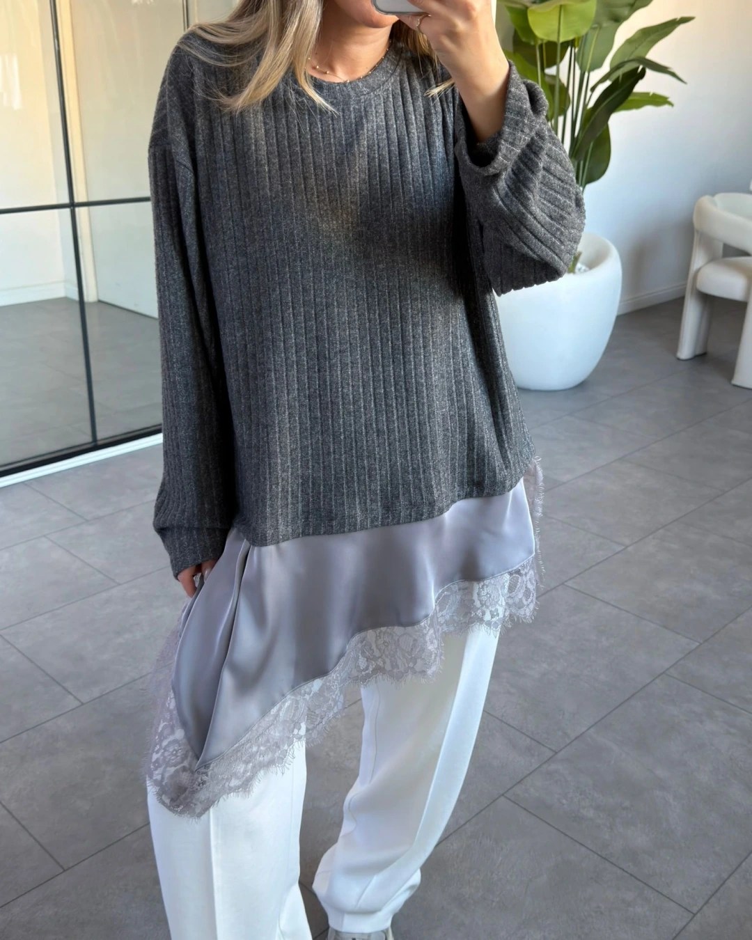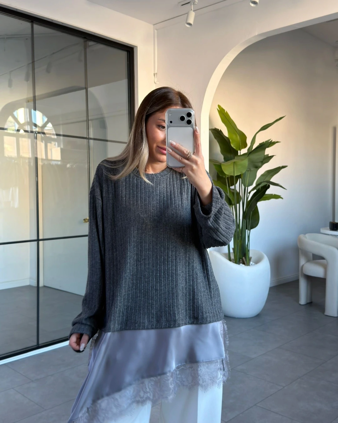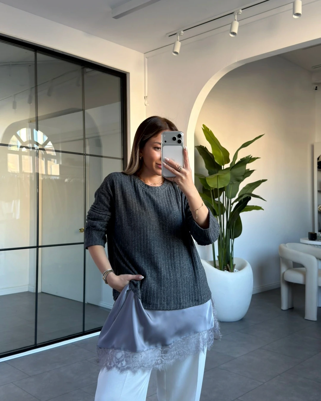 ANTRASİT DANTEL DETAY TRİKO BLUZ
