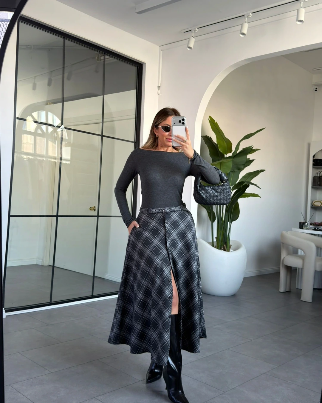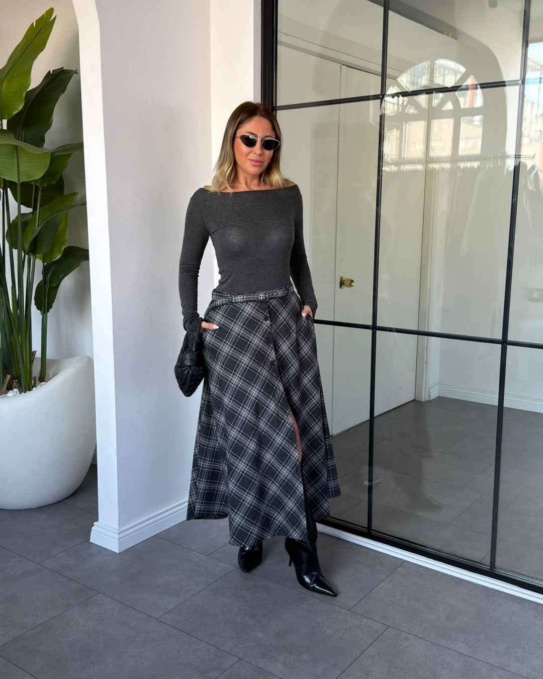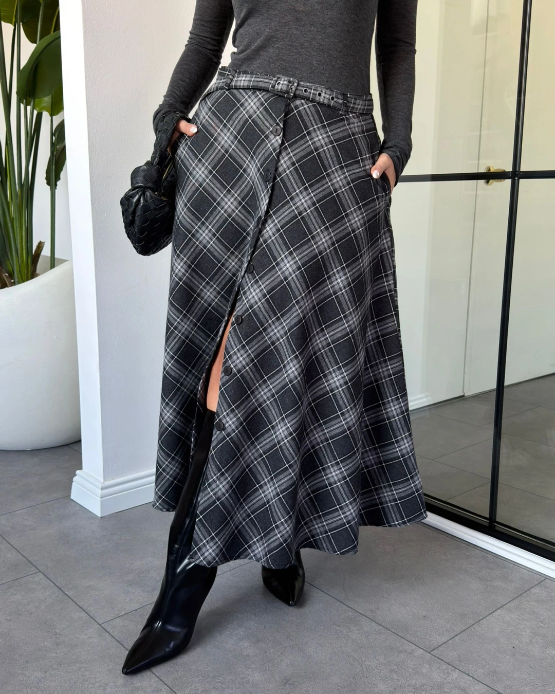 ANTRASİT KEMERLİ ÖNÜ DÜĞMELİ EKOSE ETEK