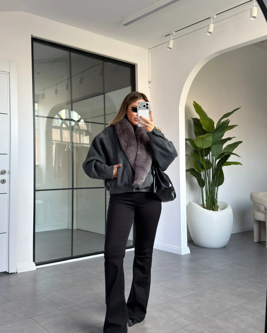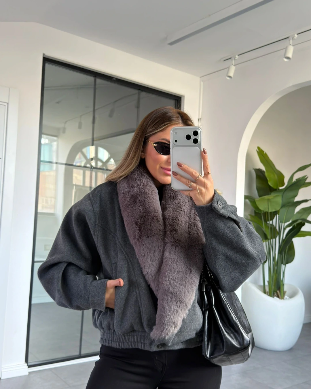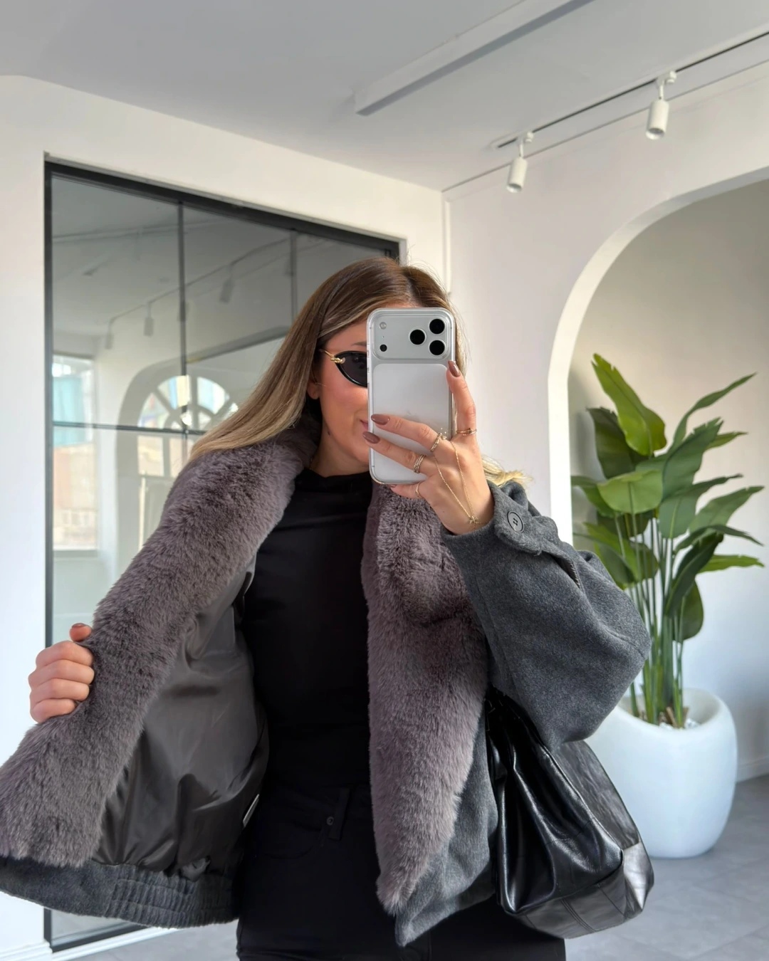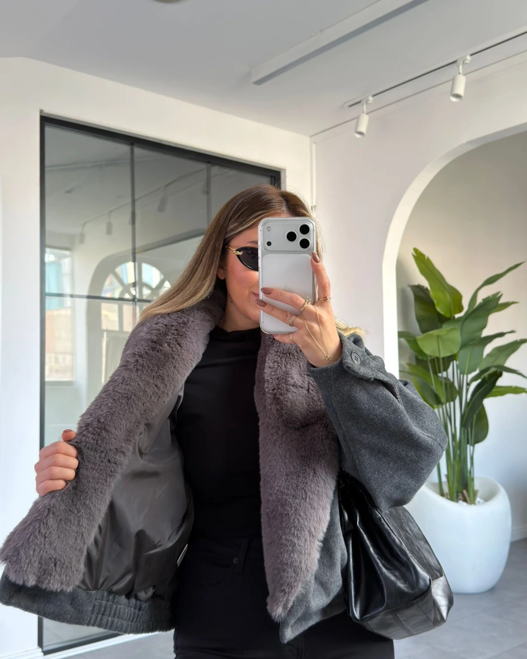 ANTRASİT KRUVAZE YAKA KÜRKLÜ KISA KAŞE MONT