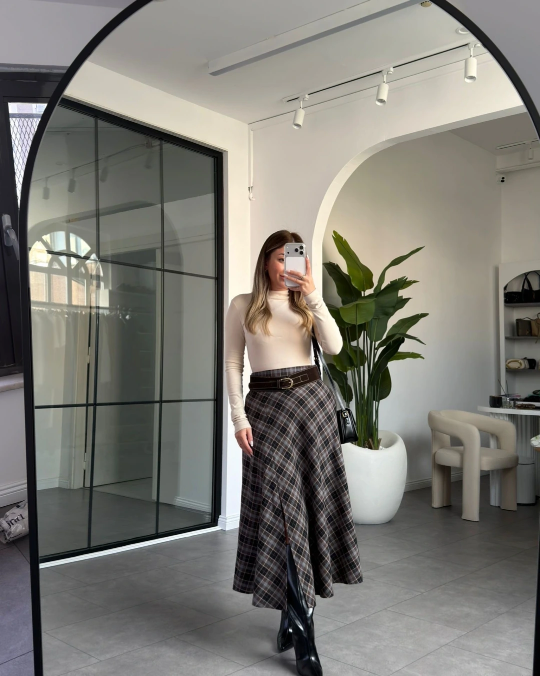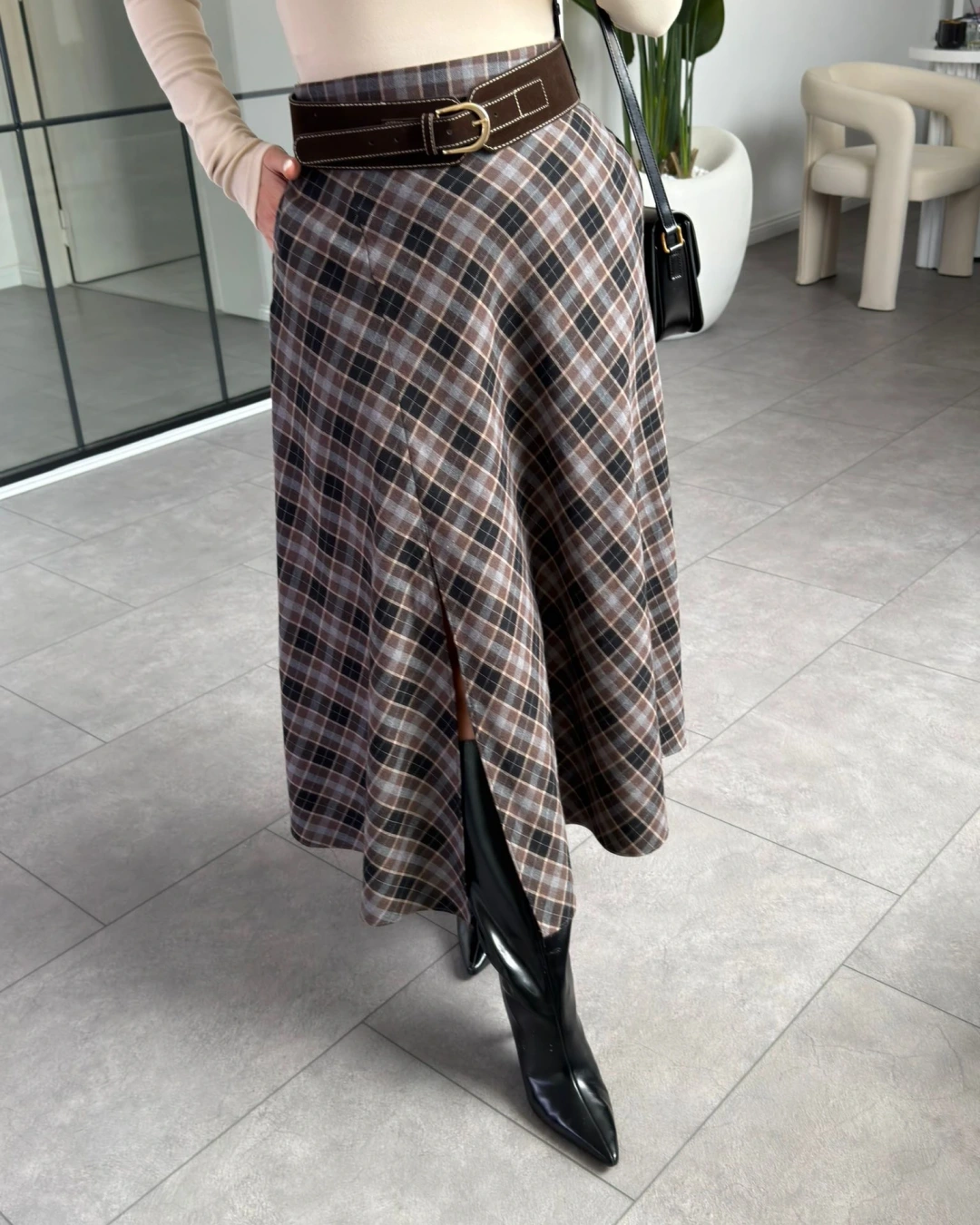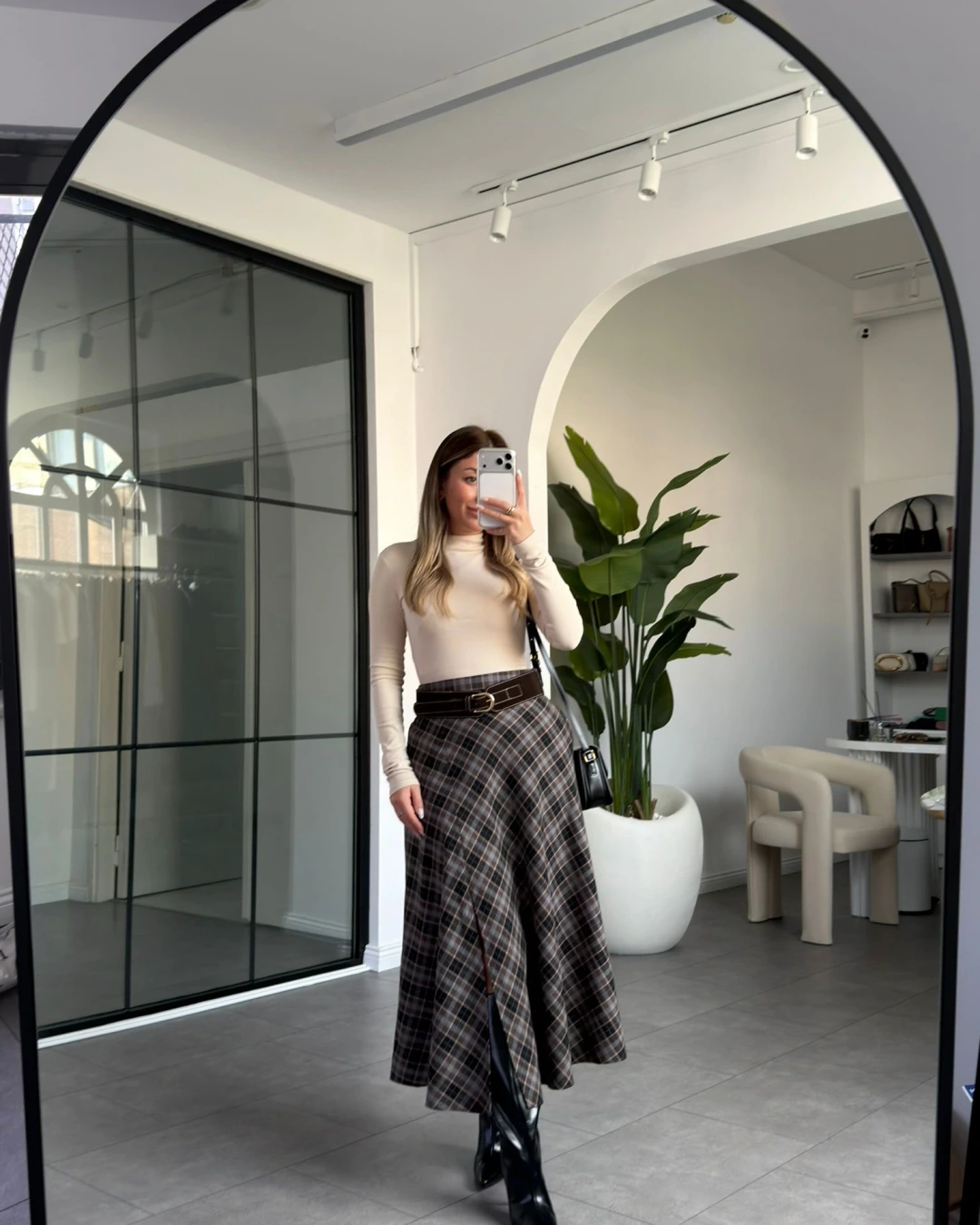 ANTRASİT MAVİ YIRTMAÇ DETAY KEMERLİ EKOSE ETEK