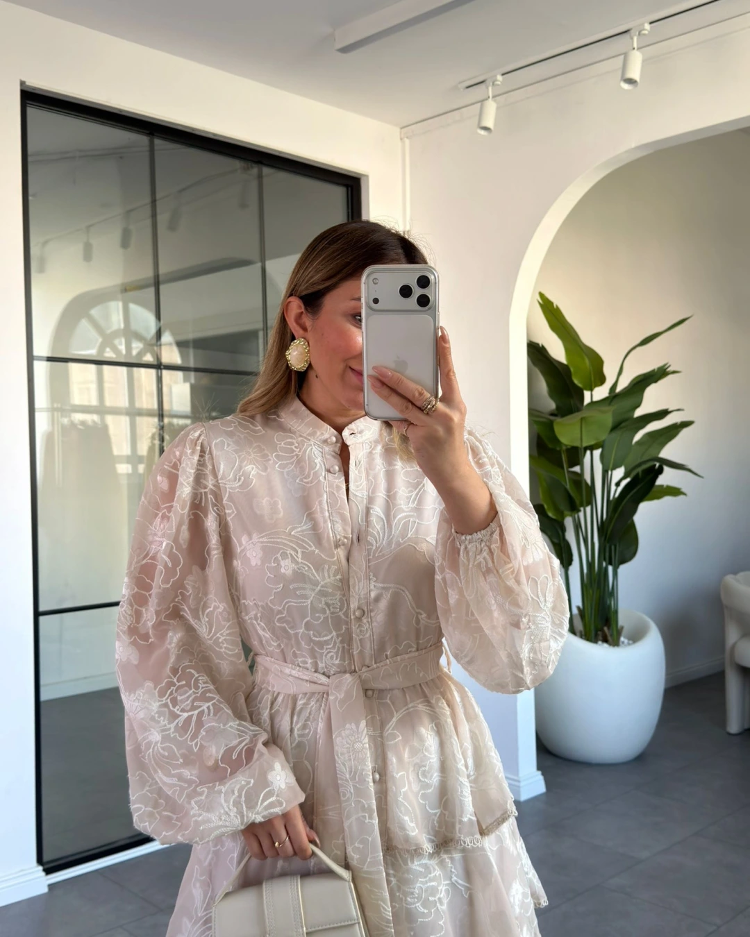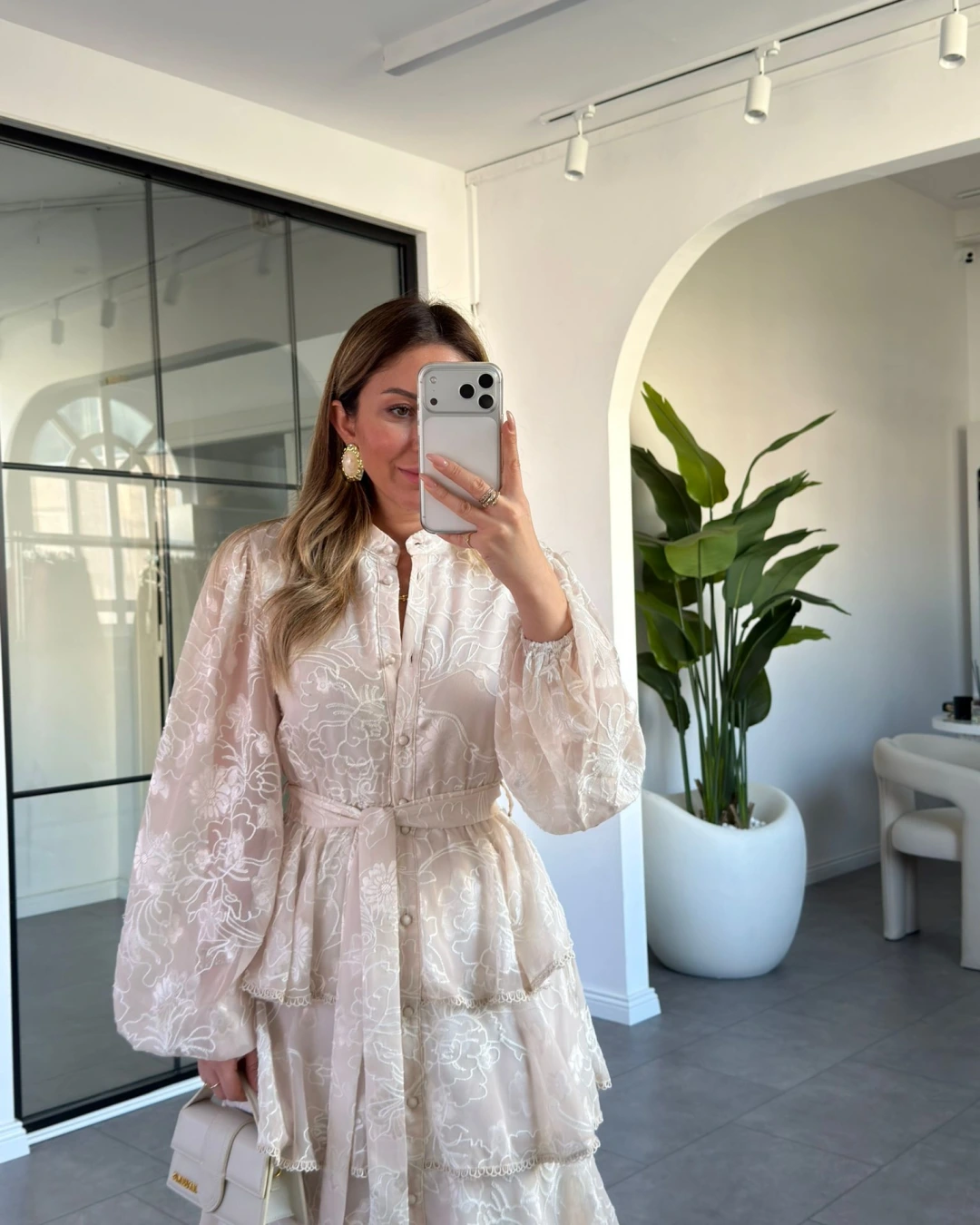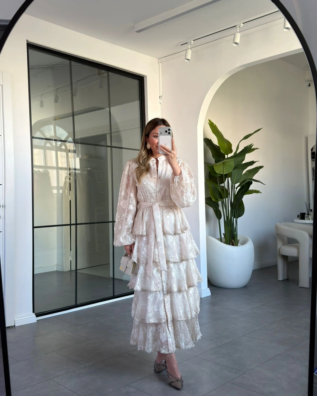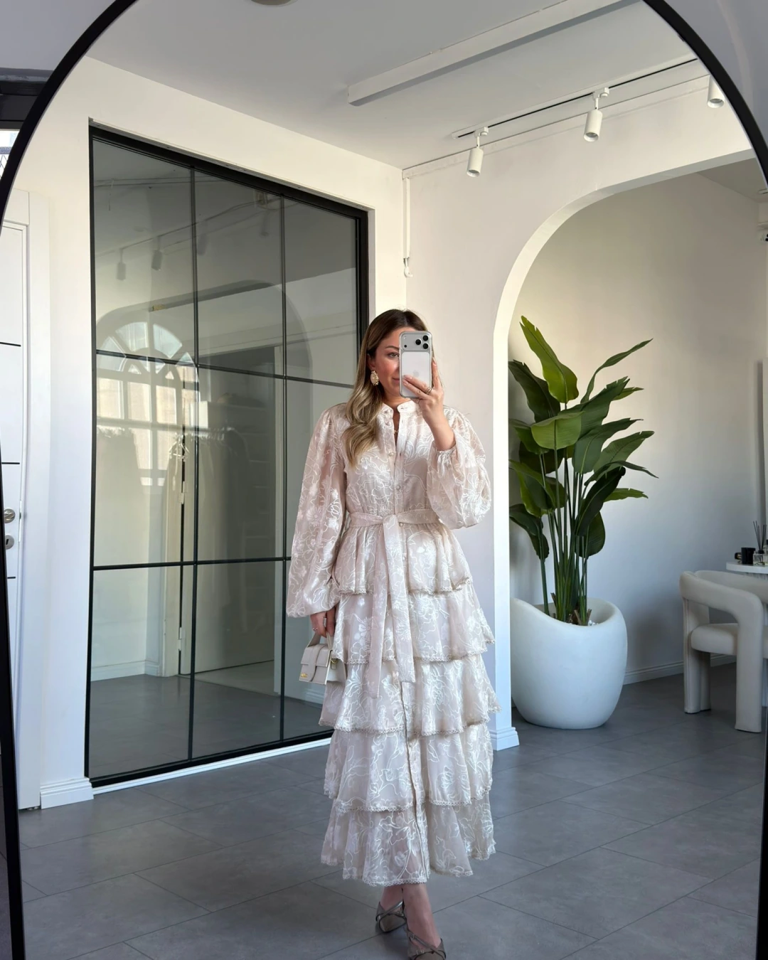 BEJ ÇİÇEK DESENLİ FIRFIRLI ELBİSE 9702