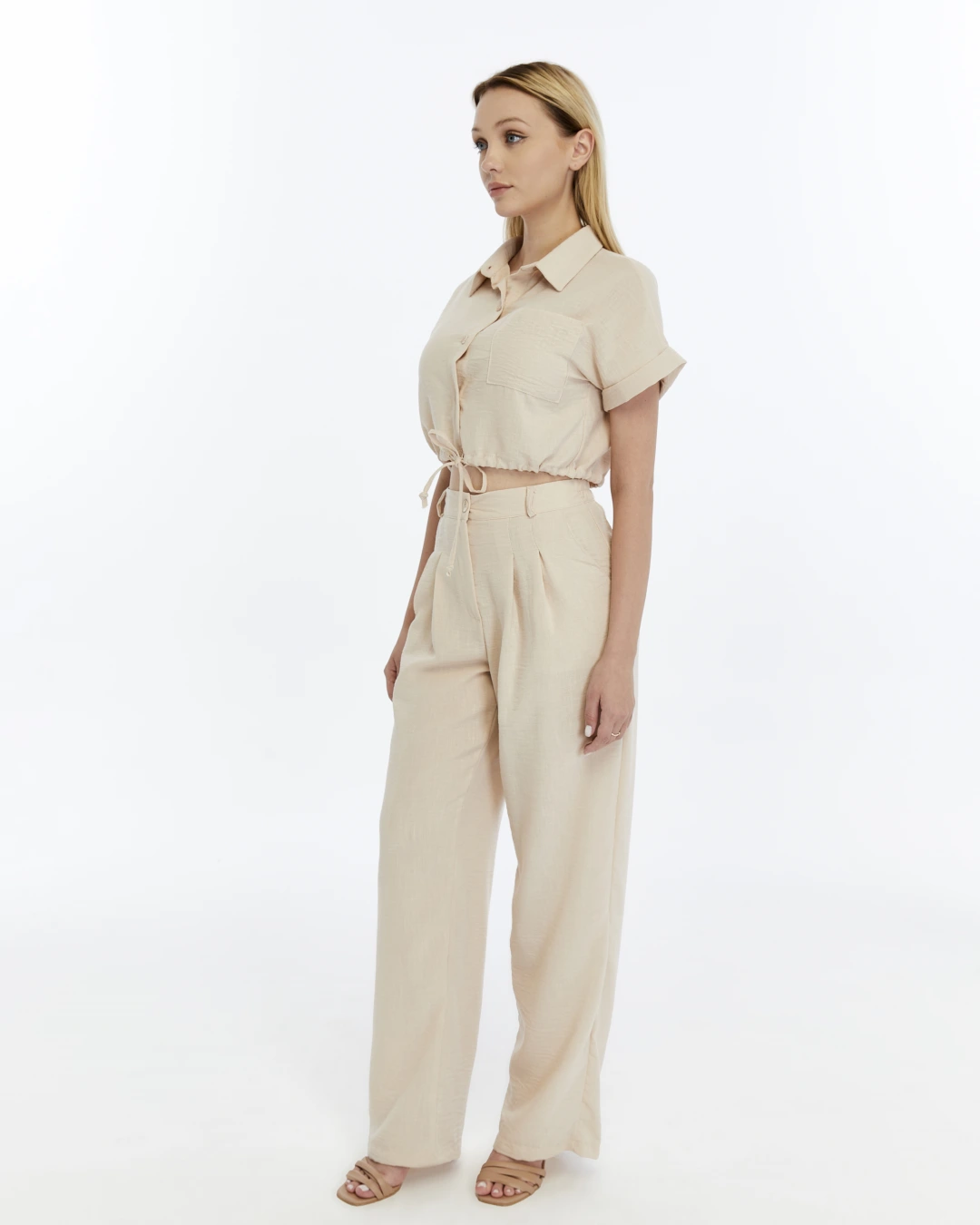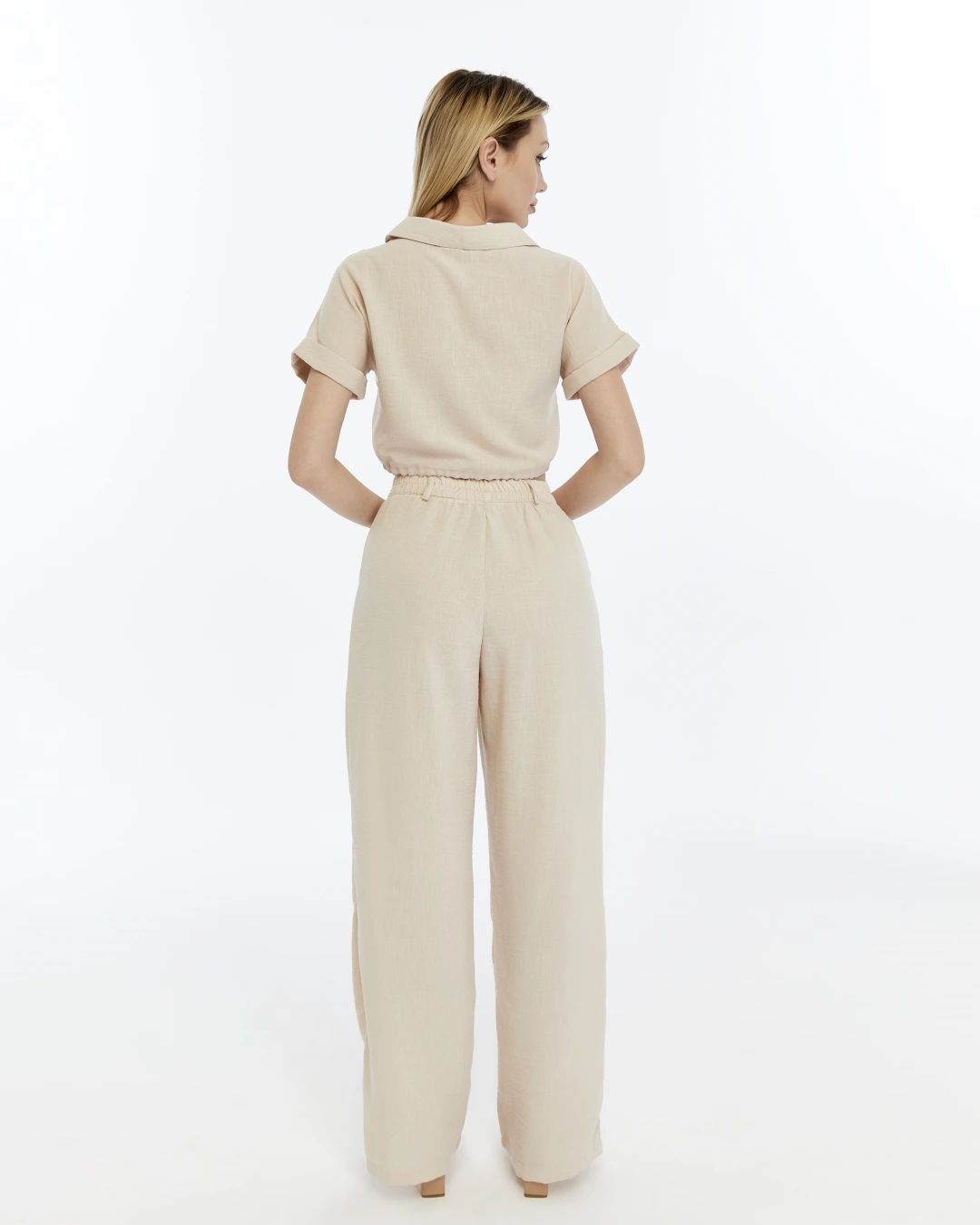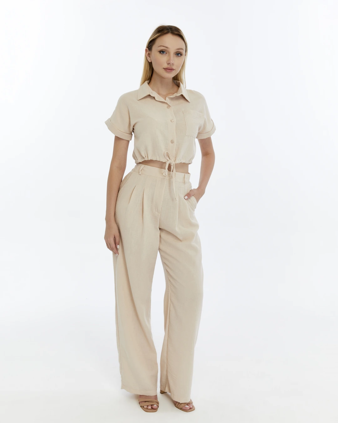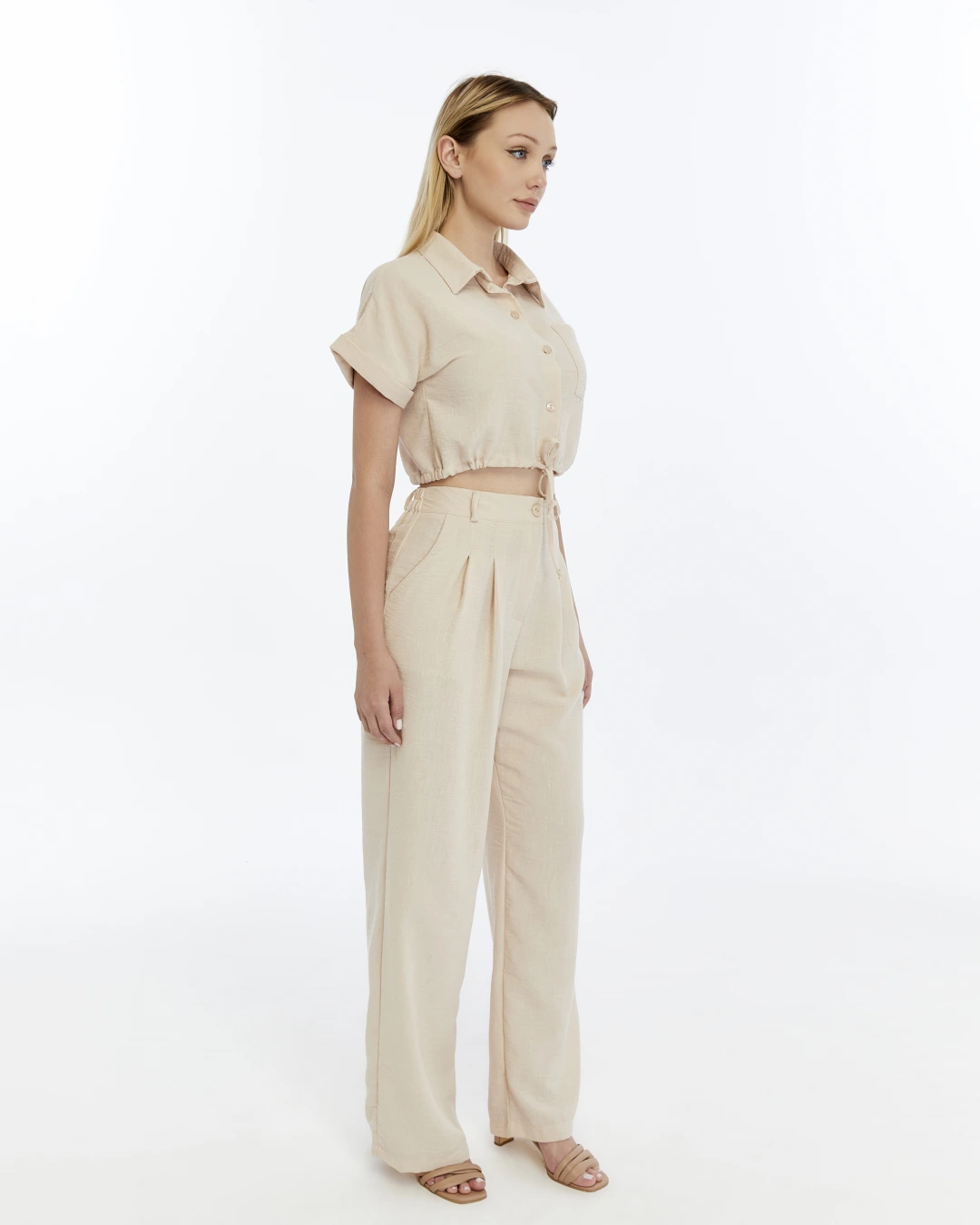 BEJ CROP KETEN PANTALON TAKIM