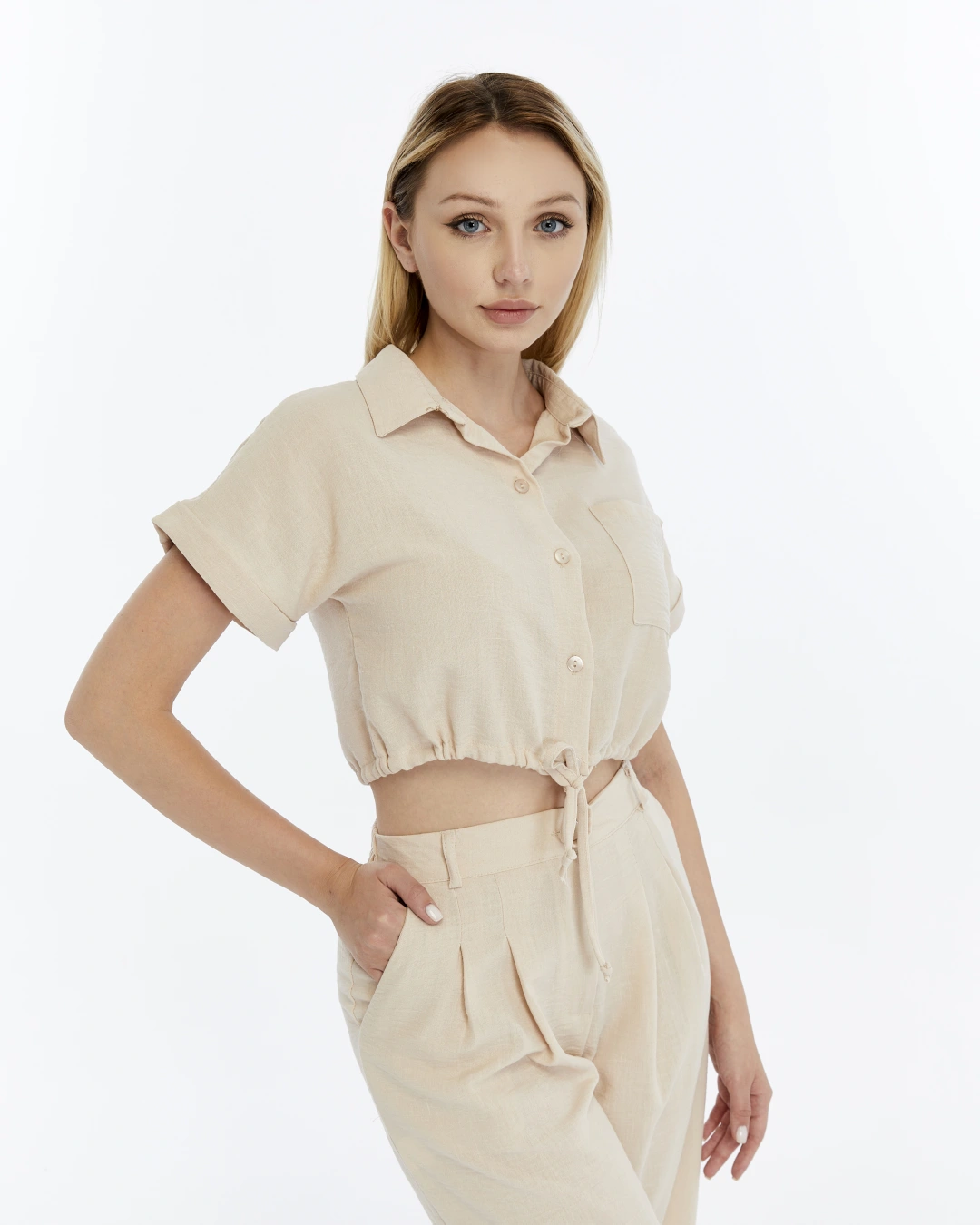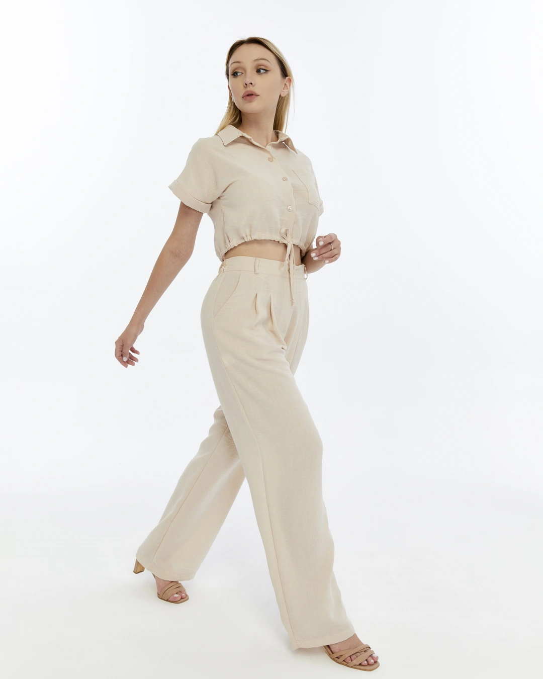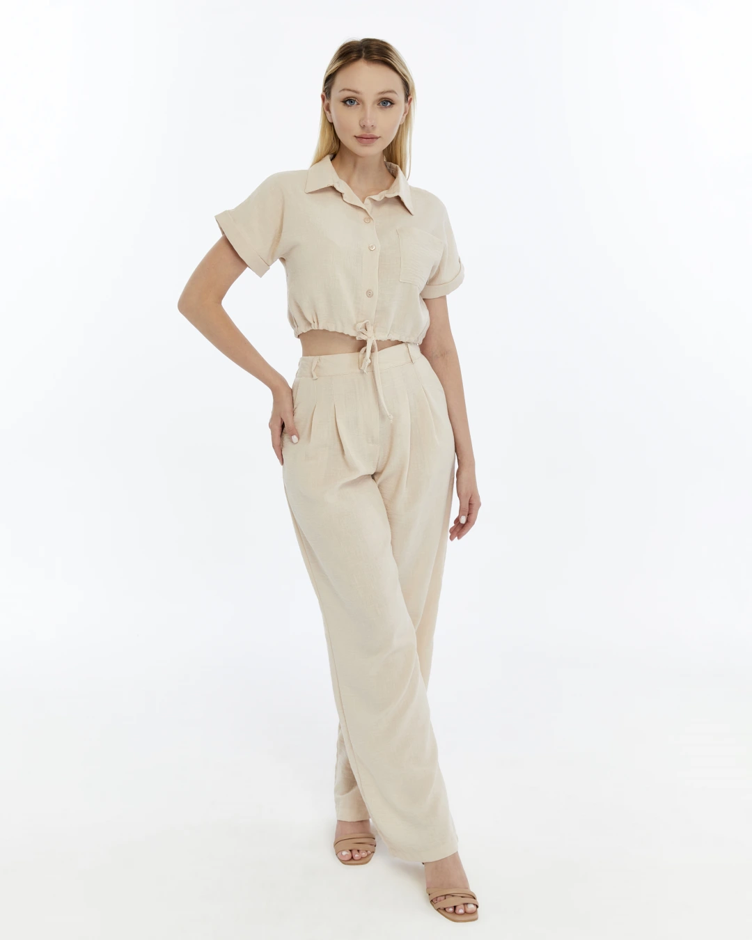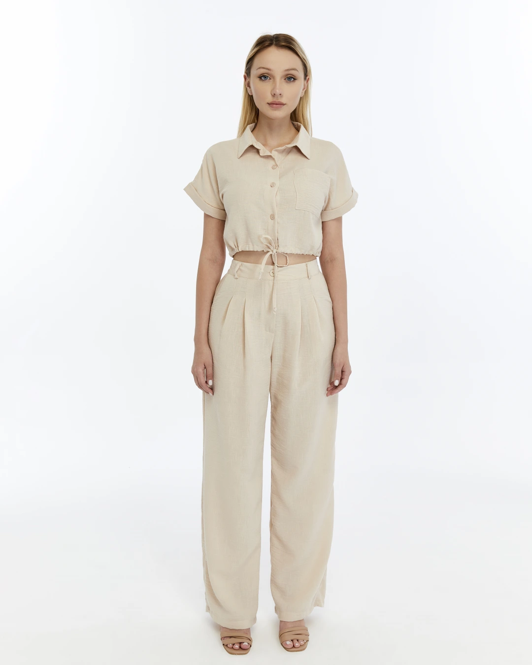 BEJ CROP KETEN PANTALON TAKIM