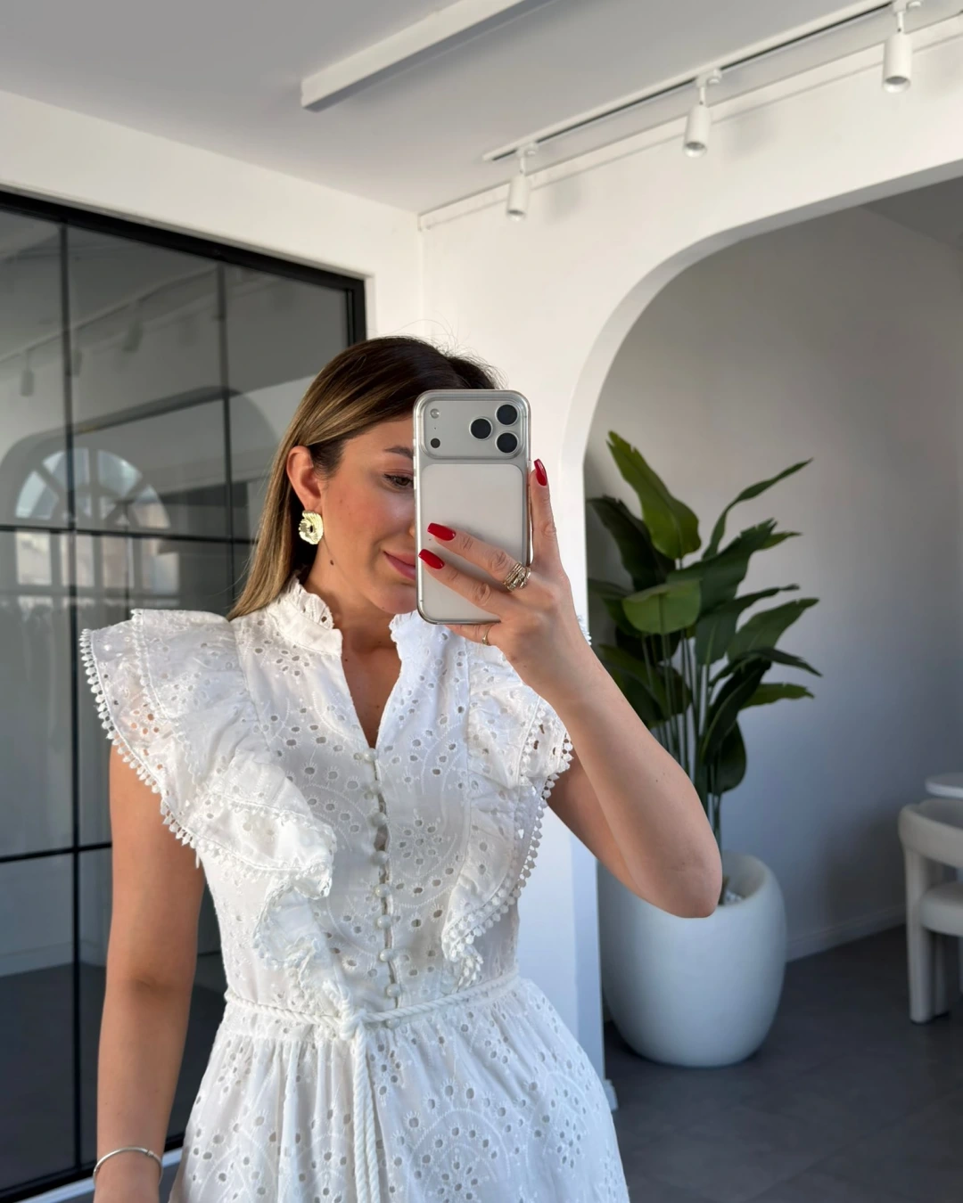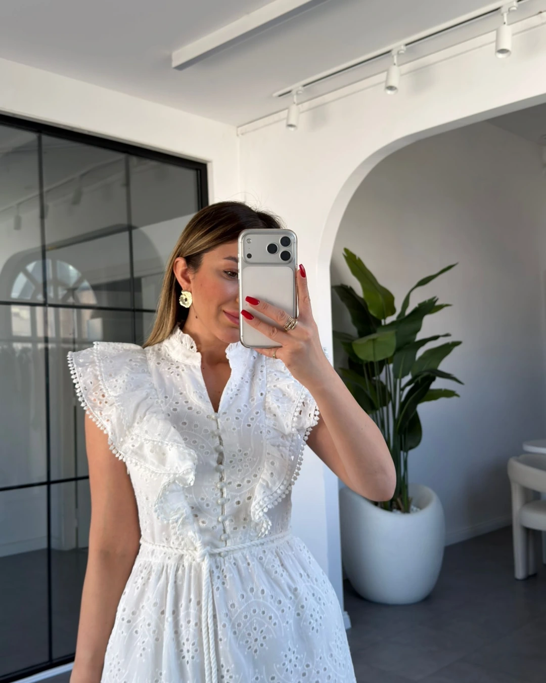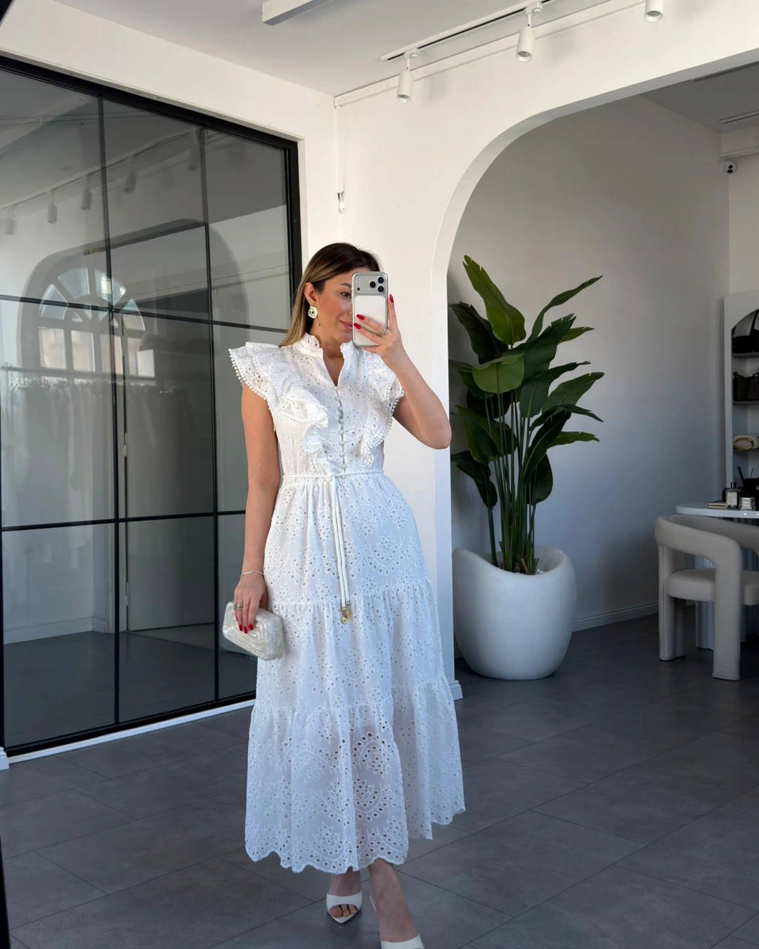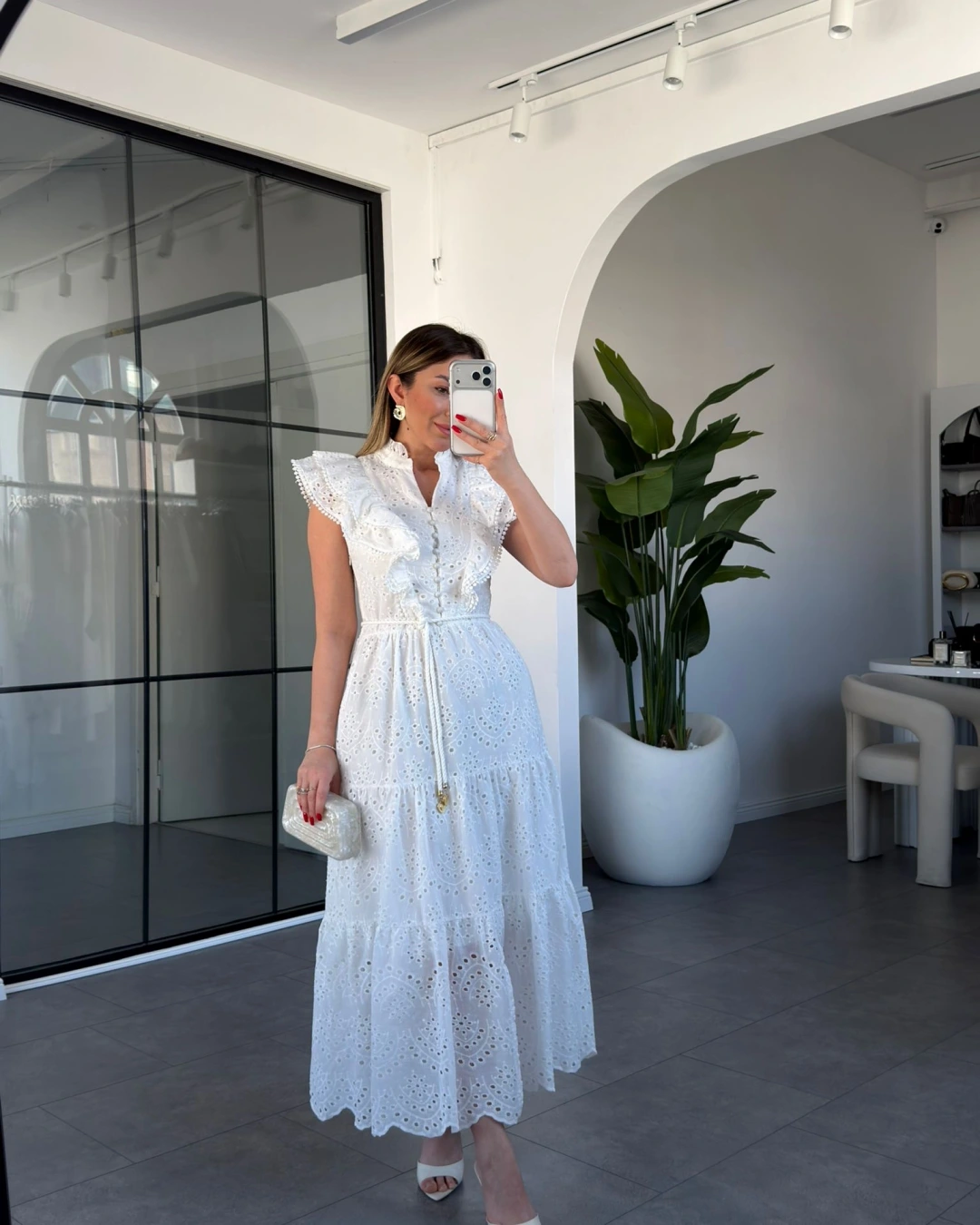 Beyaz Fırfır Detaylı Düğmeli Elbise