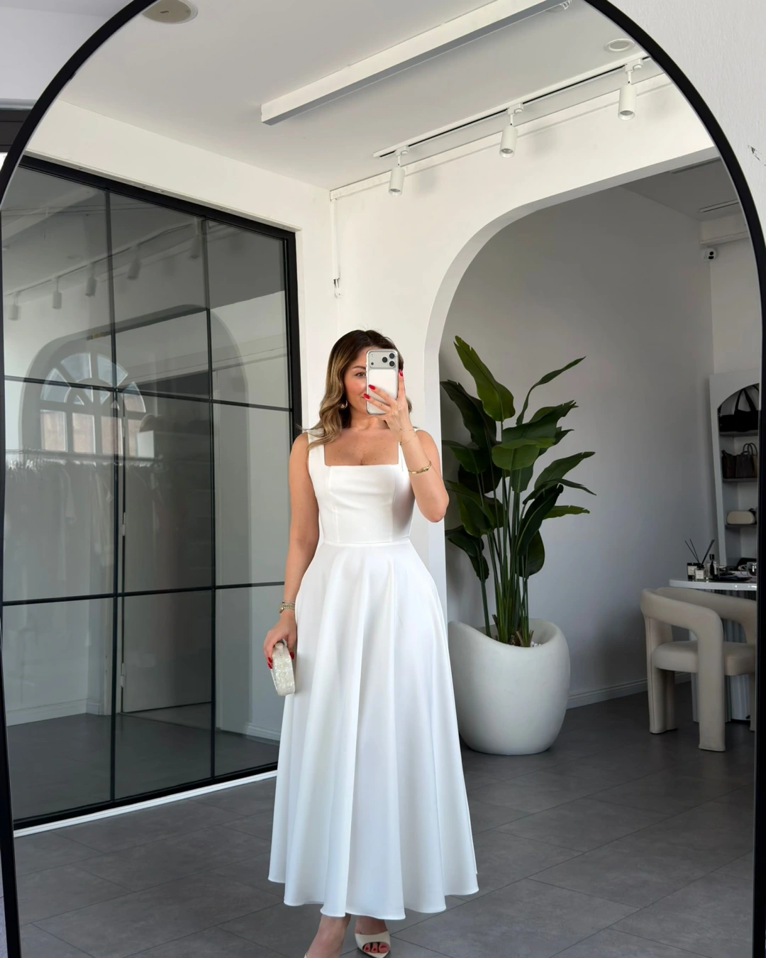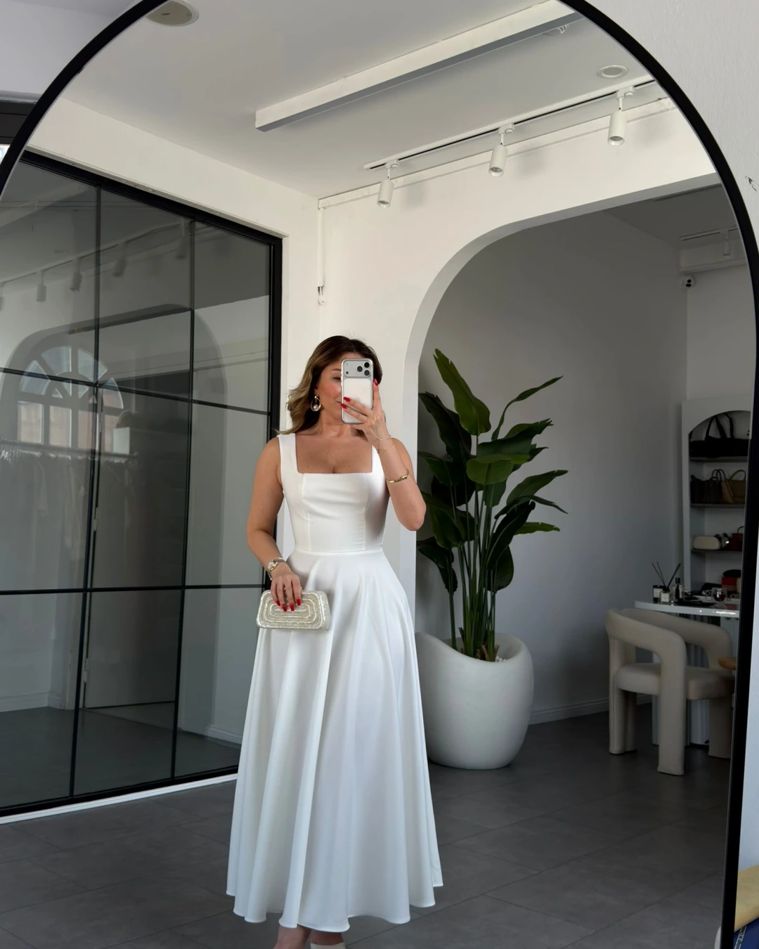 BEYAZ KALIN ASKILI KARE YAKA ELBİSE