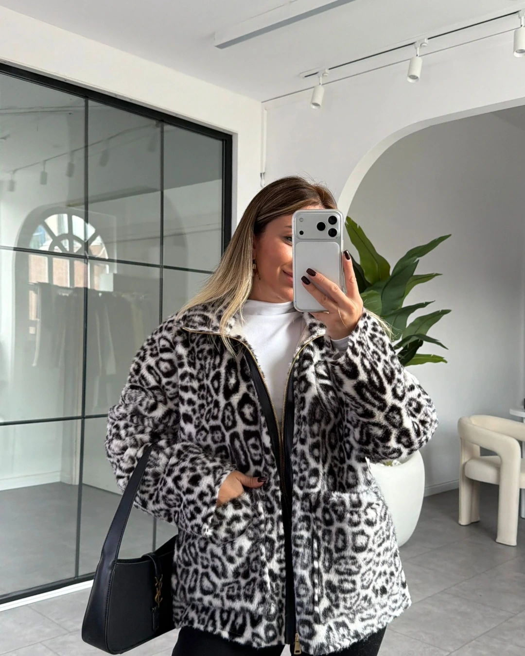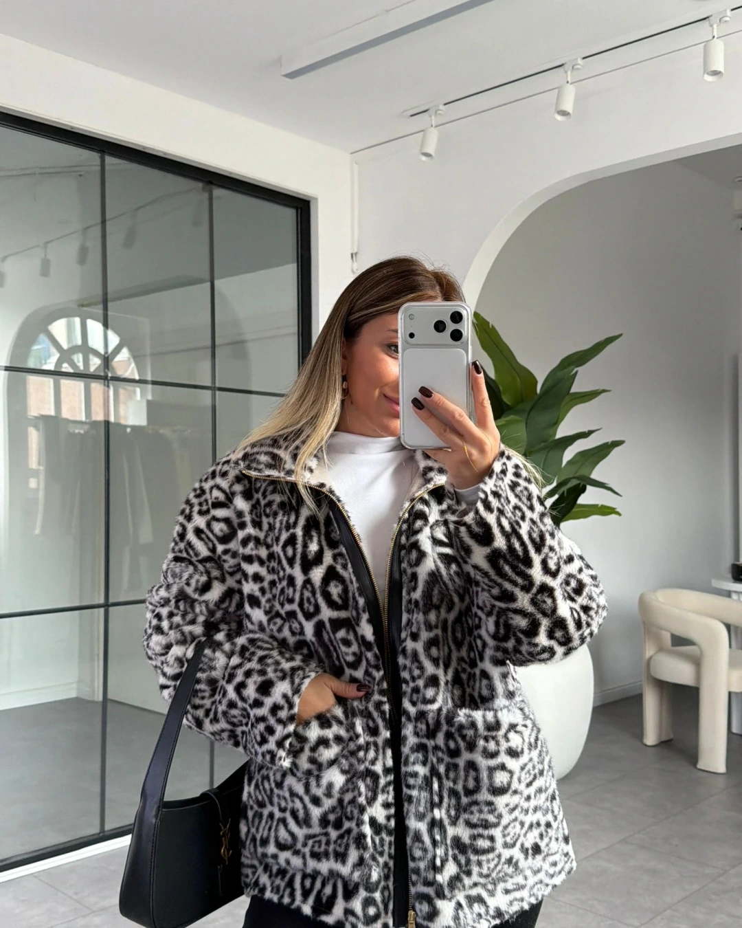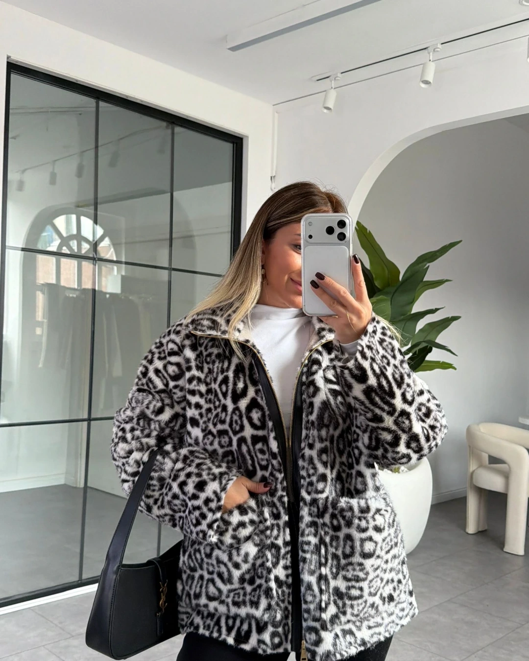 BEYAZ LEOPAR DESEN FERMUARLI KÜRK CEKET