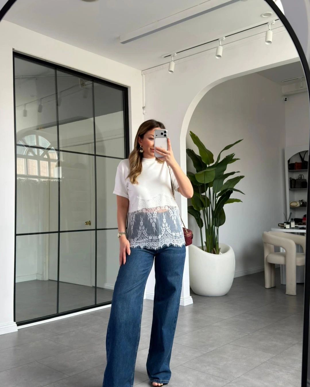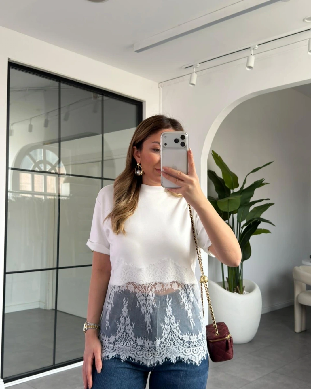 BEYAZ MODAL DANTELLİ CROP T-SHIRT 1074