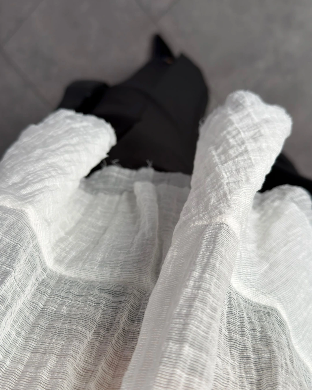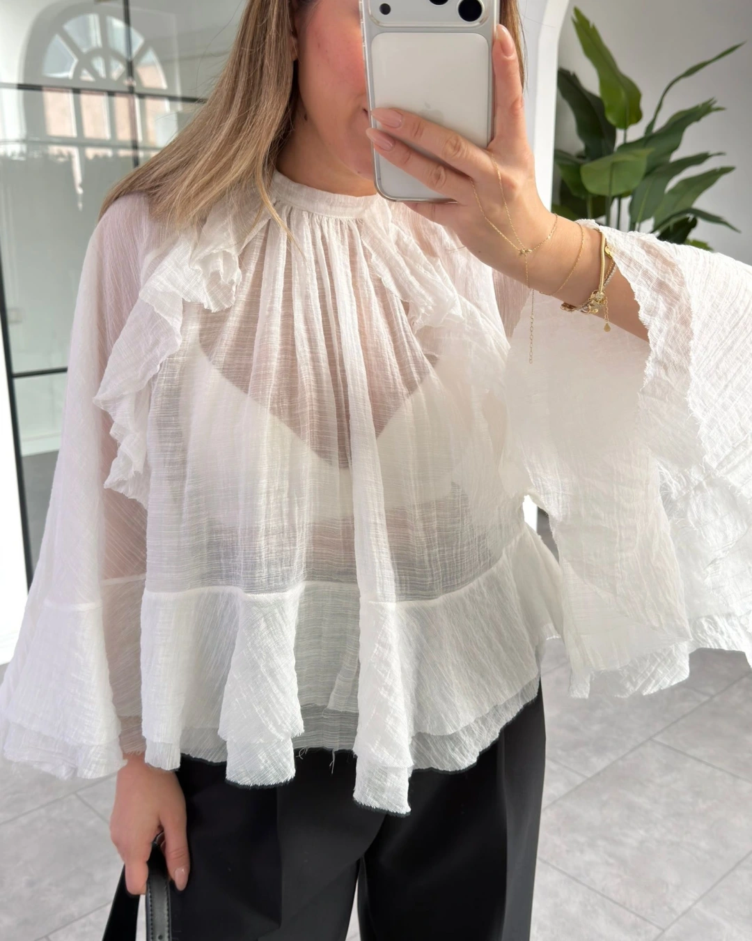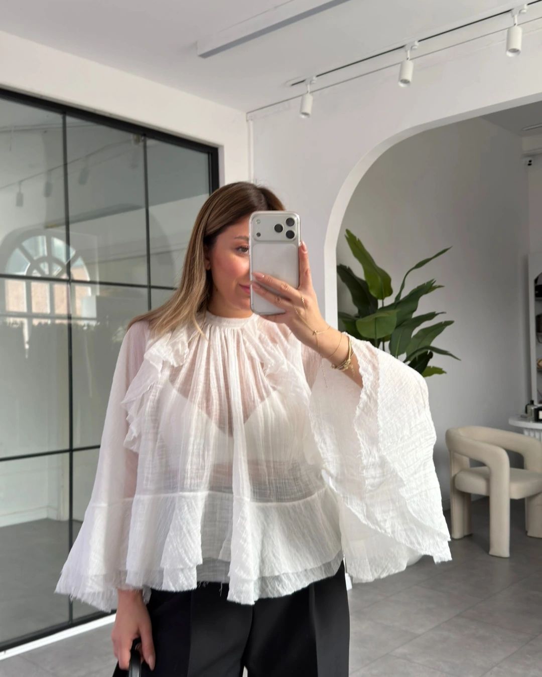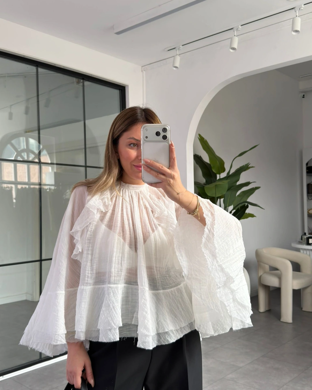 BEYAZ VOLANLI BOYUNDAN BAĞLAMALI BLUZ