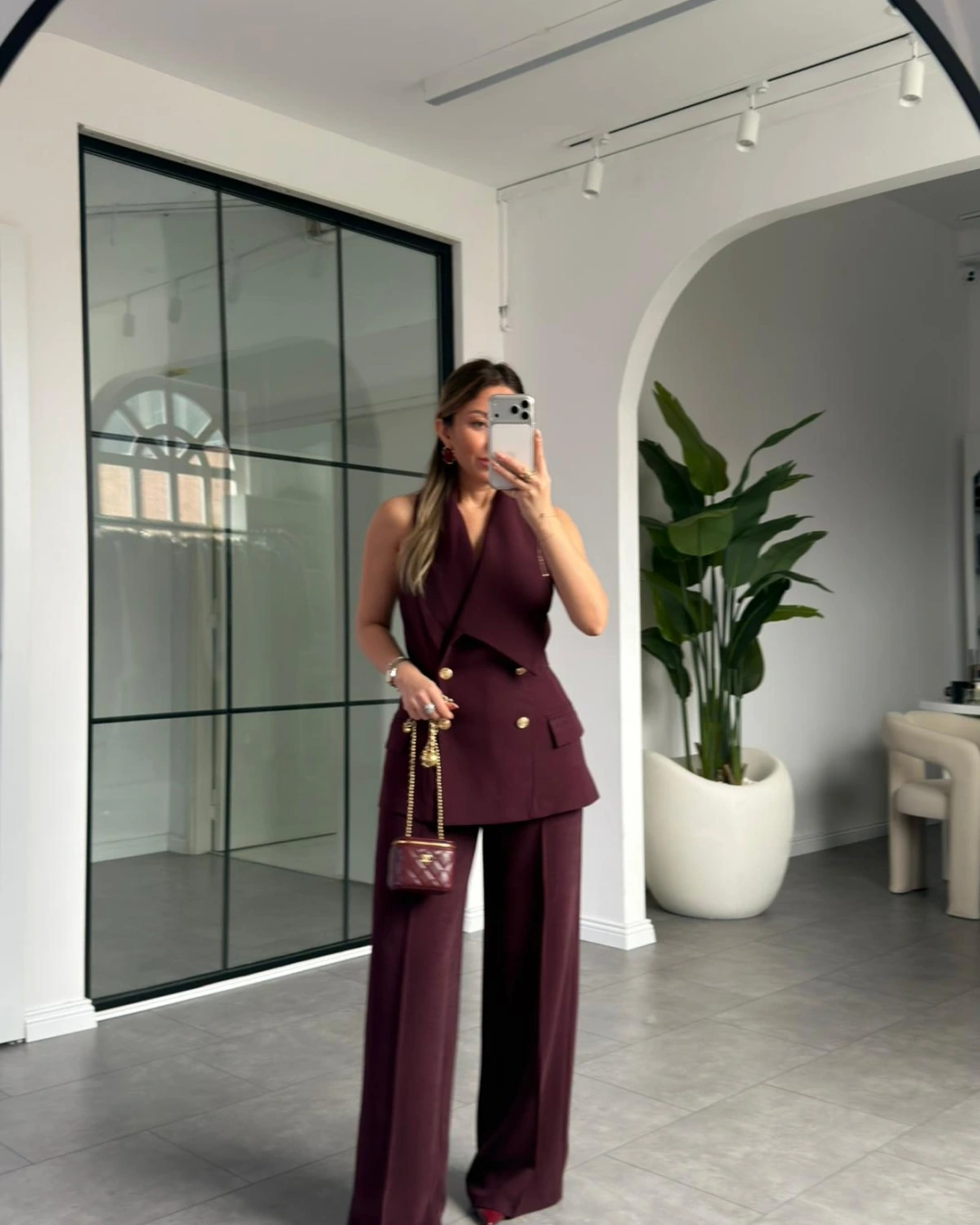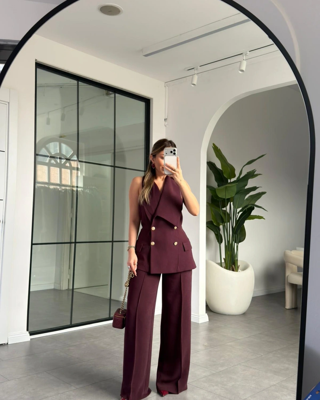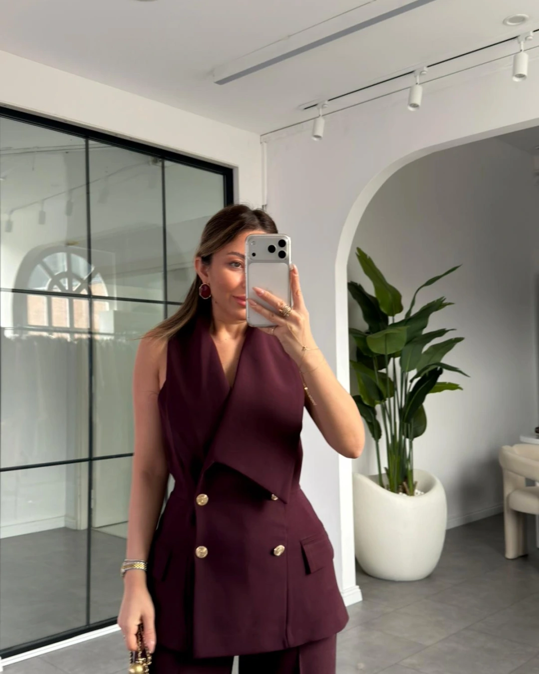 BORDO ASİMETRİK YAKA GOLD DÜĞMELİ YELEK PANTOLON TAKIM