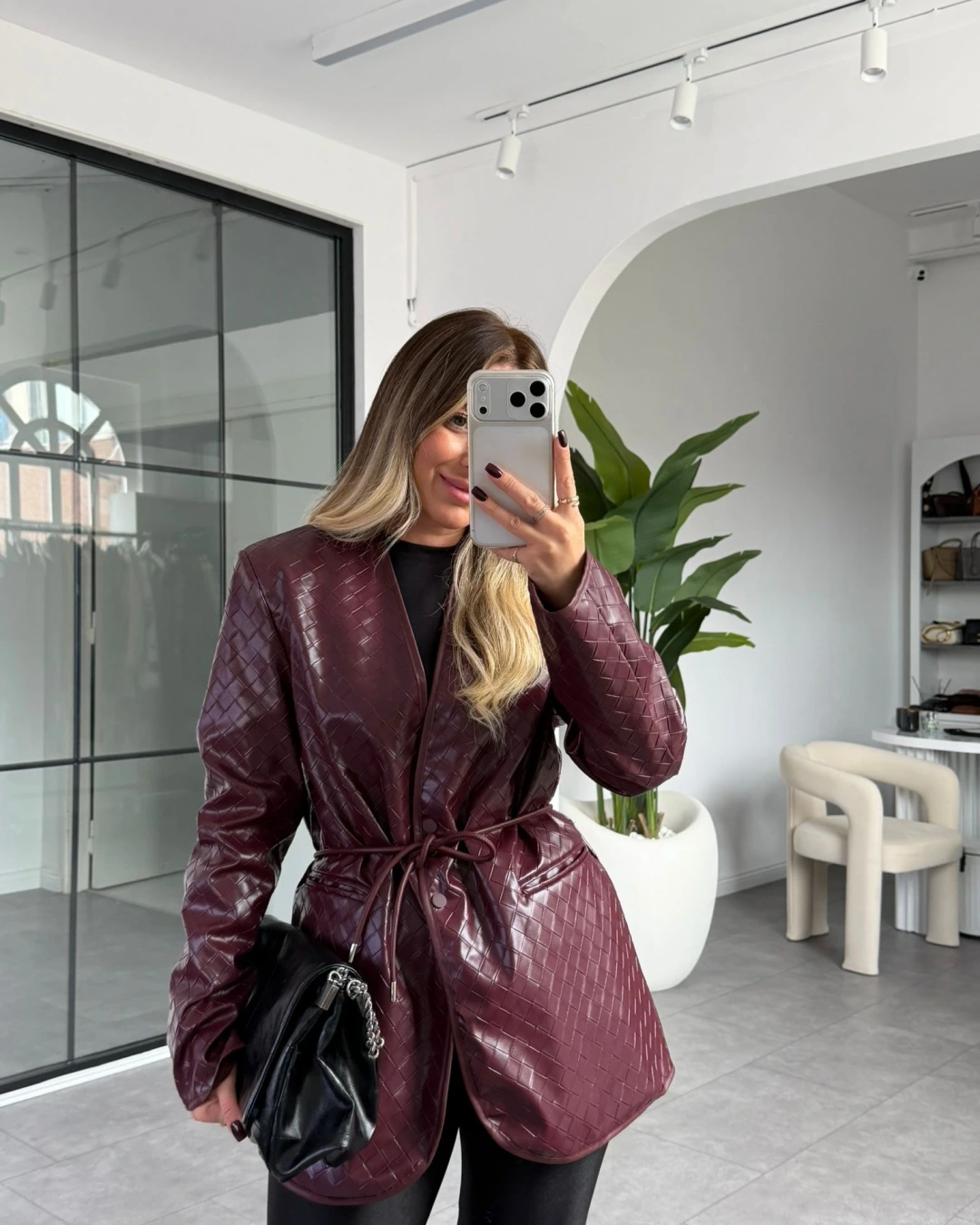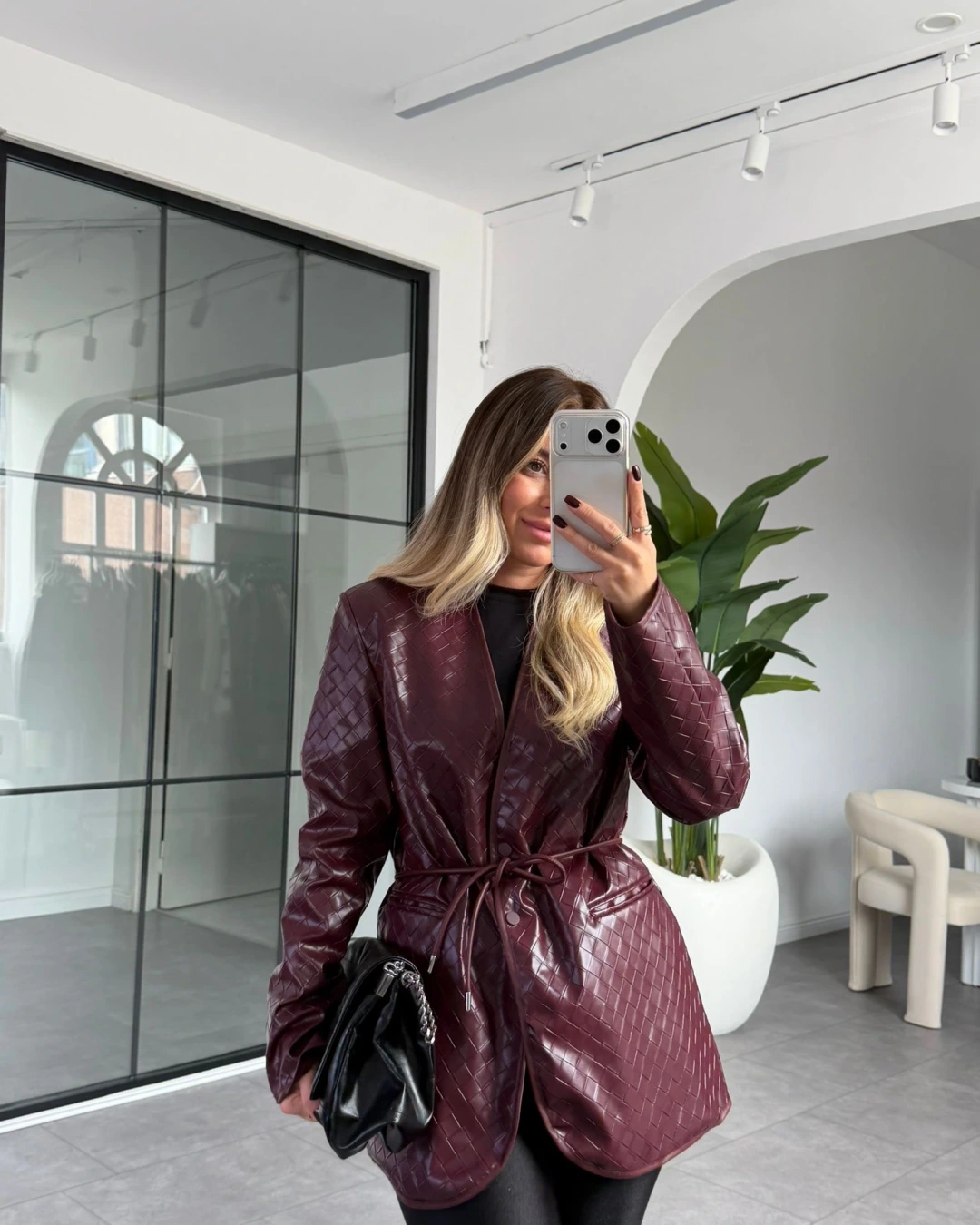 BORDO KAPİTONE KUŞAKLI DERİ CEKET
