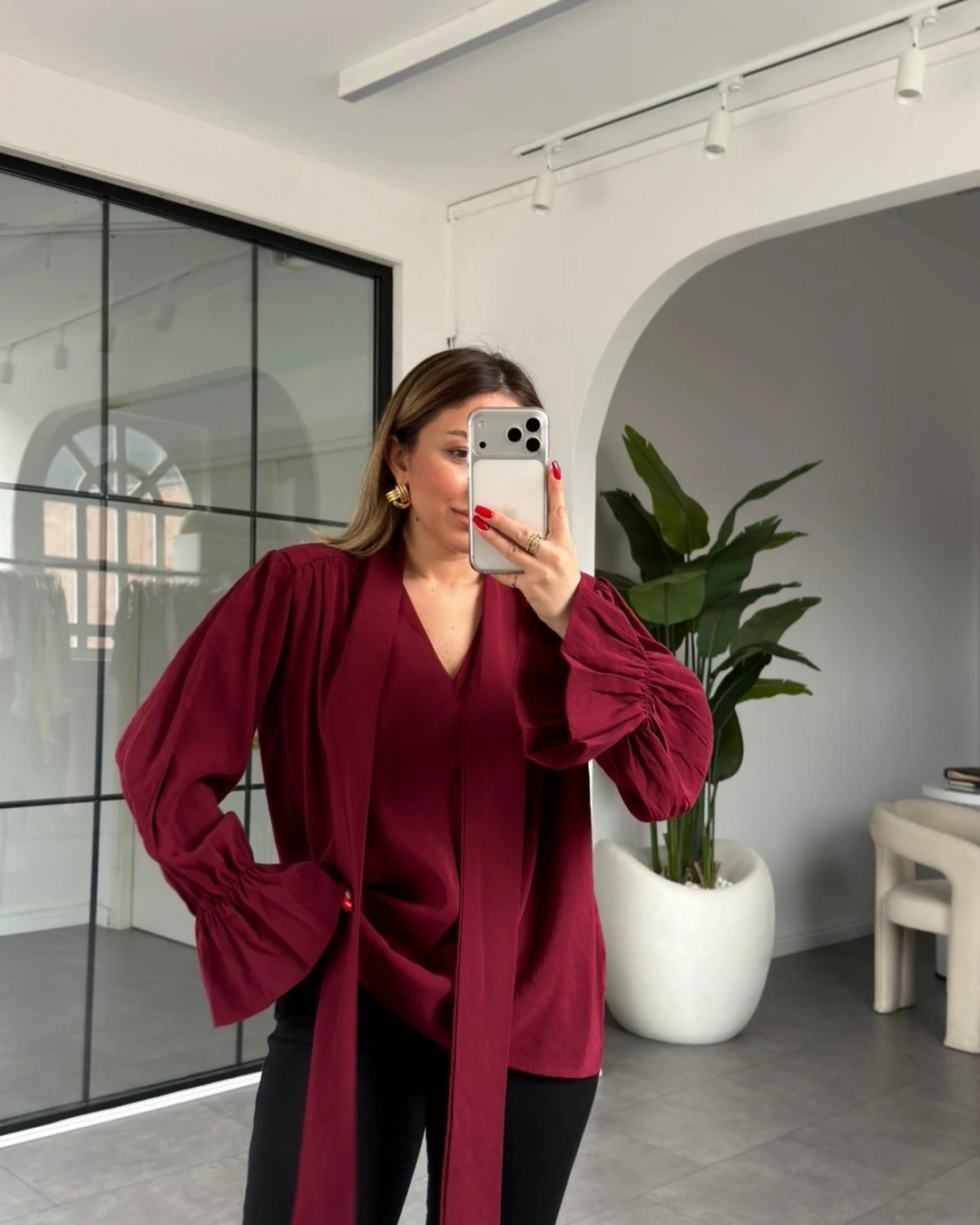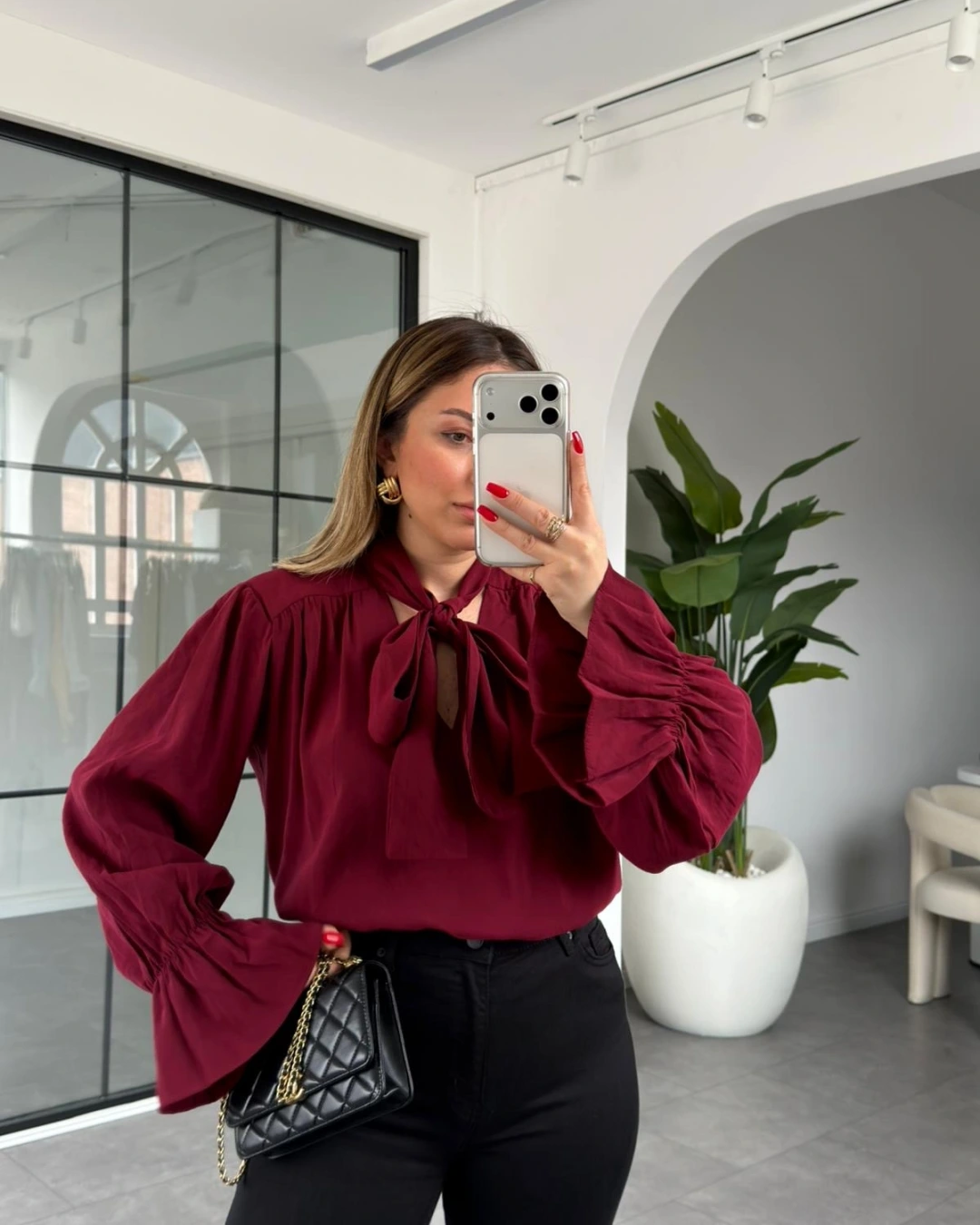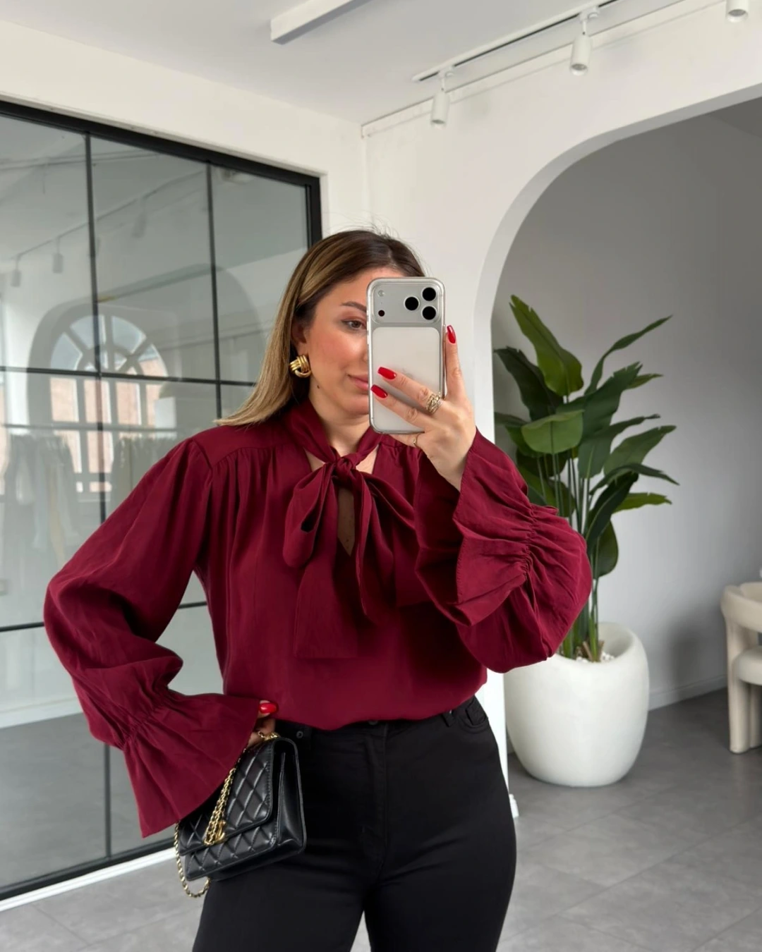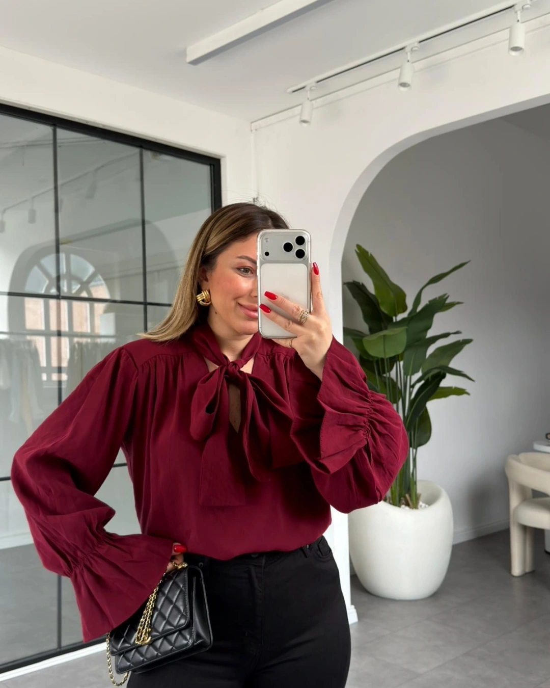 BORDO YAKASI BAĞLAMALI VATKALI BLUZ 1016