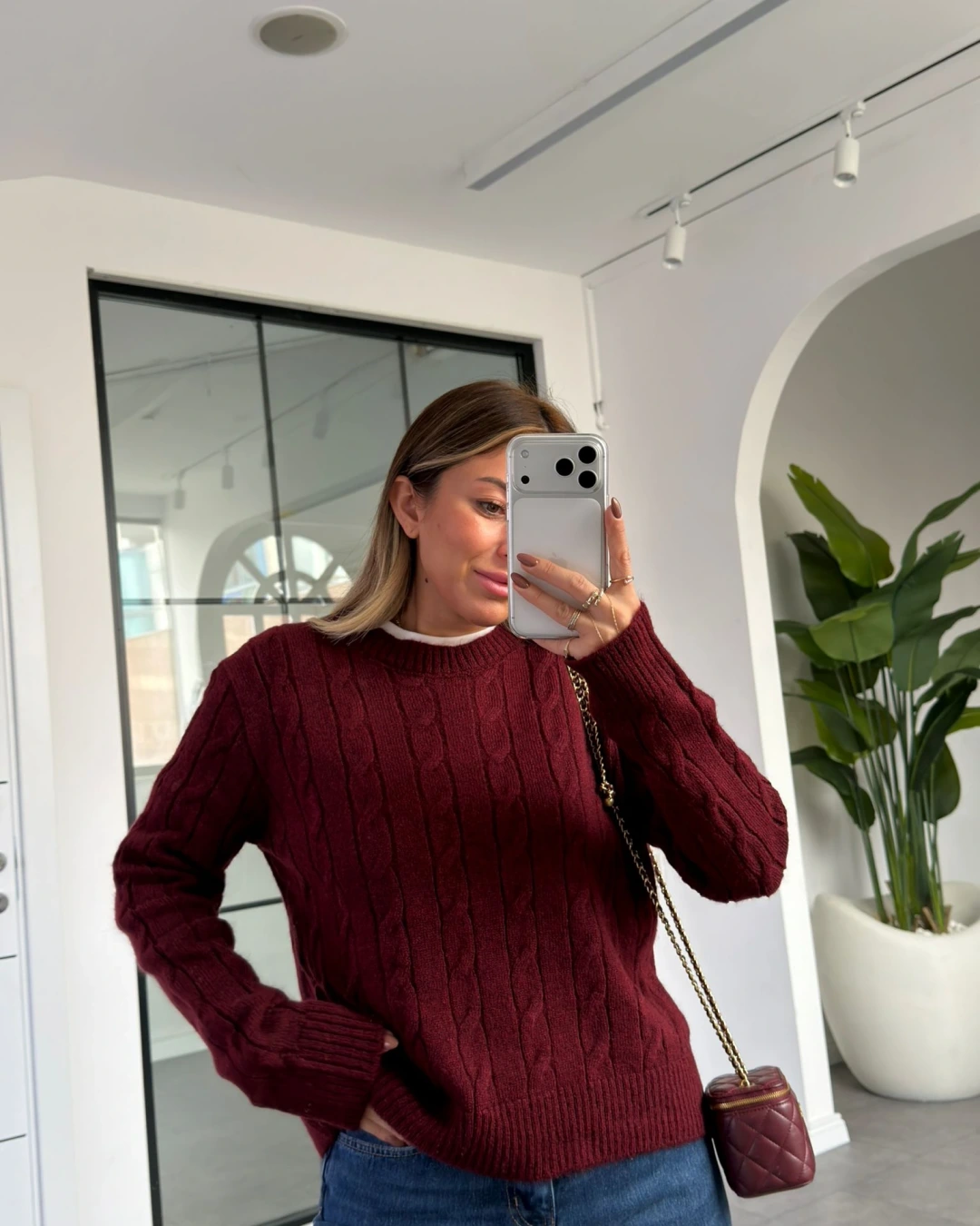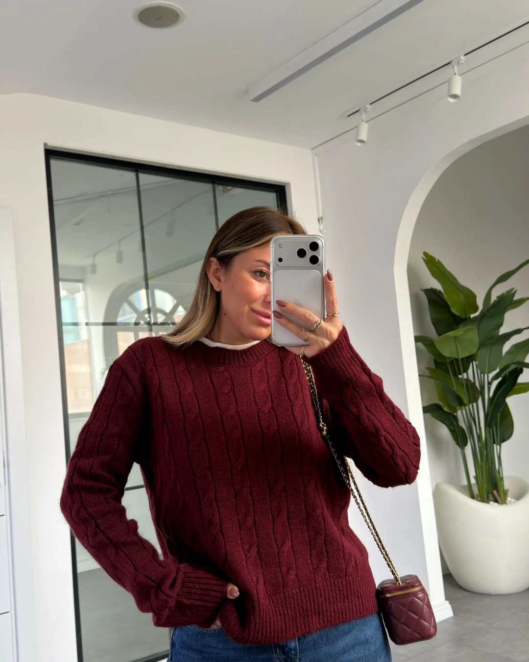 BORDO YUVARLAK YAKA SAÇ ÖRGÜ TRİKO KAZAK