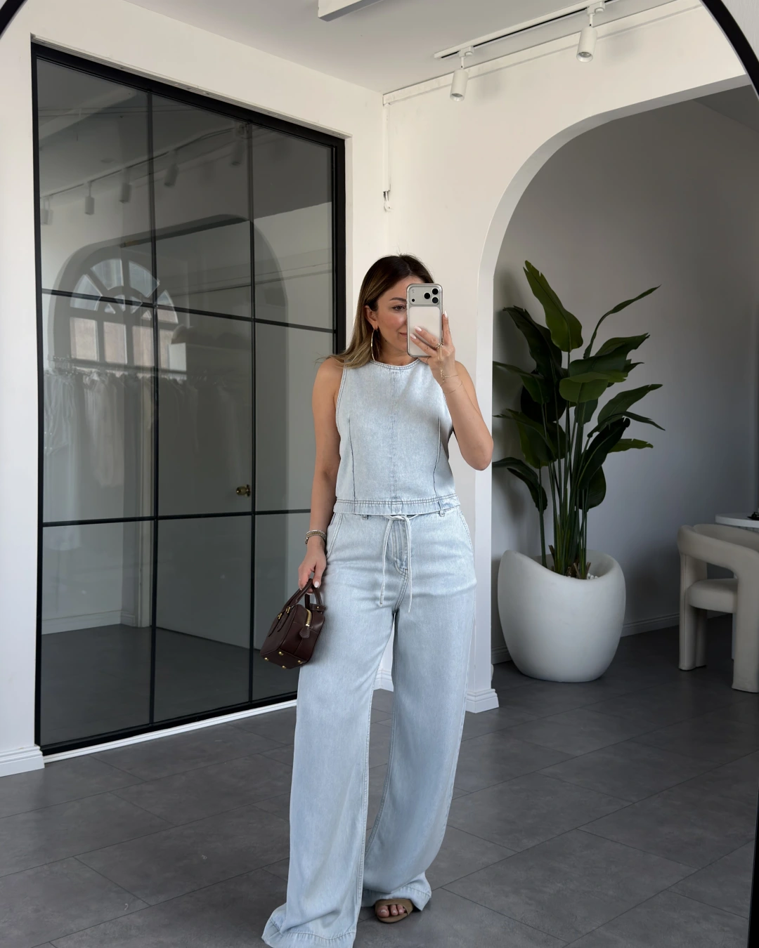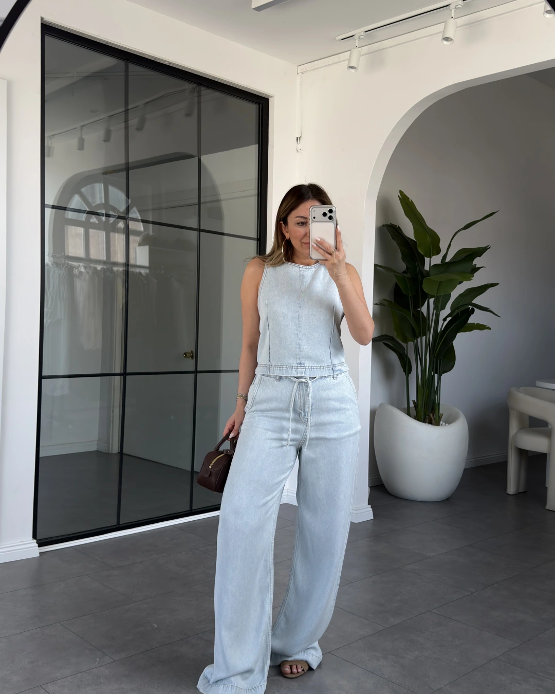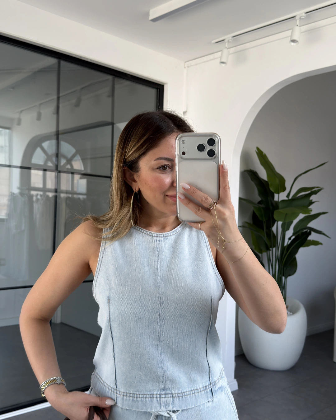 BUZ MAVİ FERMUARLI BLUZ BELİ İPLİ TENCEL TAKIM KS-001