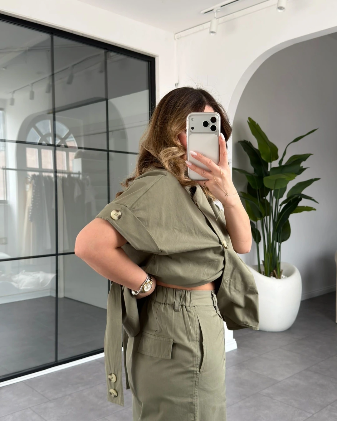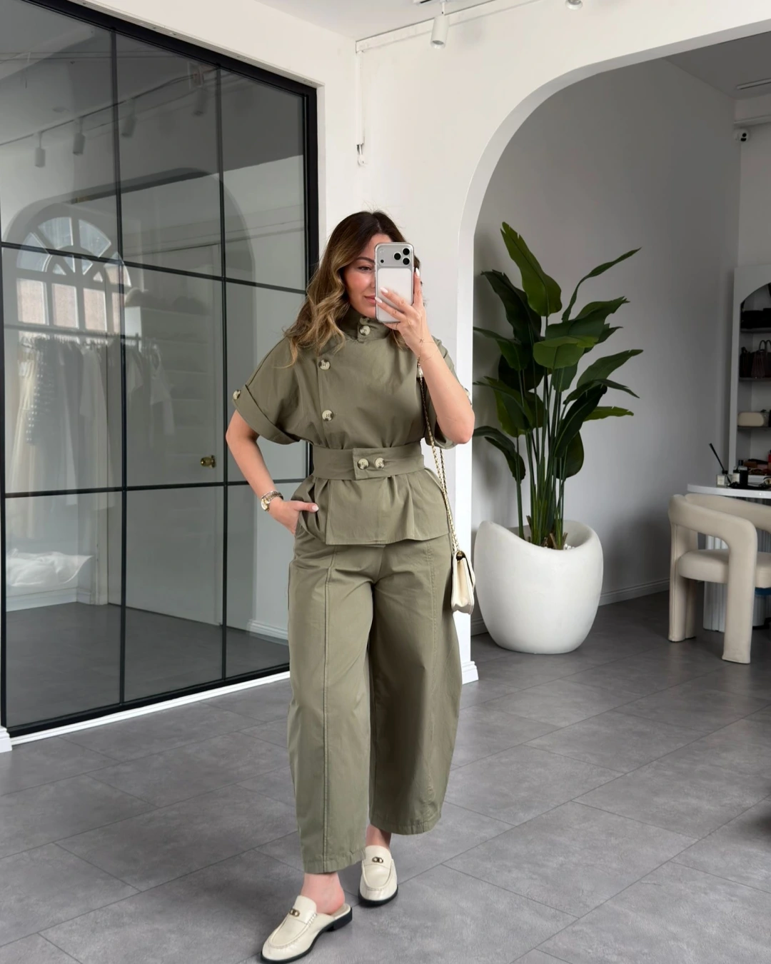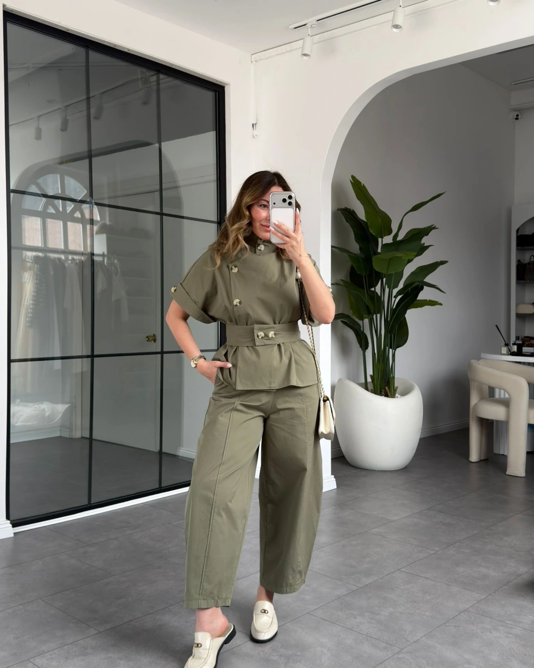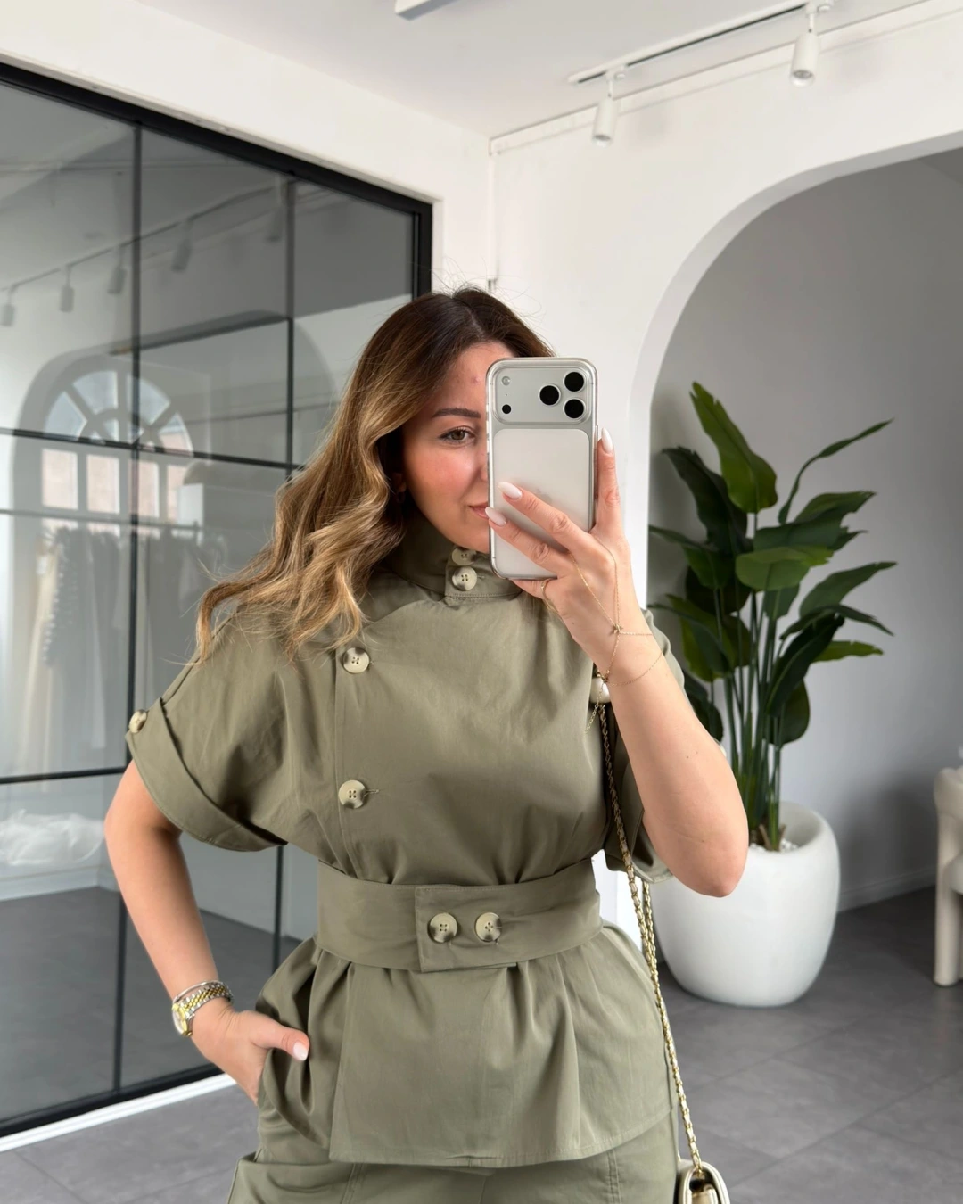 ÇAĞLA YEŞİLİ DİK YAKA DÜĞMELİ BLUZ TAKIM