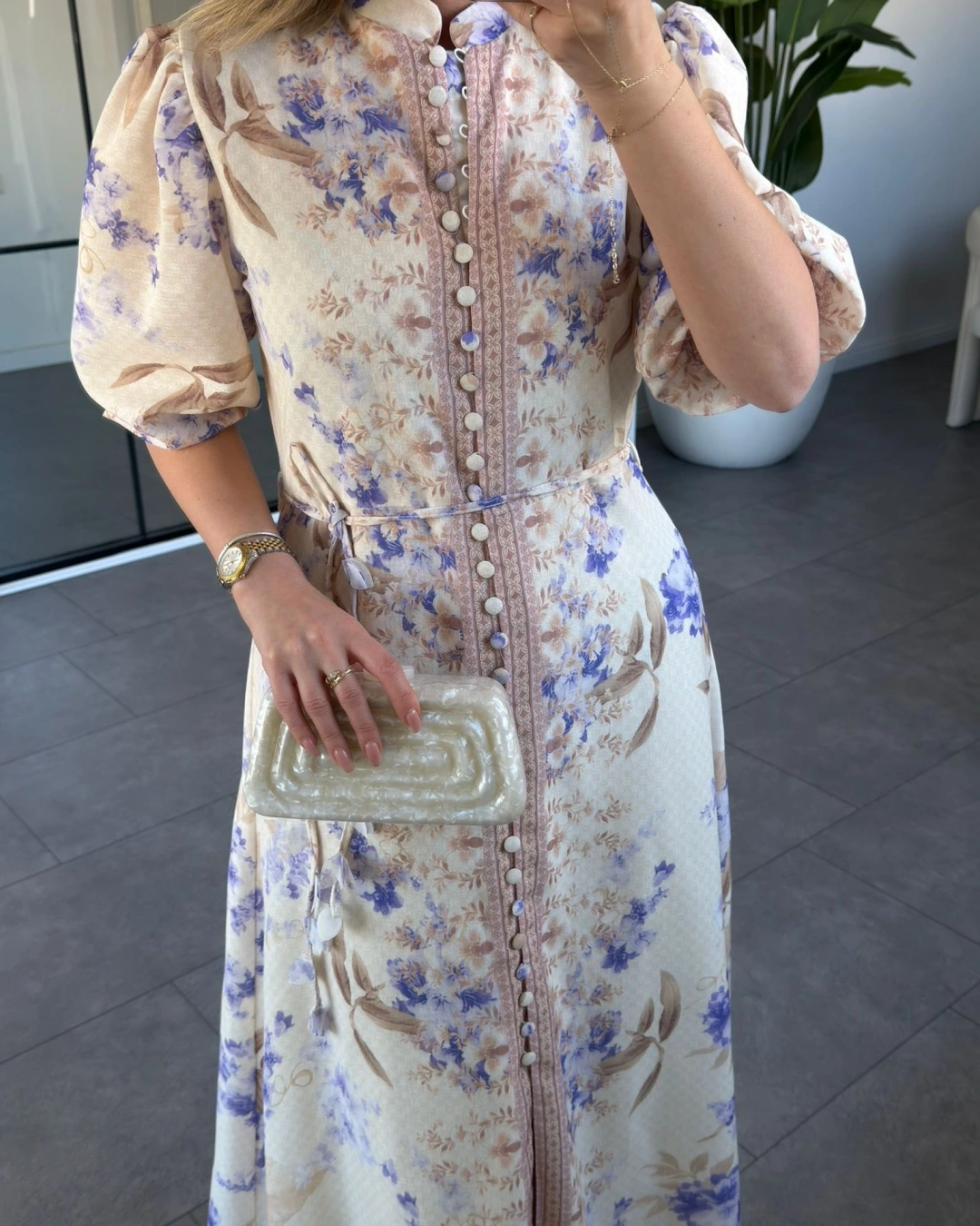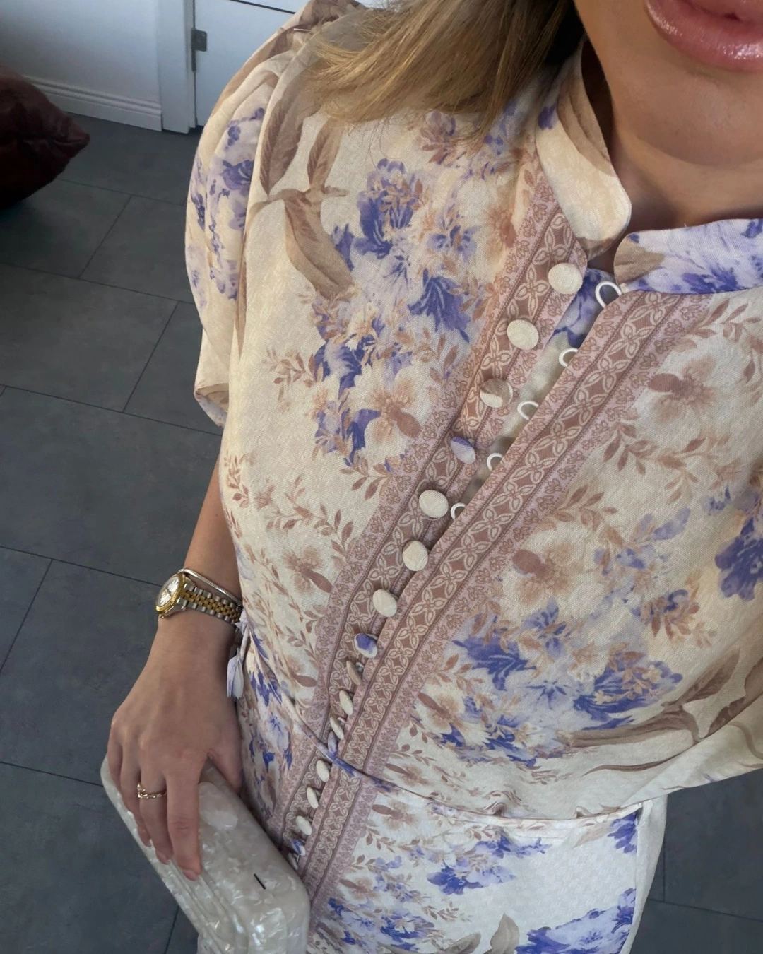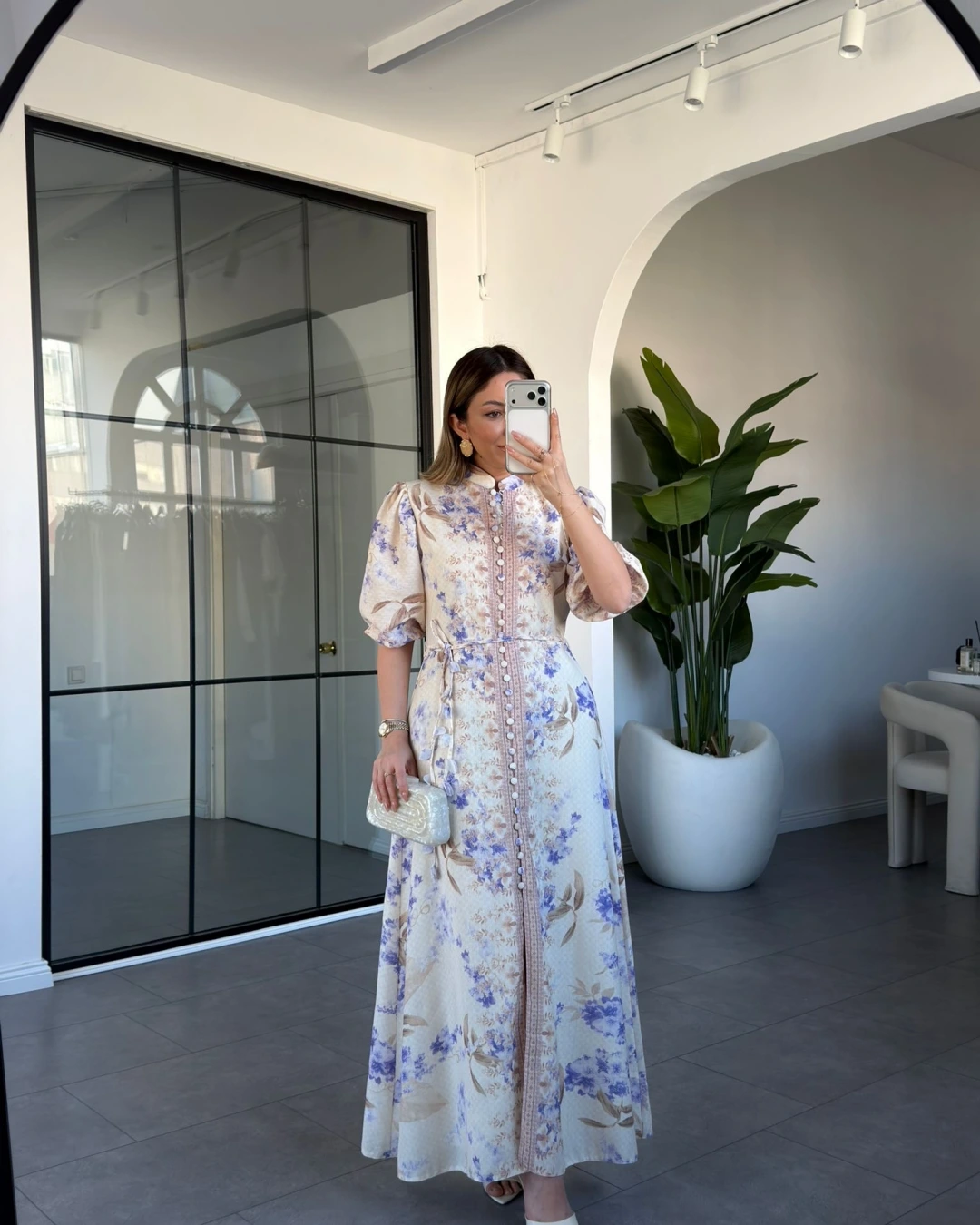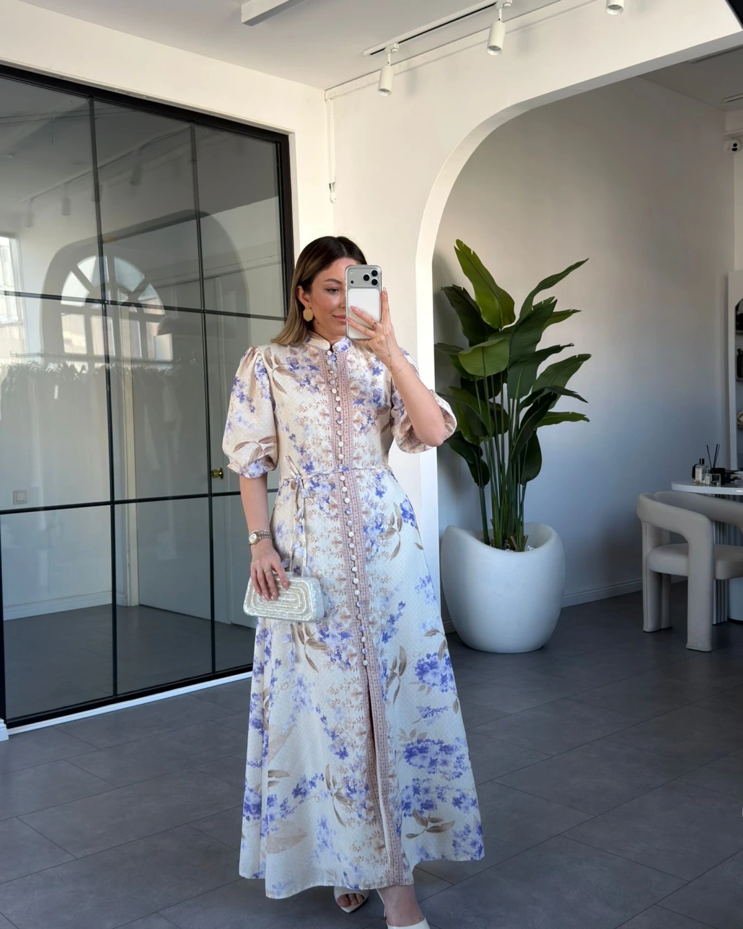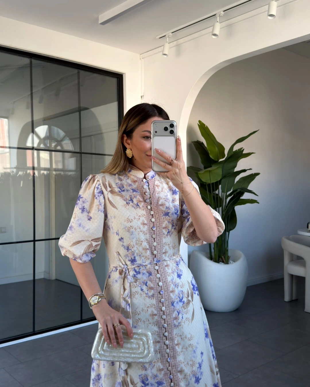 ÇİÇEK DESEN PREMİUM KUMAŞ DÜĞMELİ ELBİSE 0840