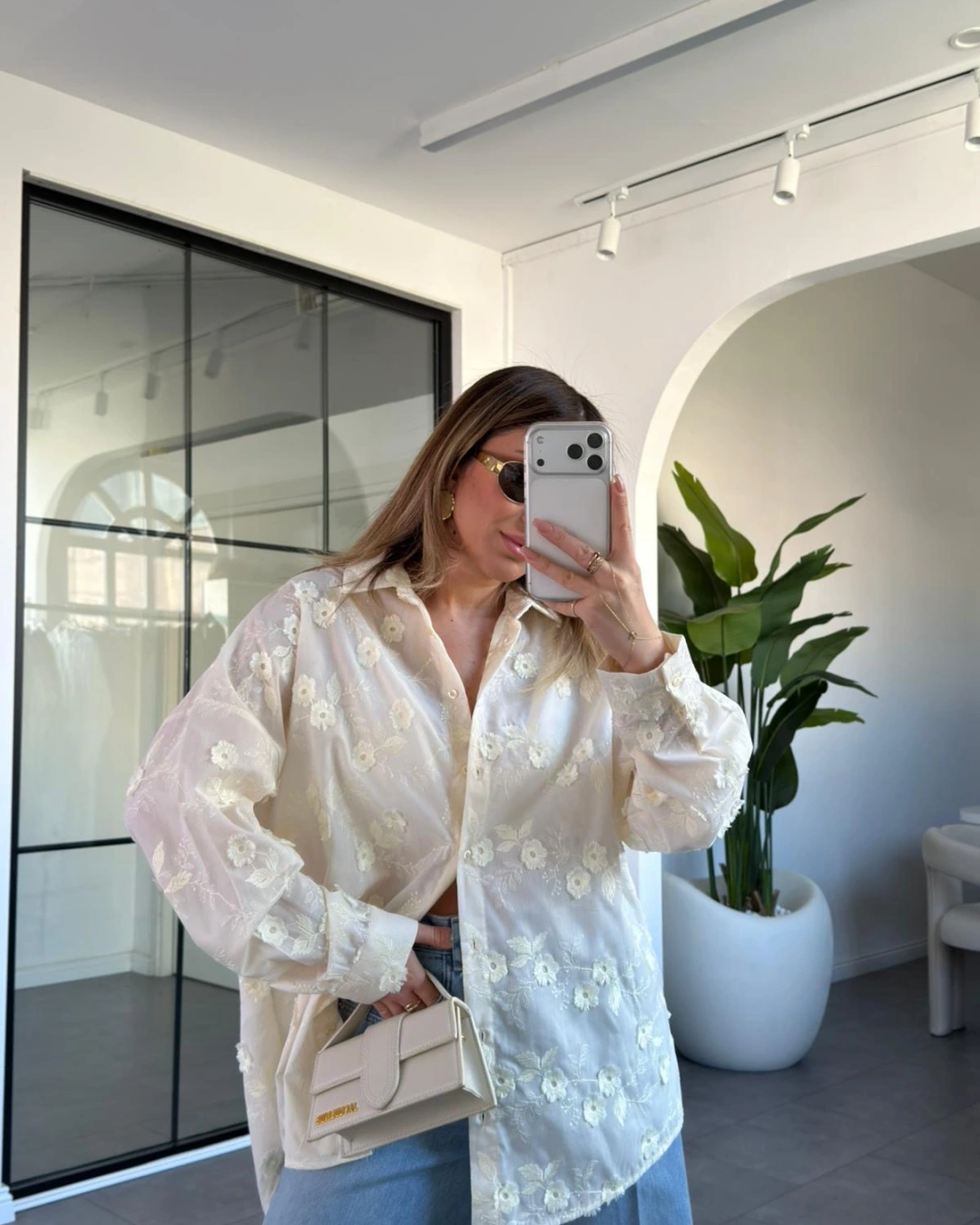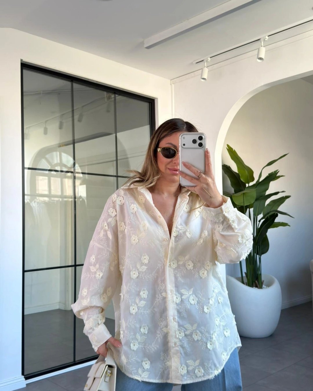 EKRU ÇİÇEK NAKIŞLI GÖMLEK 9714
