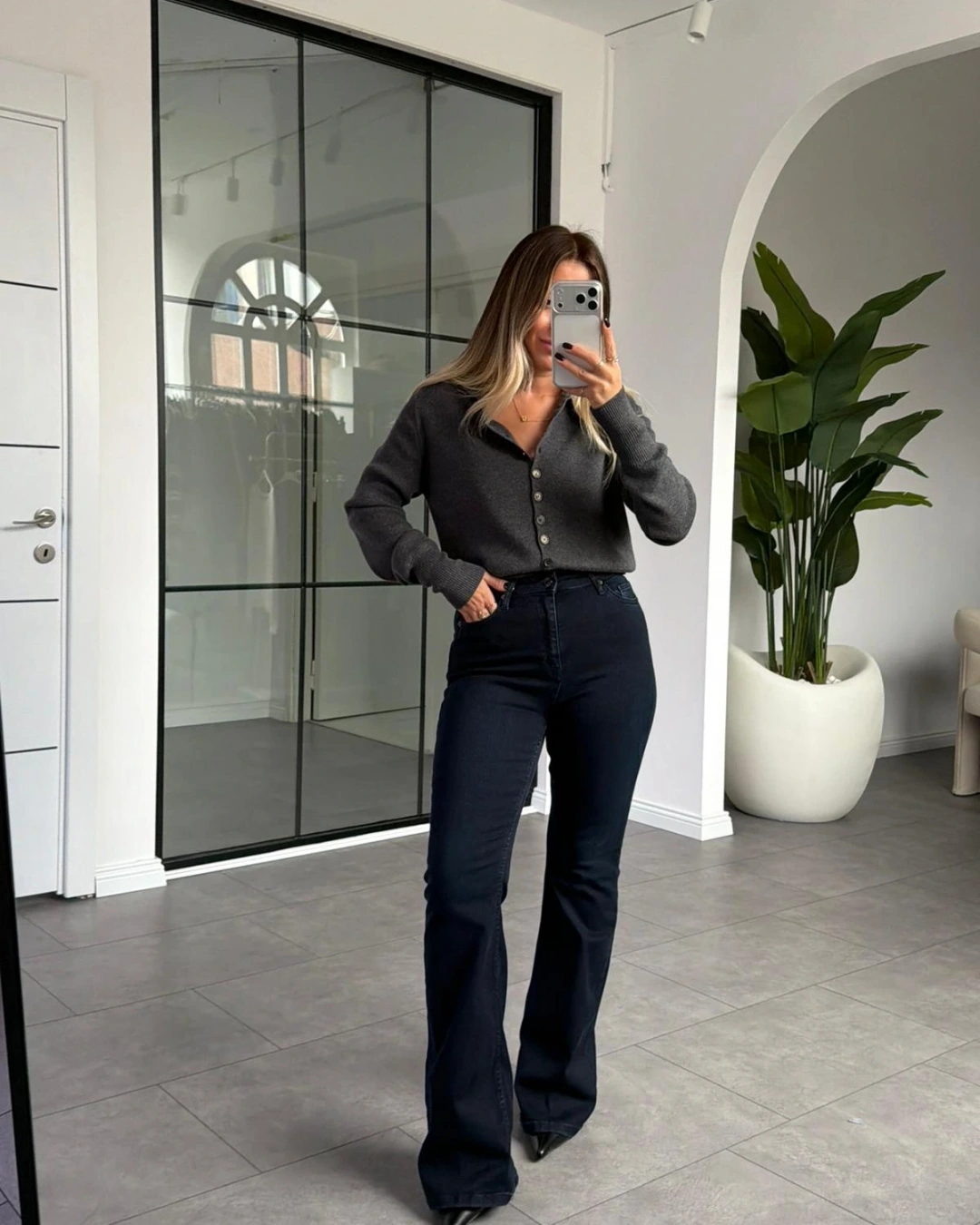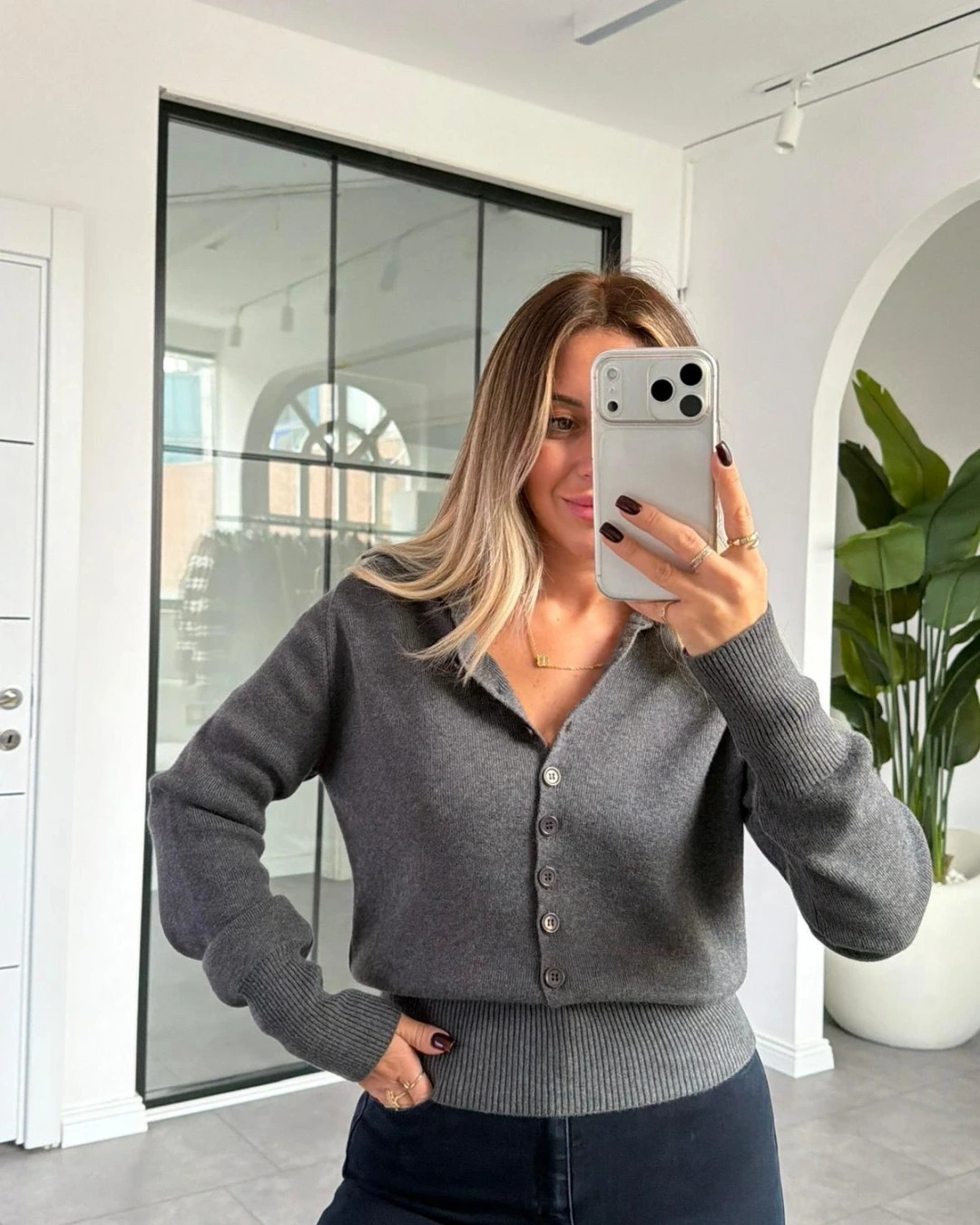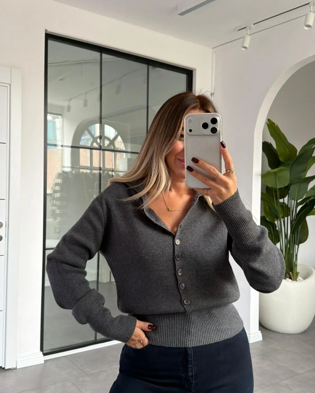 FÜME POLO YAKA DÜĞMELİ TRİKO KAZAK