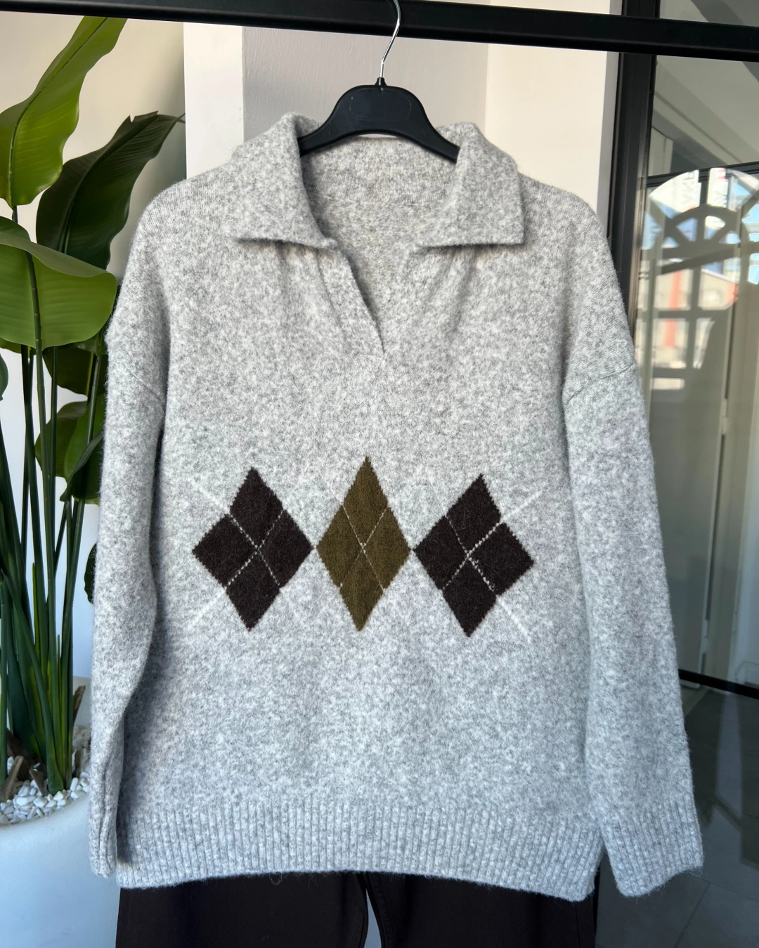 GRİ BAKLAVA DESEN POLO YAKA KAZAK