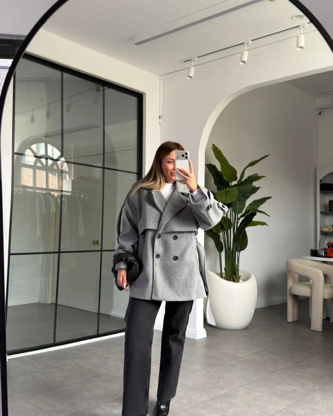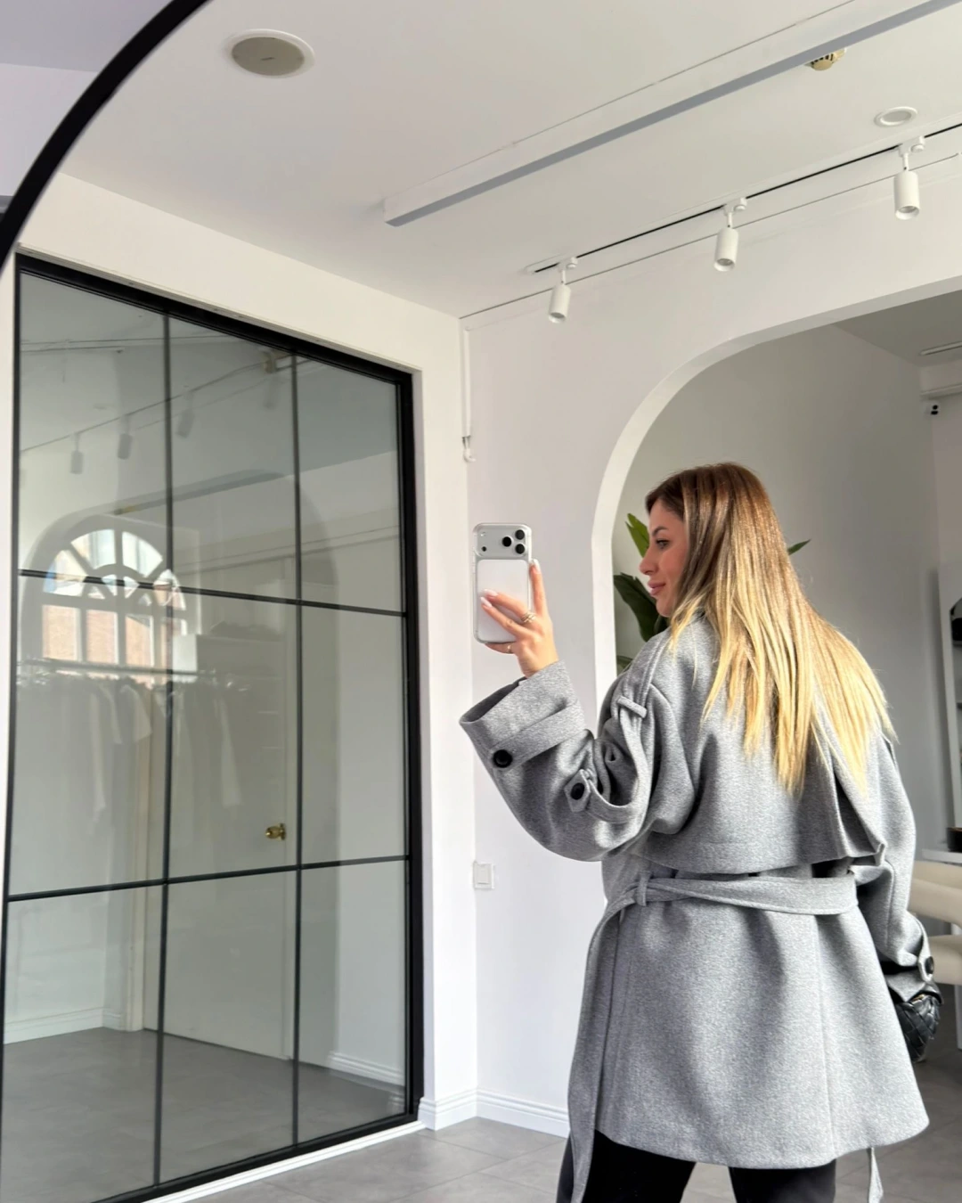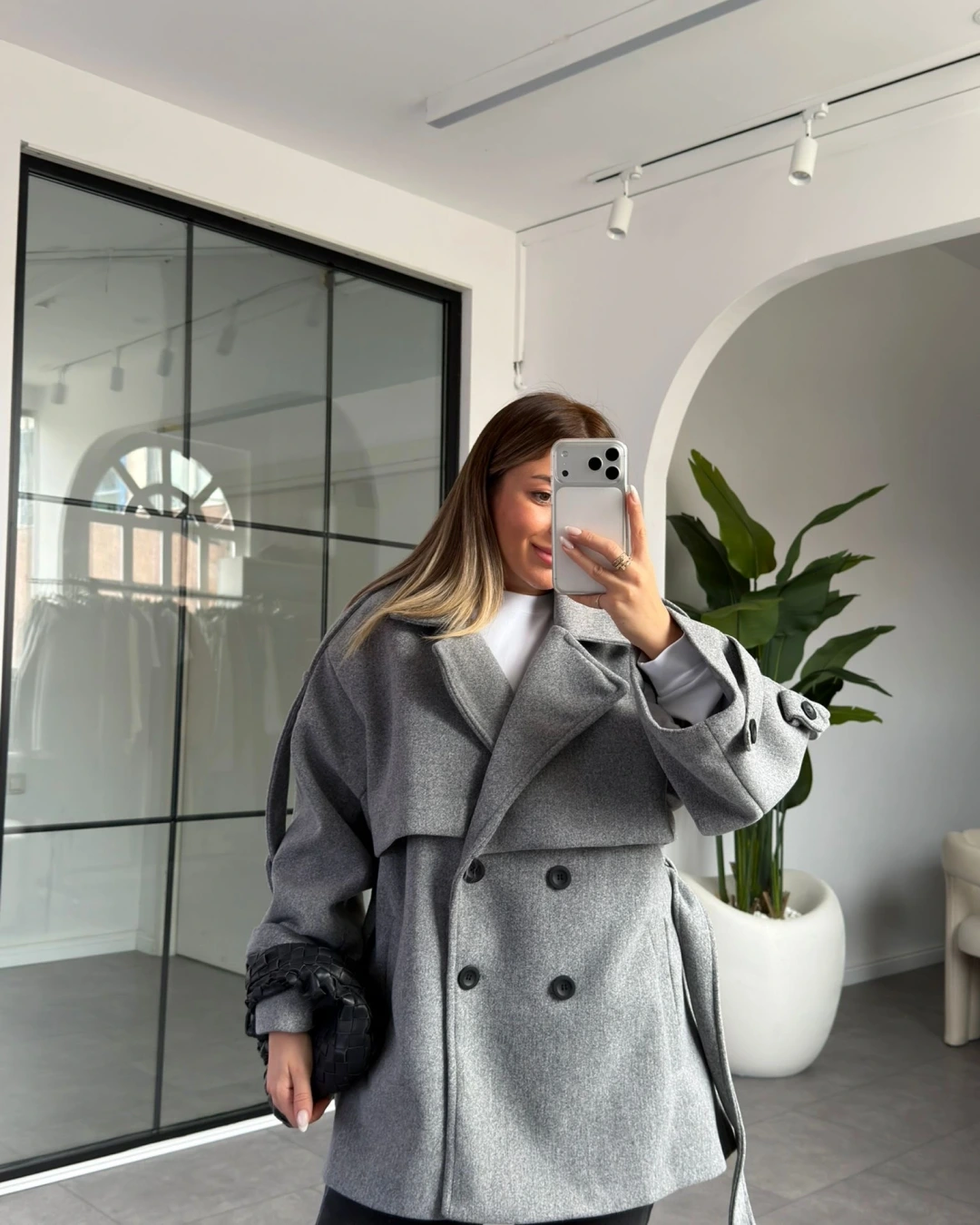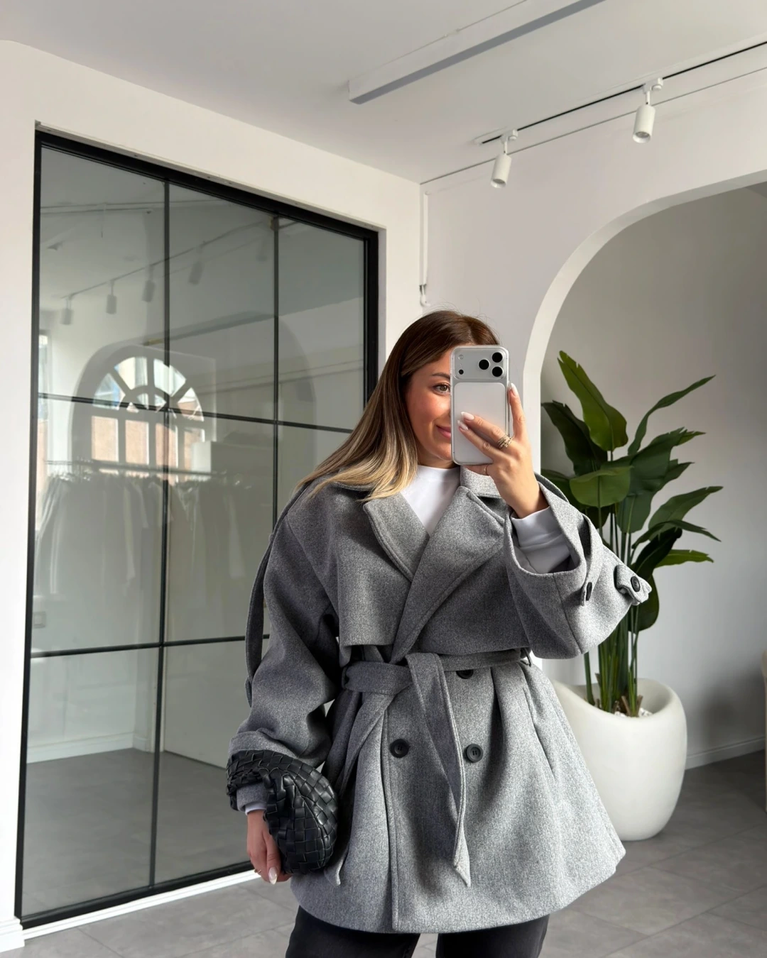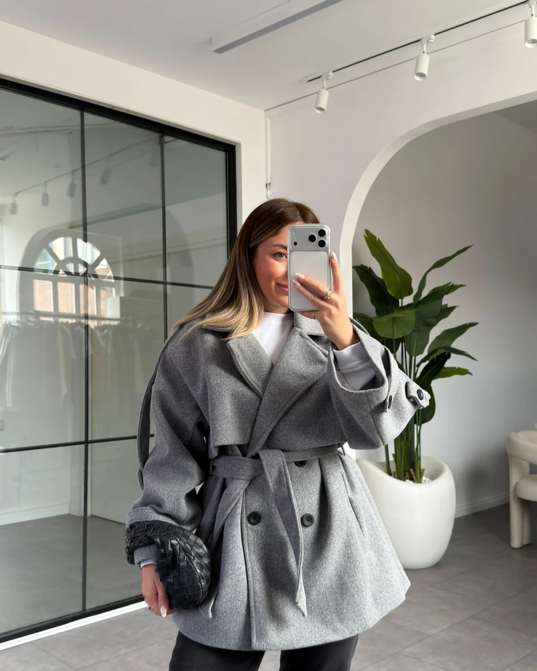 GRİ DÜĞMELİ MANŞET DETAY KUŞAKLI KAŞE KABAN