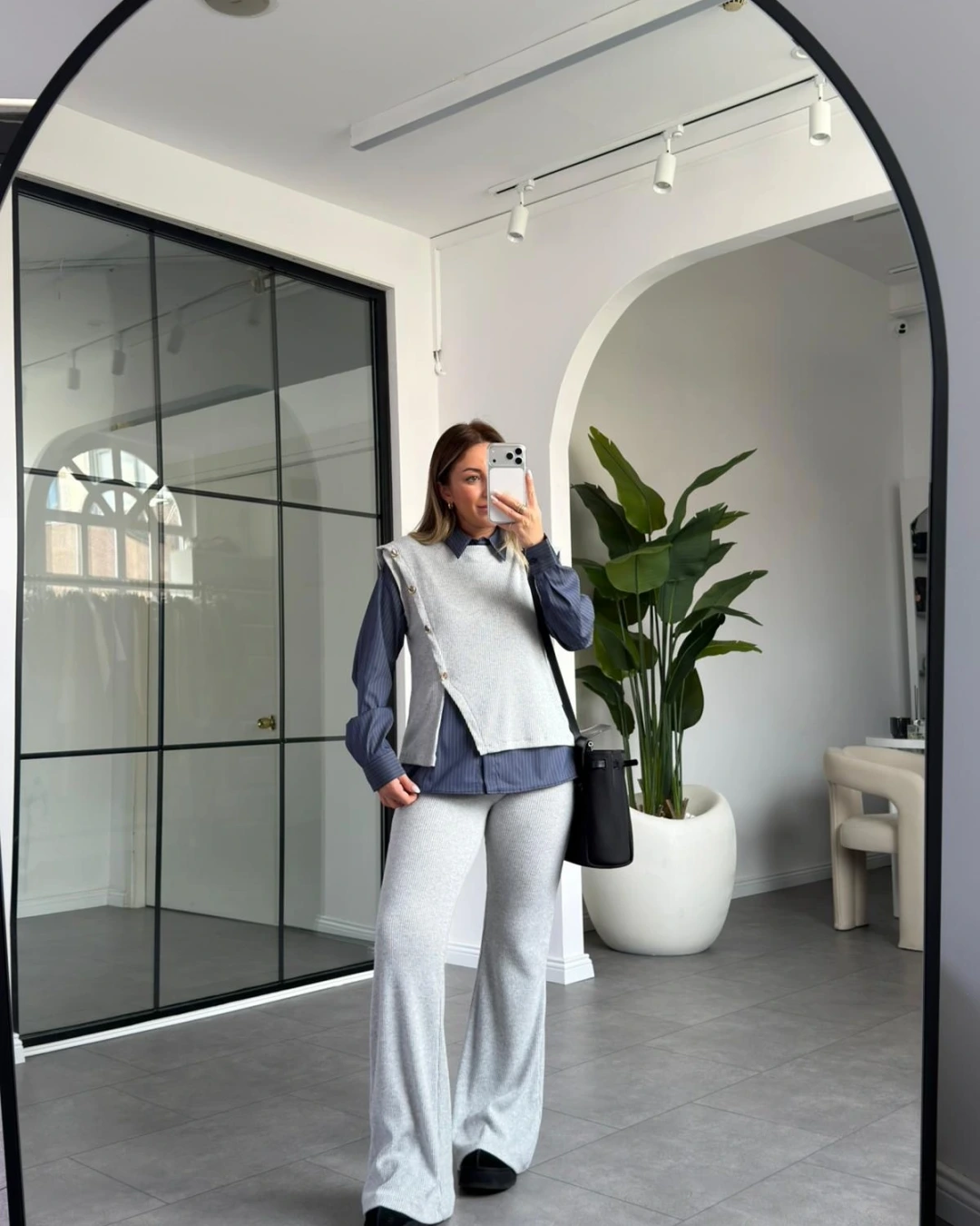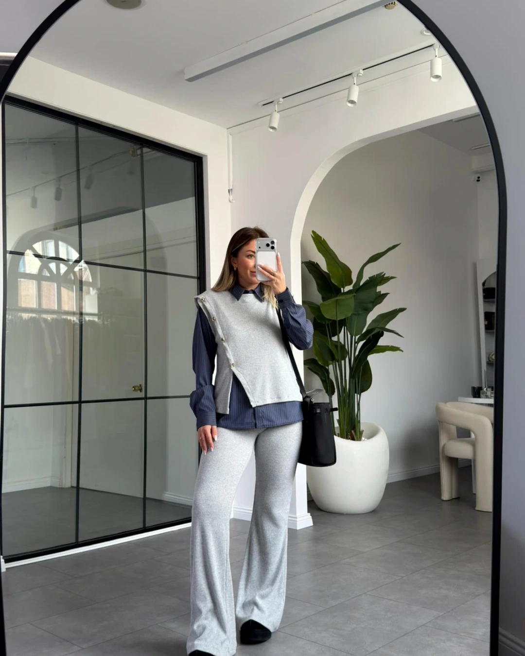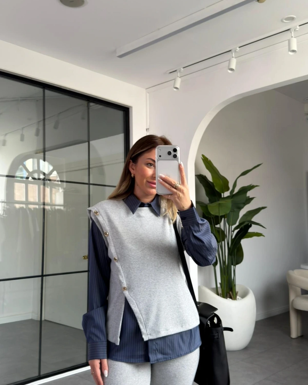 GRİ GOLD DÜĞME DETAYLI ÜÇLÜ TAKIM