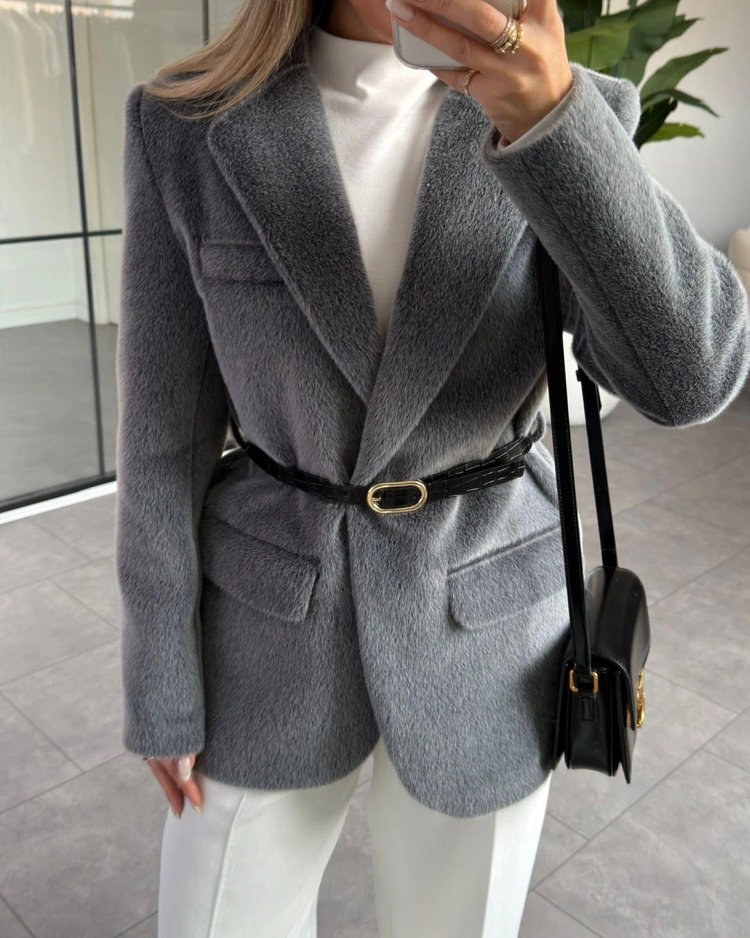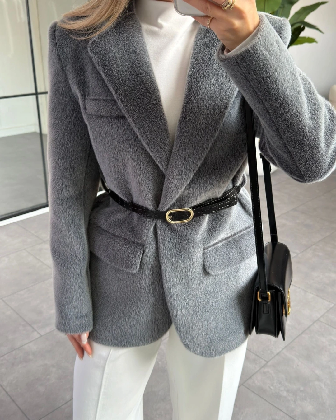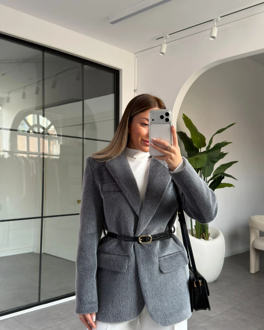 GRİ DÜĞMELİ MANŞET DETAY KUŞAKLI KAŞE KABAN