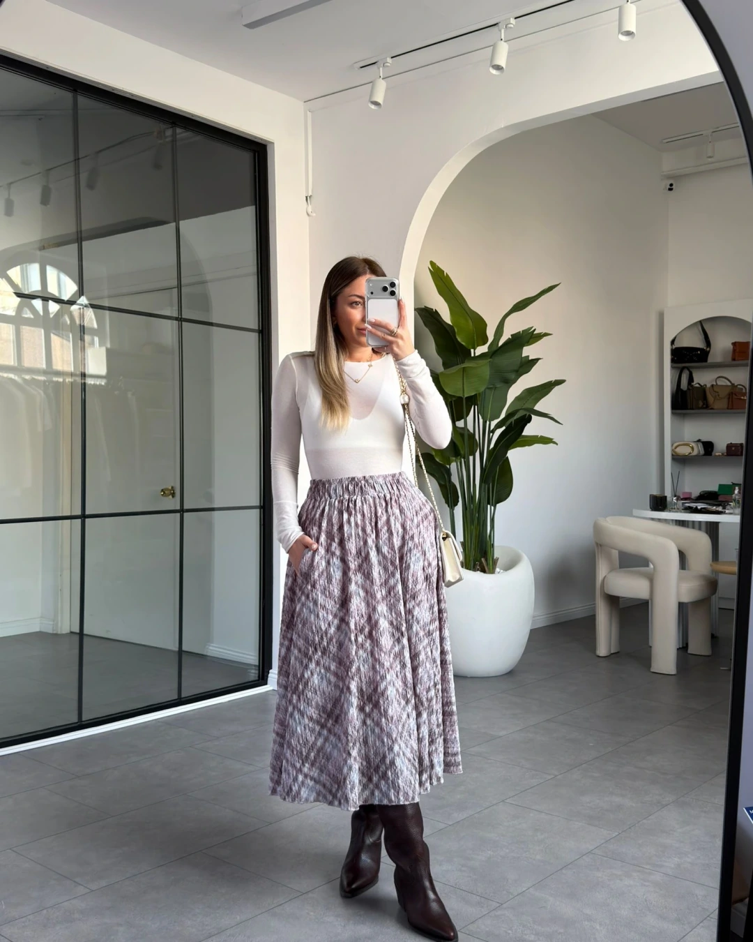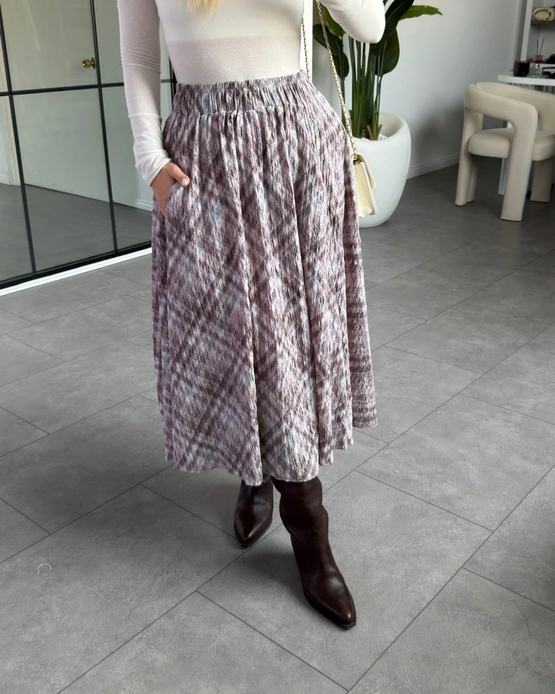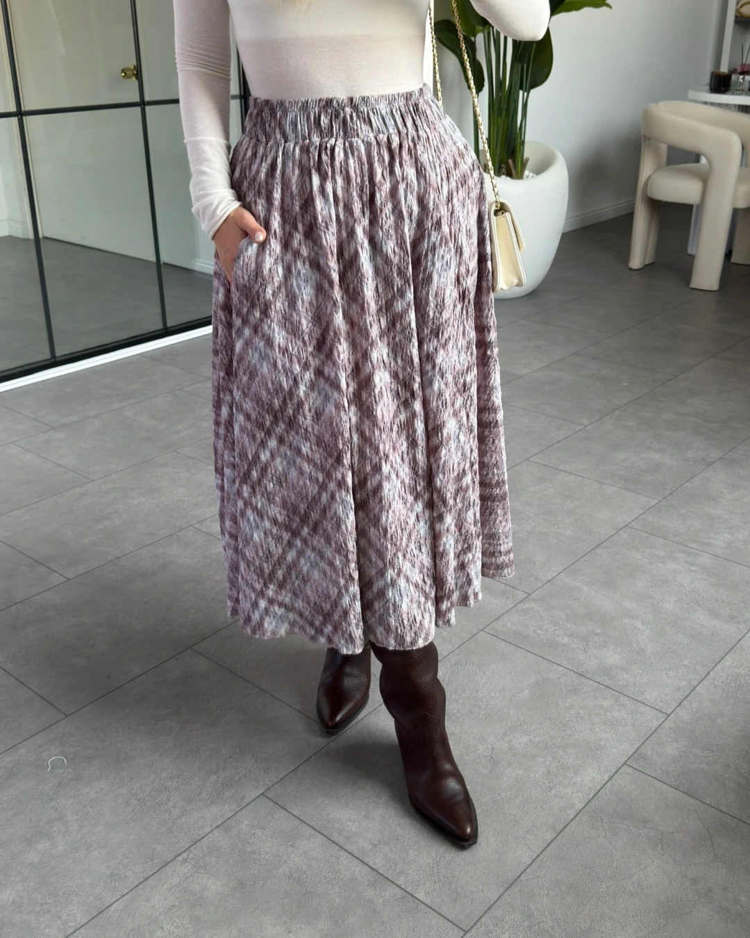 KAHVERENGİ YIRTMAÇ DETAY KEMERLİ EKOSE ETEK