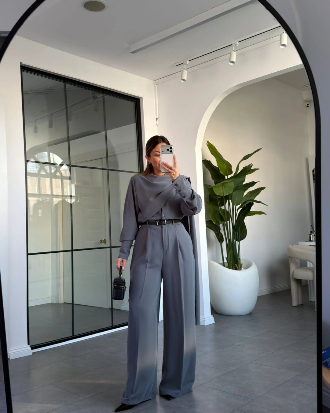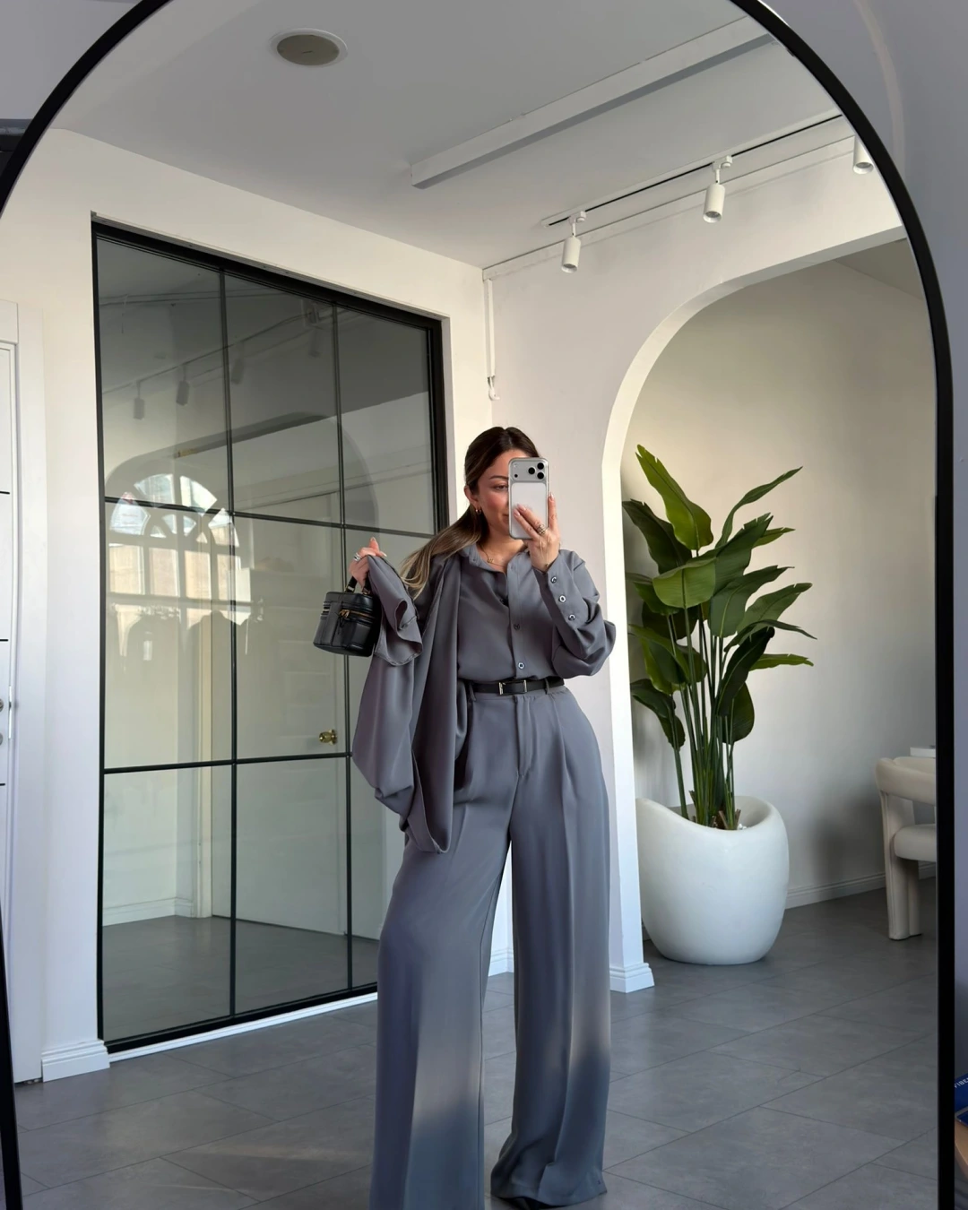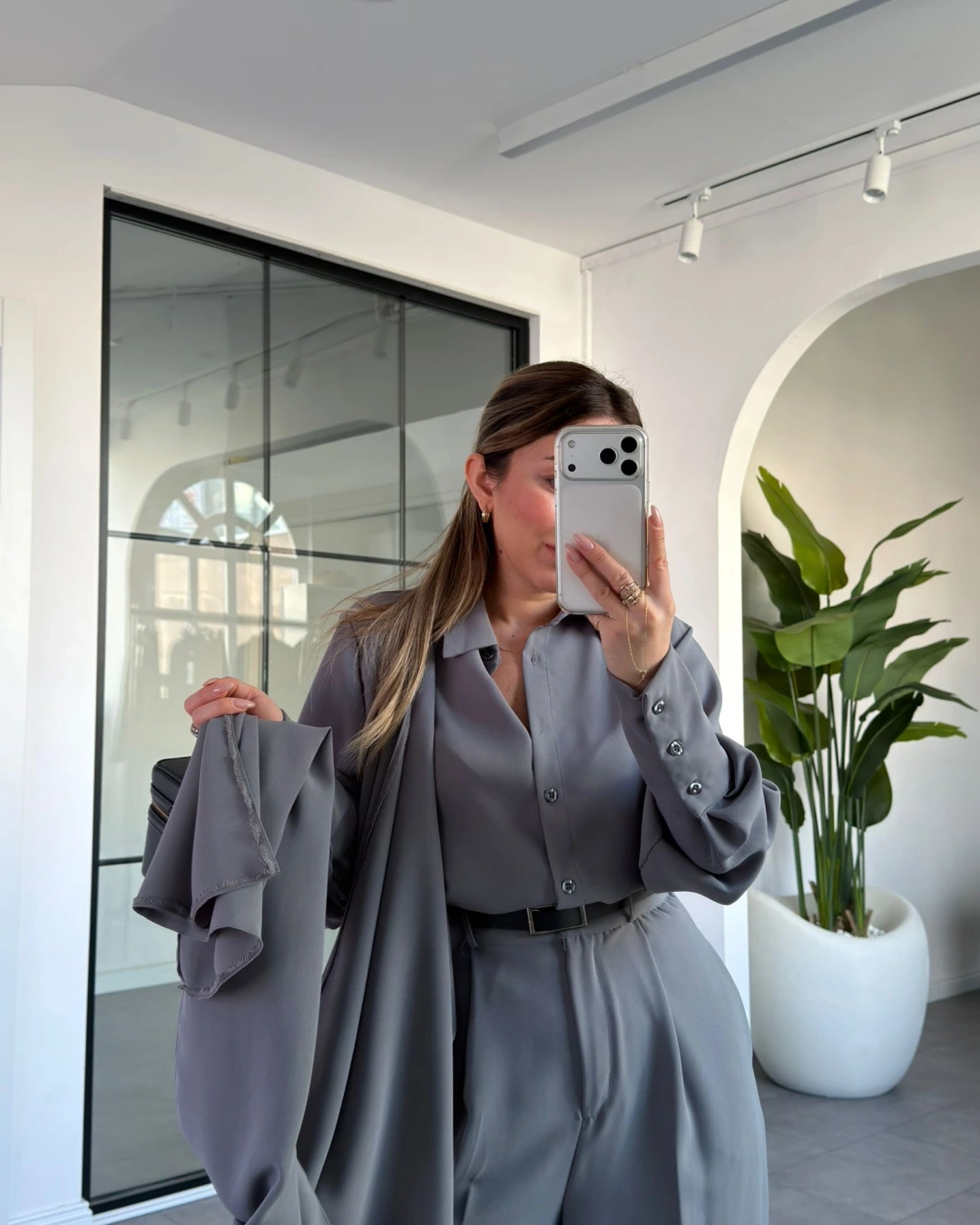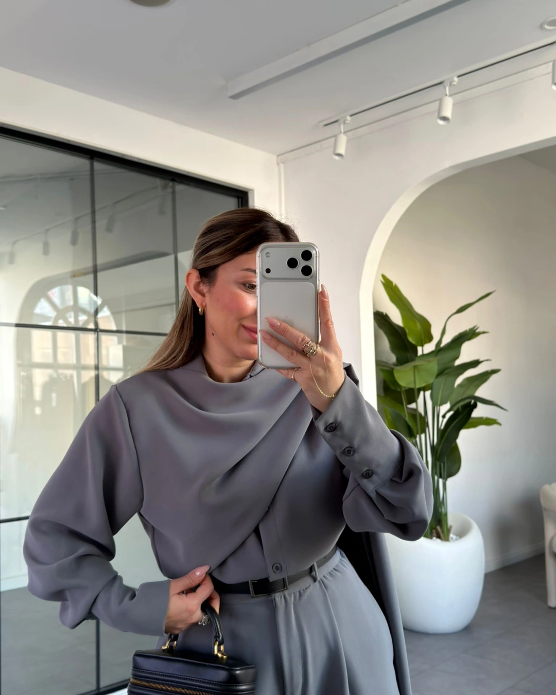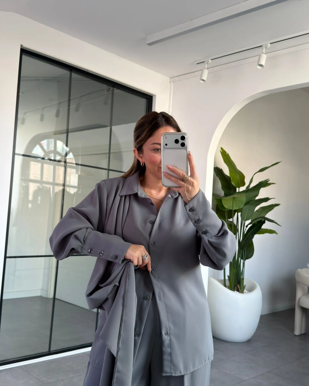 GRİ ŞAL DETAYLI KEMERLİ GÖMLEK TAKIM