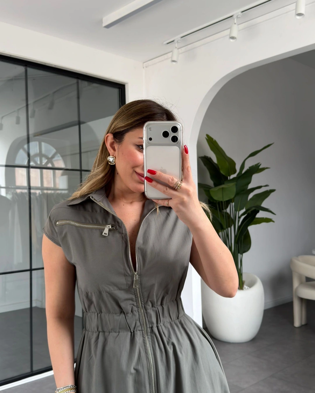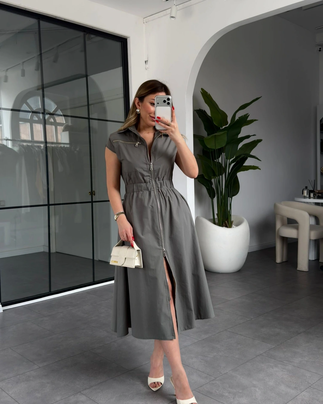 HAKİ BELİ LASTİKLİ SIFIR KOL ÇİFT FERMUARLI ELBİSE