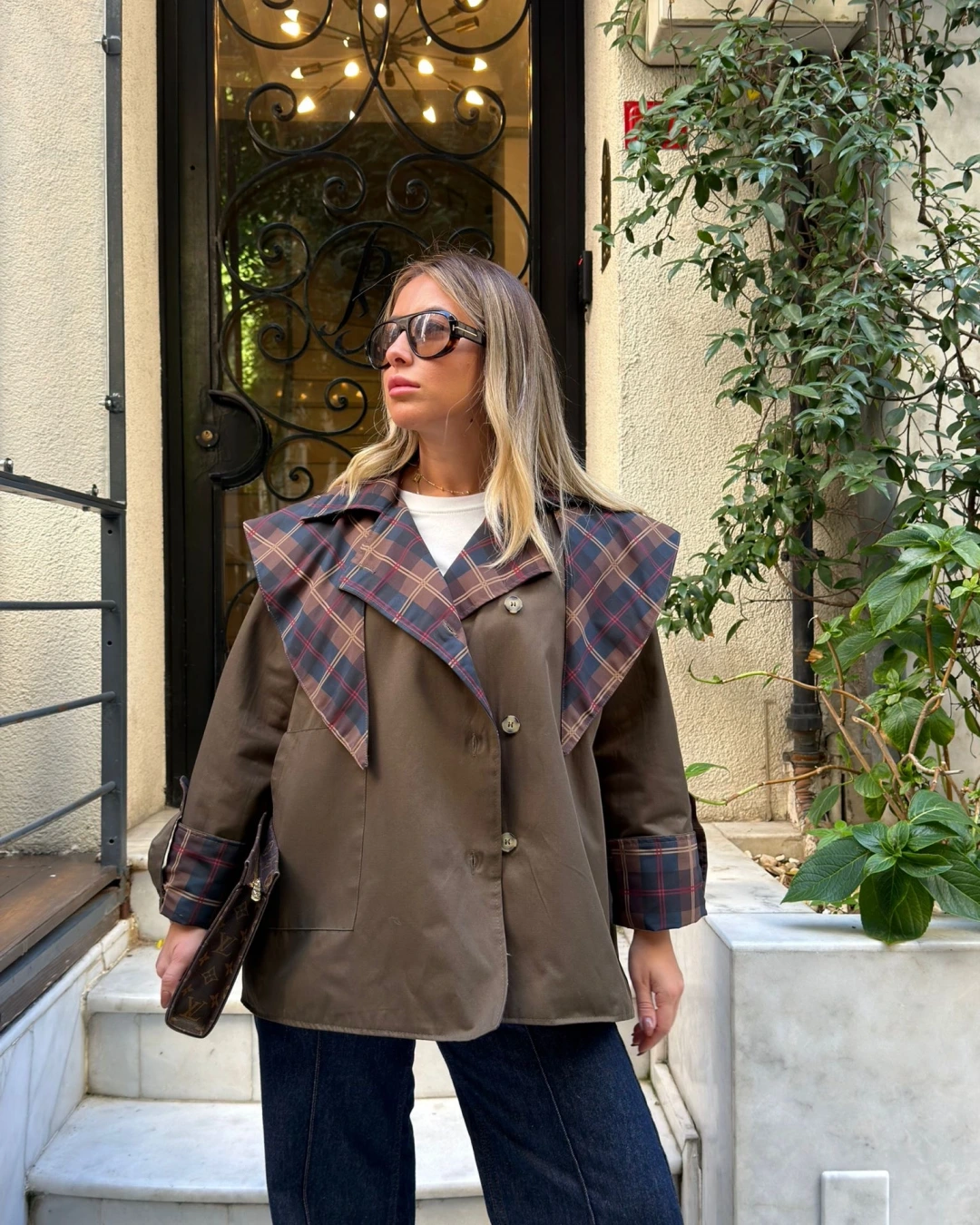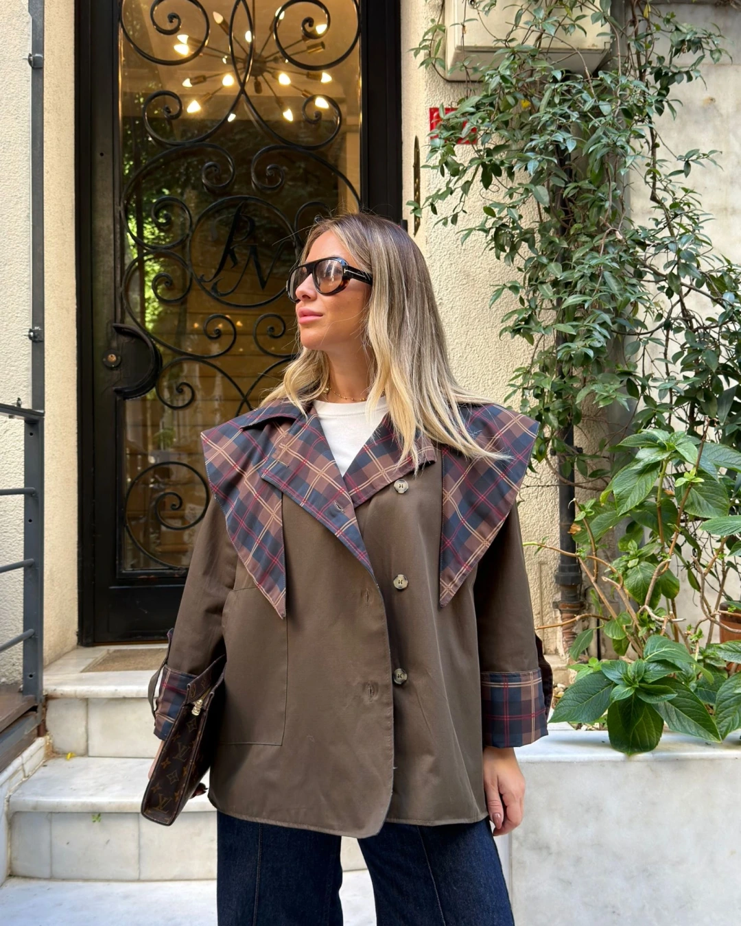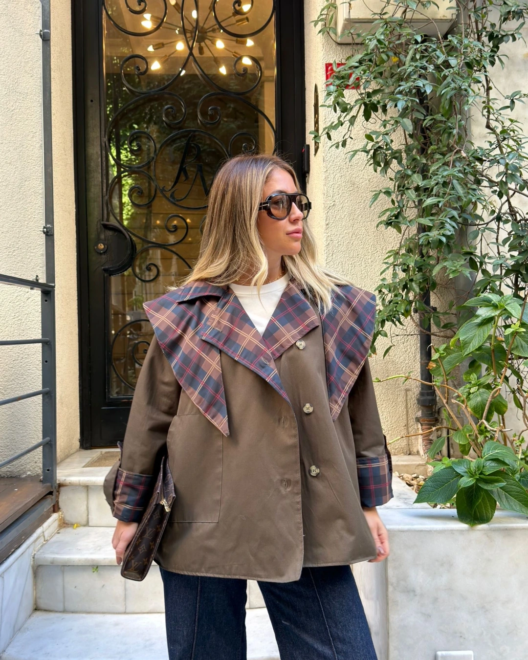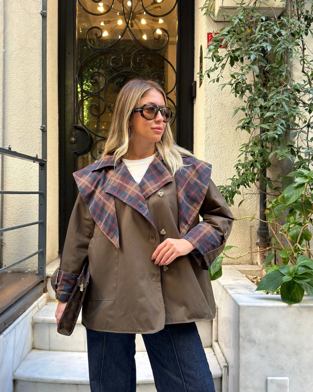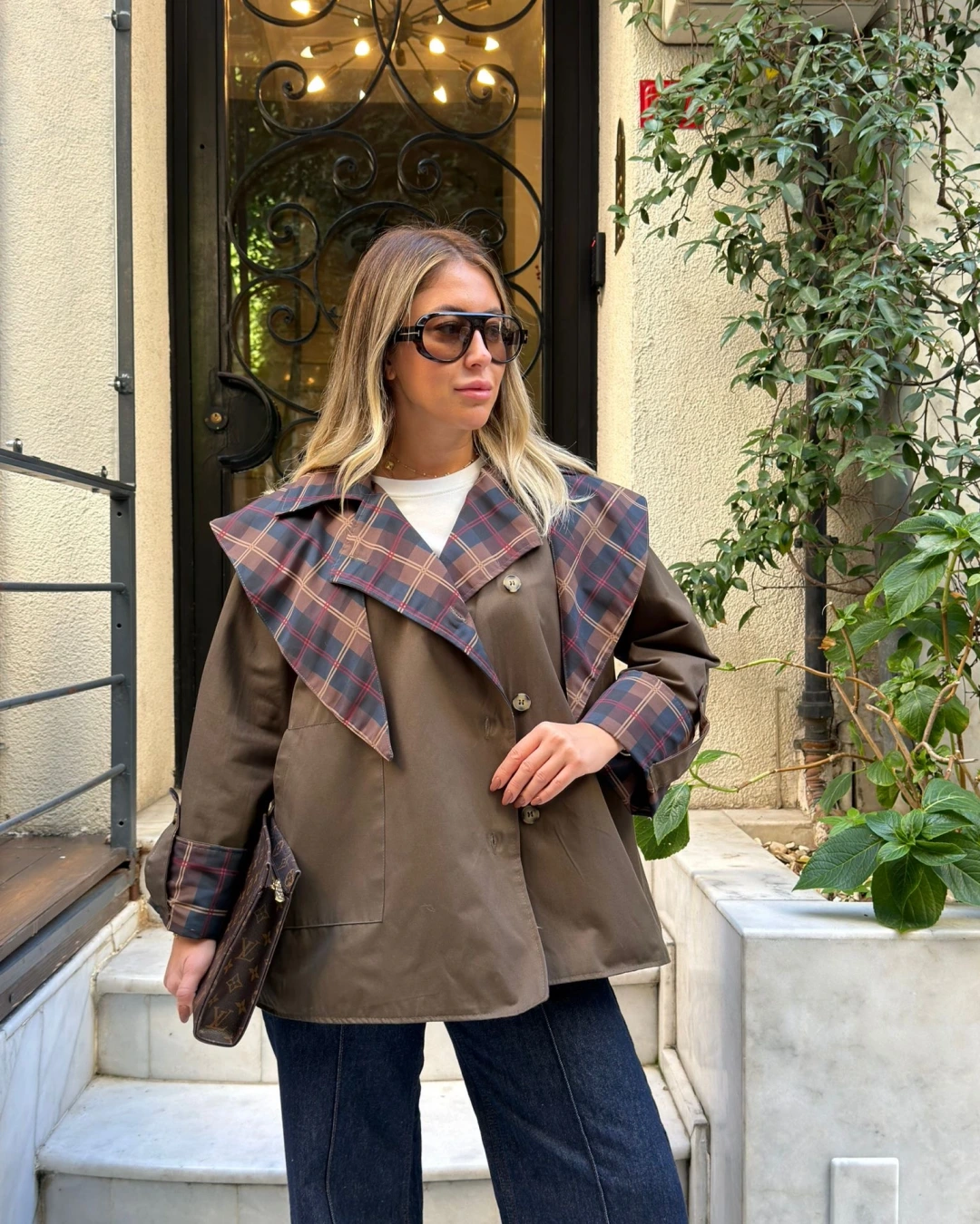 HAKİ EKOSE DESEN ÇİFT TARAFLI FULARLI TRENÇKOT