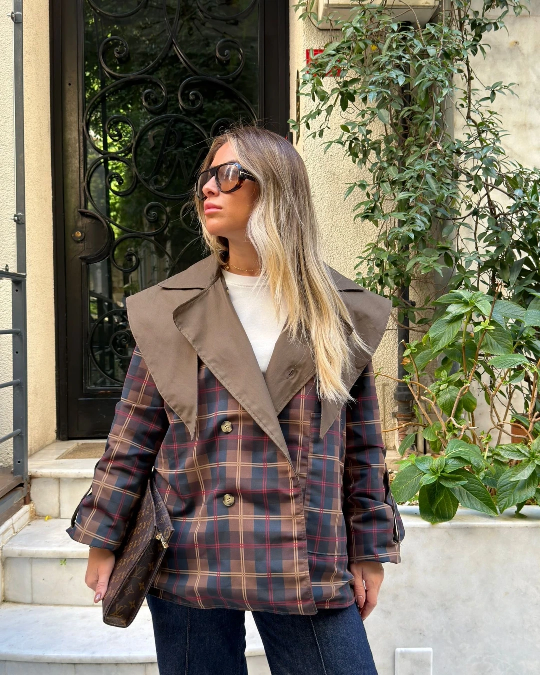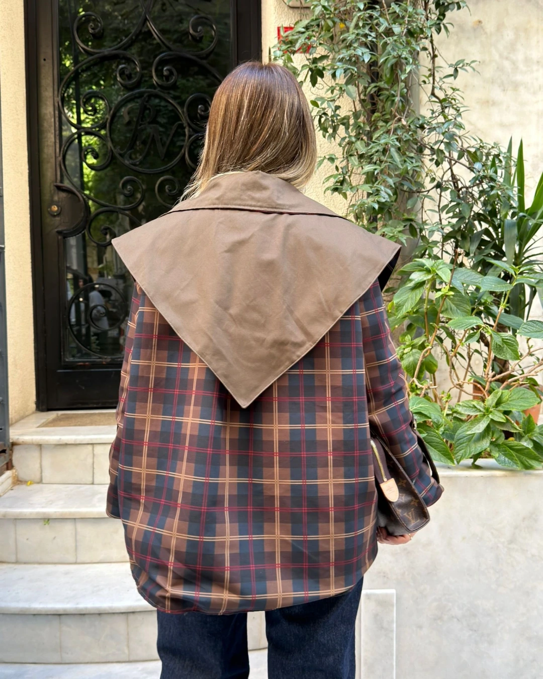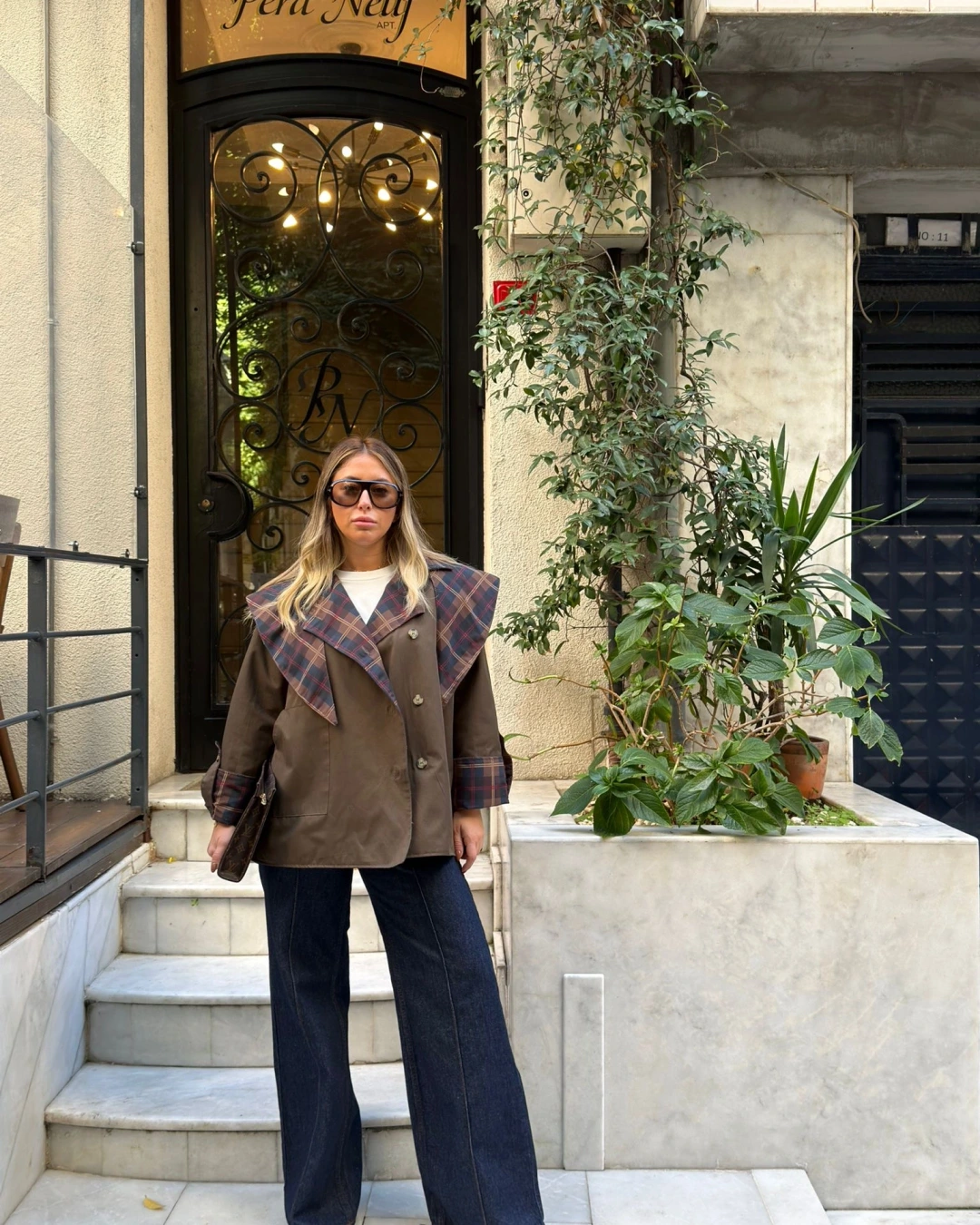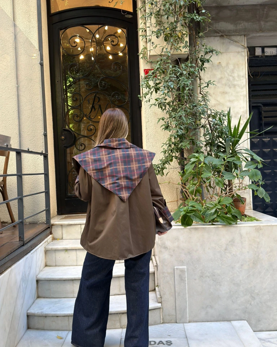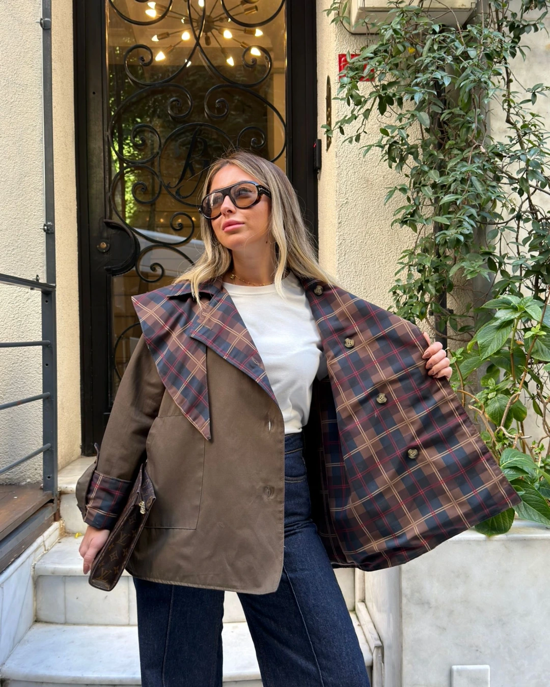 HAKİ EKOSE DESEN ÇİFT TARAFLI FULARLI TRENÇKOT