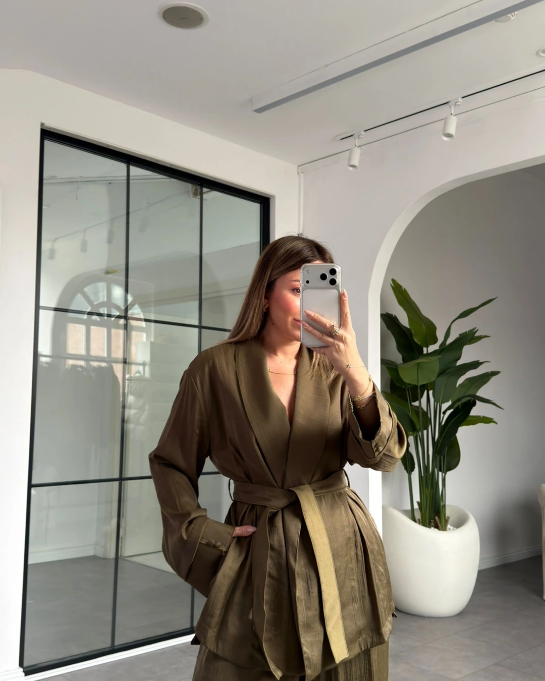 HAKİ KİMONO ŞALVARLI SATEN TAKIM