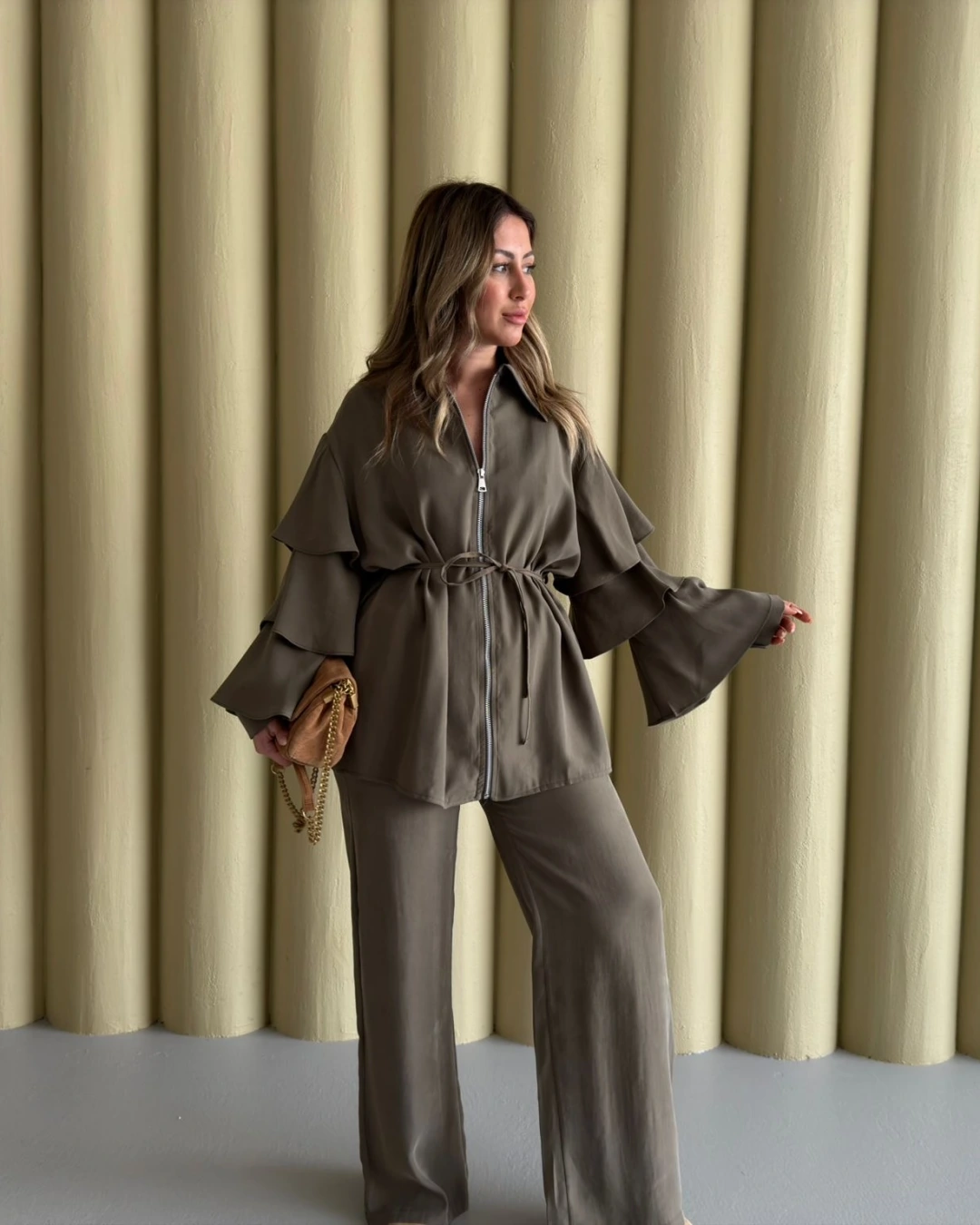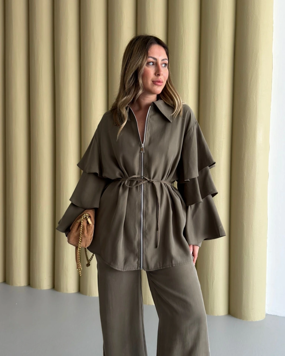 HAKİ KOLLARI VOLANLI BLUZ PANTOLON TAKIM