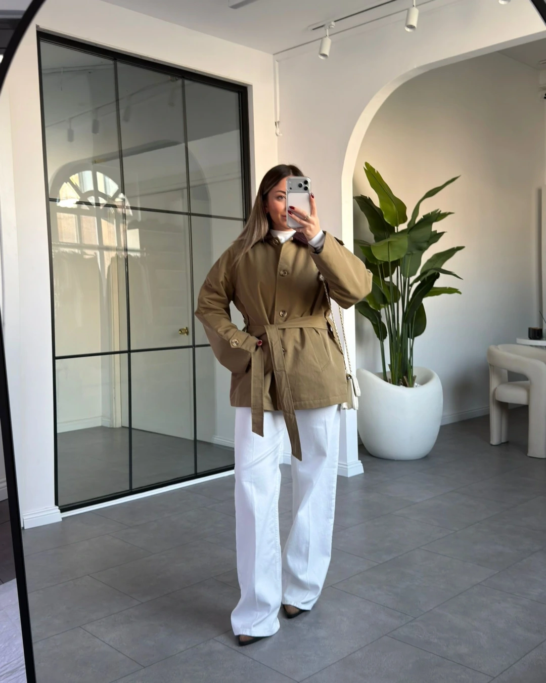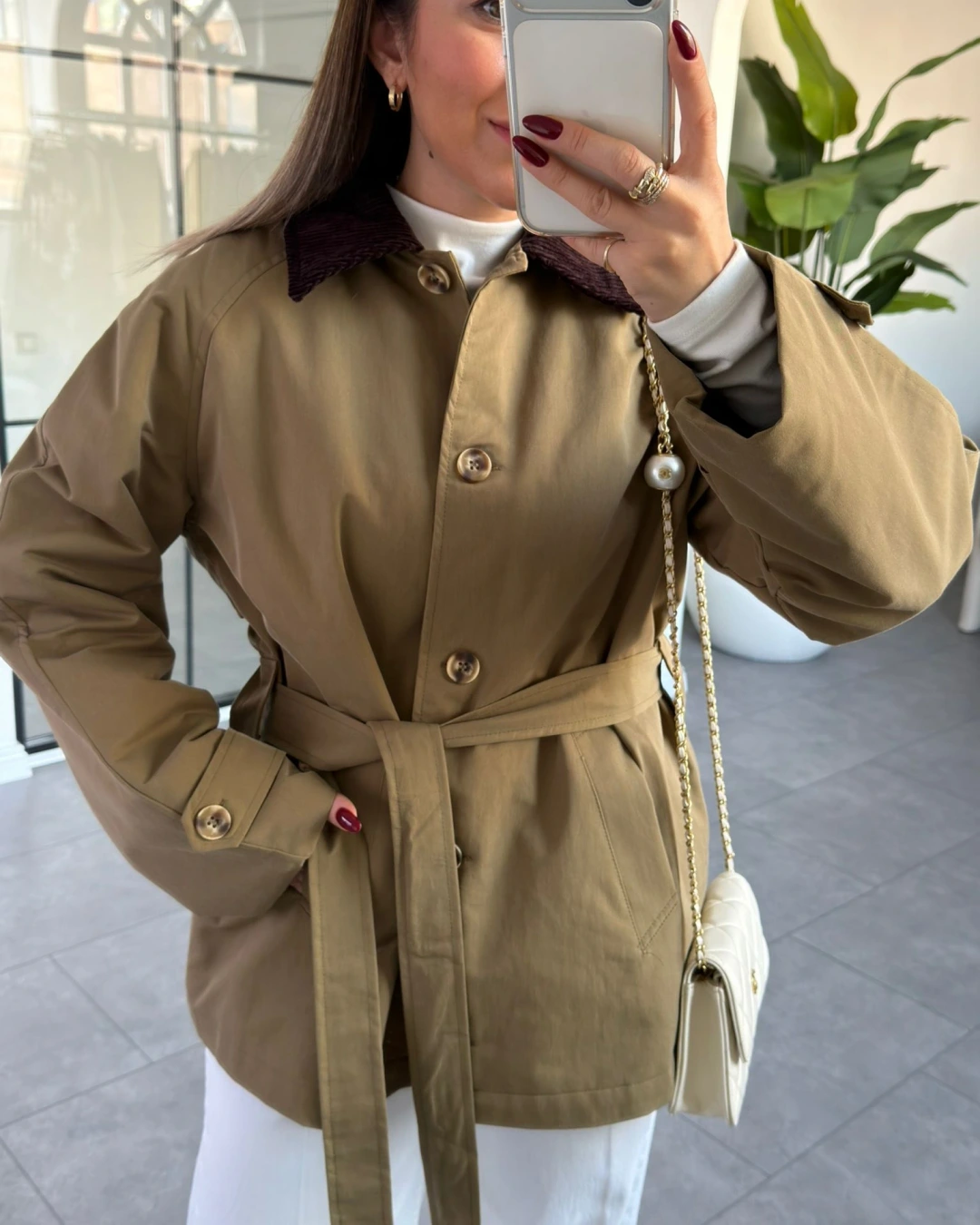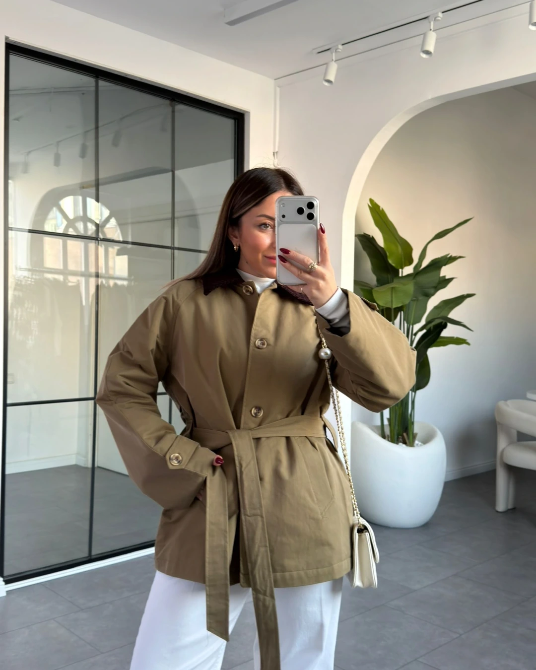 HAKİ YAKASI KADİFE KUŞAKLI MONT