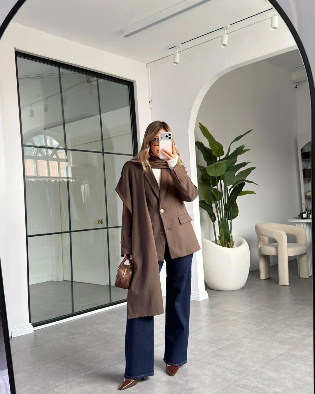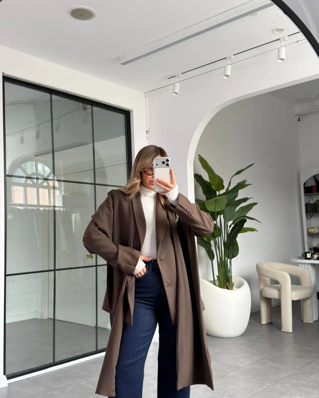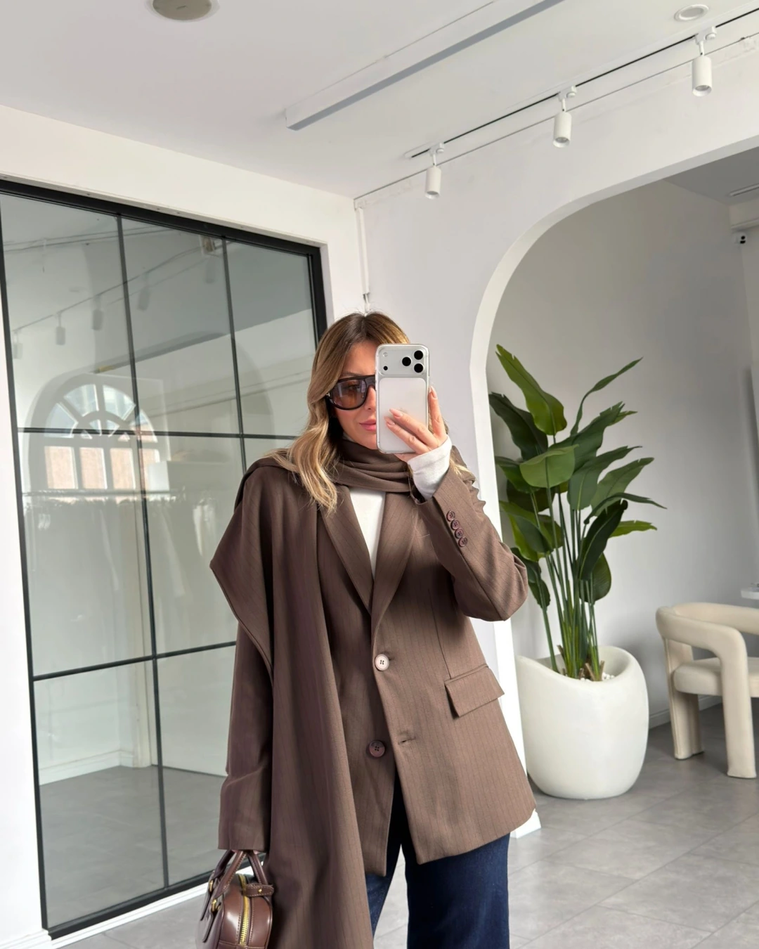 KAHVE ÇİZGİLİ ŞAL DETAYLI CEKET