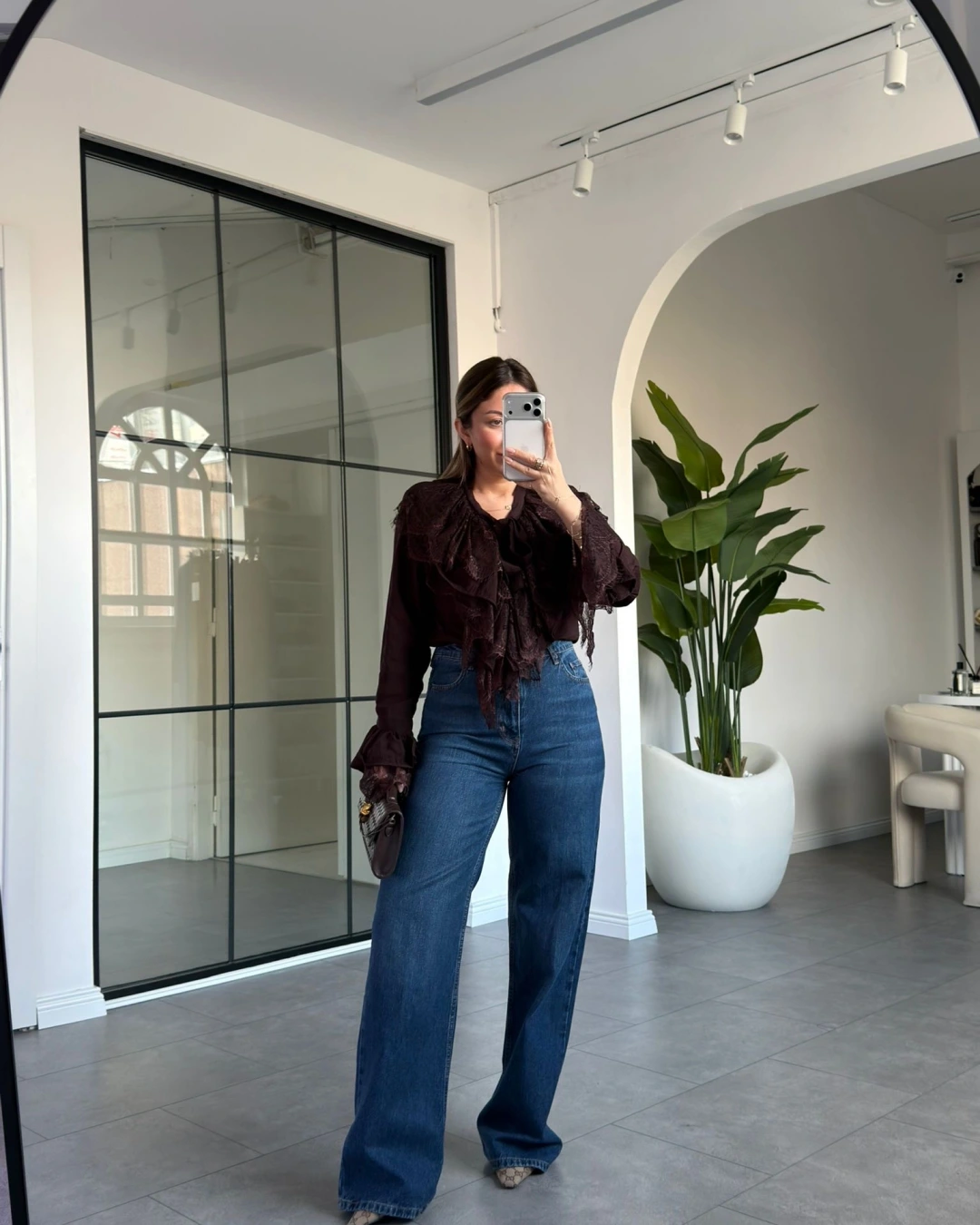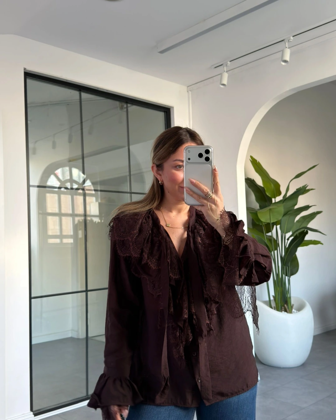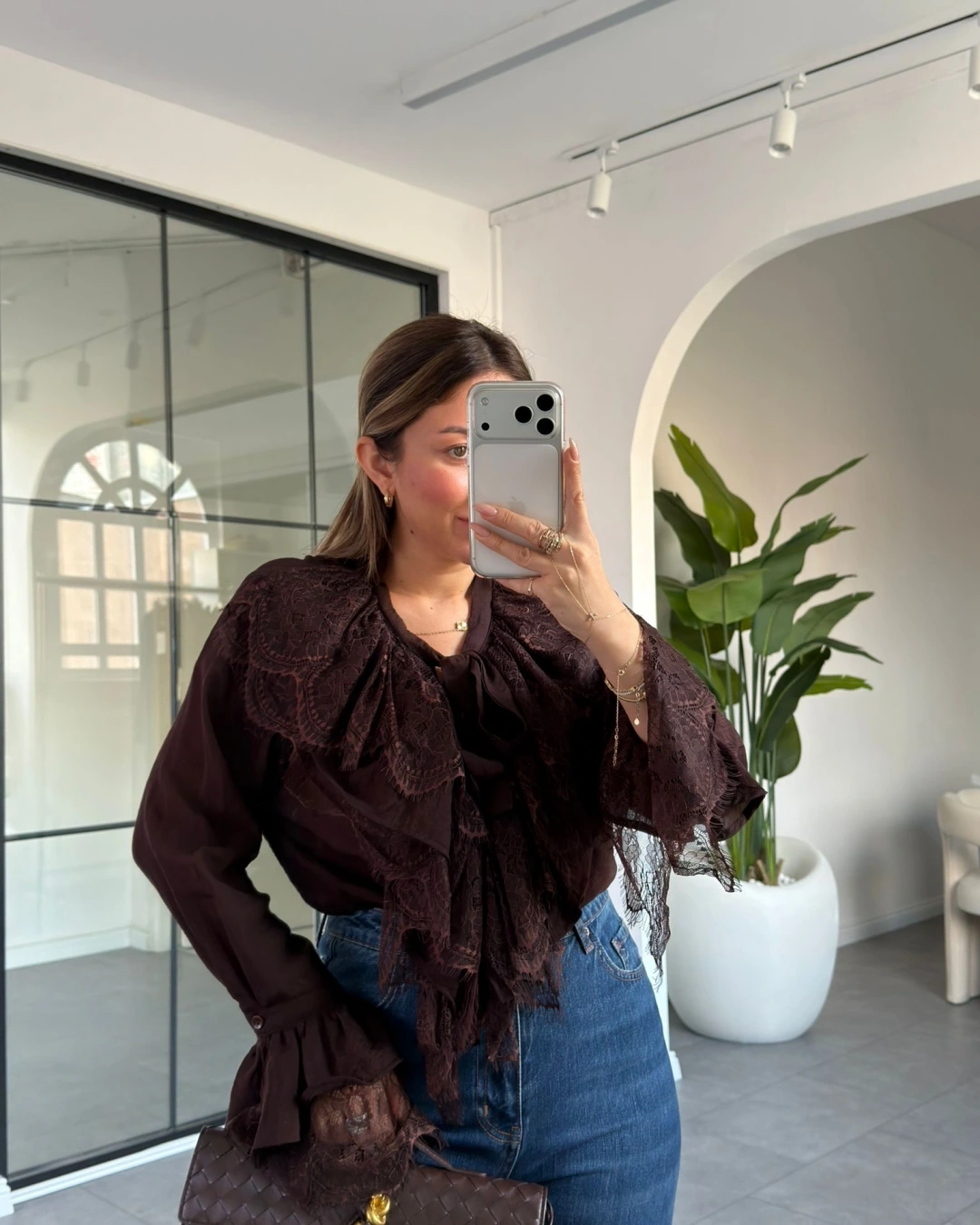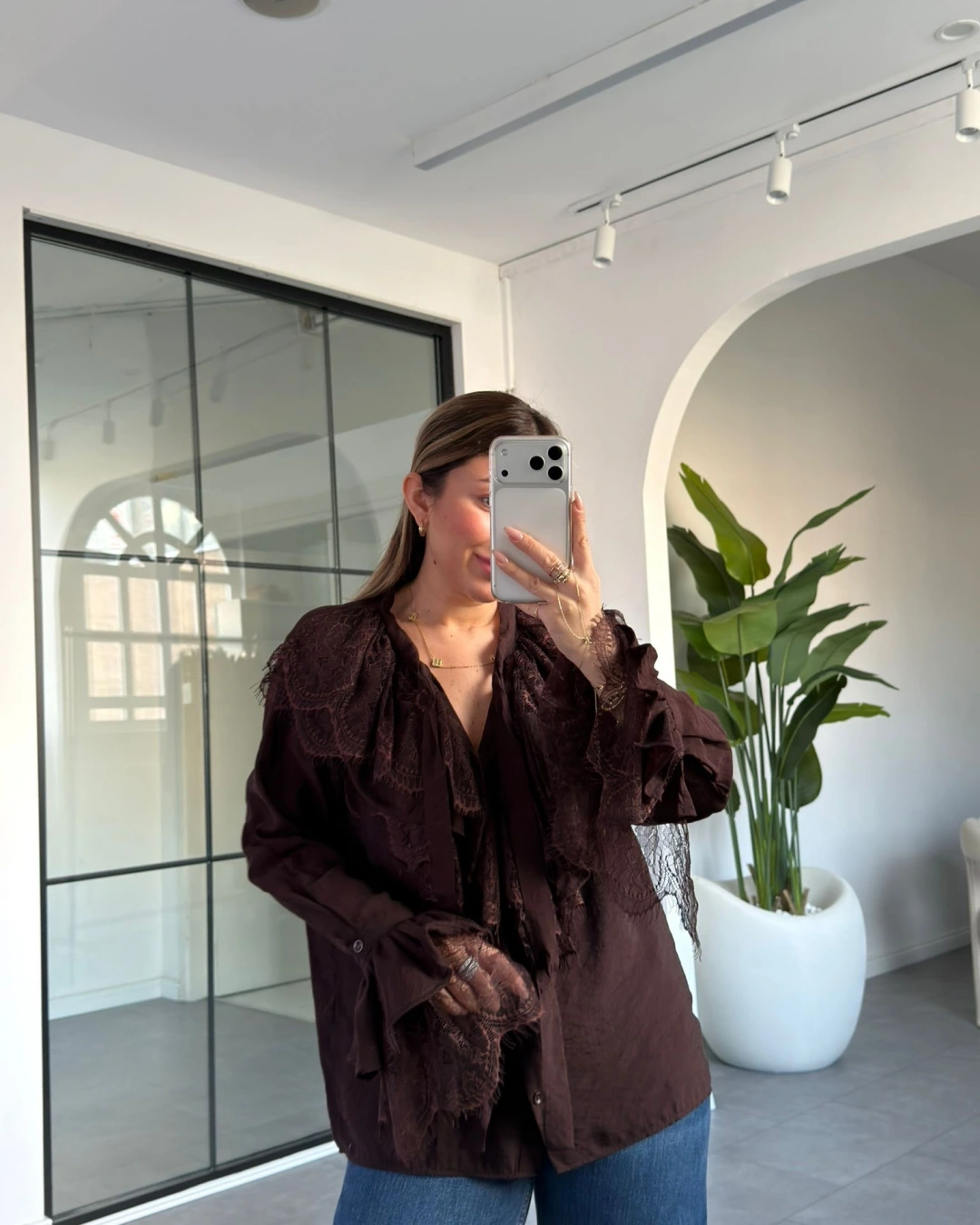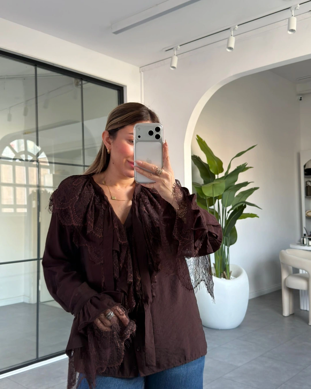 KAHVE DANTEL DETAY GÖMLEK BLUZ