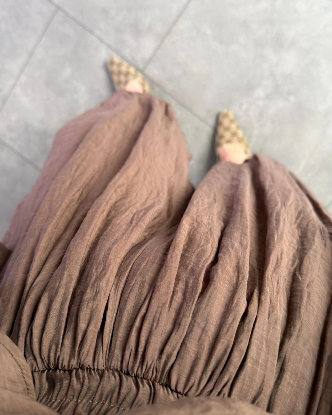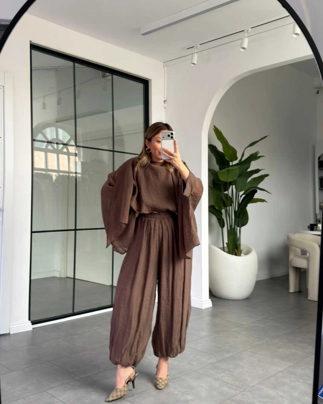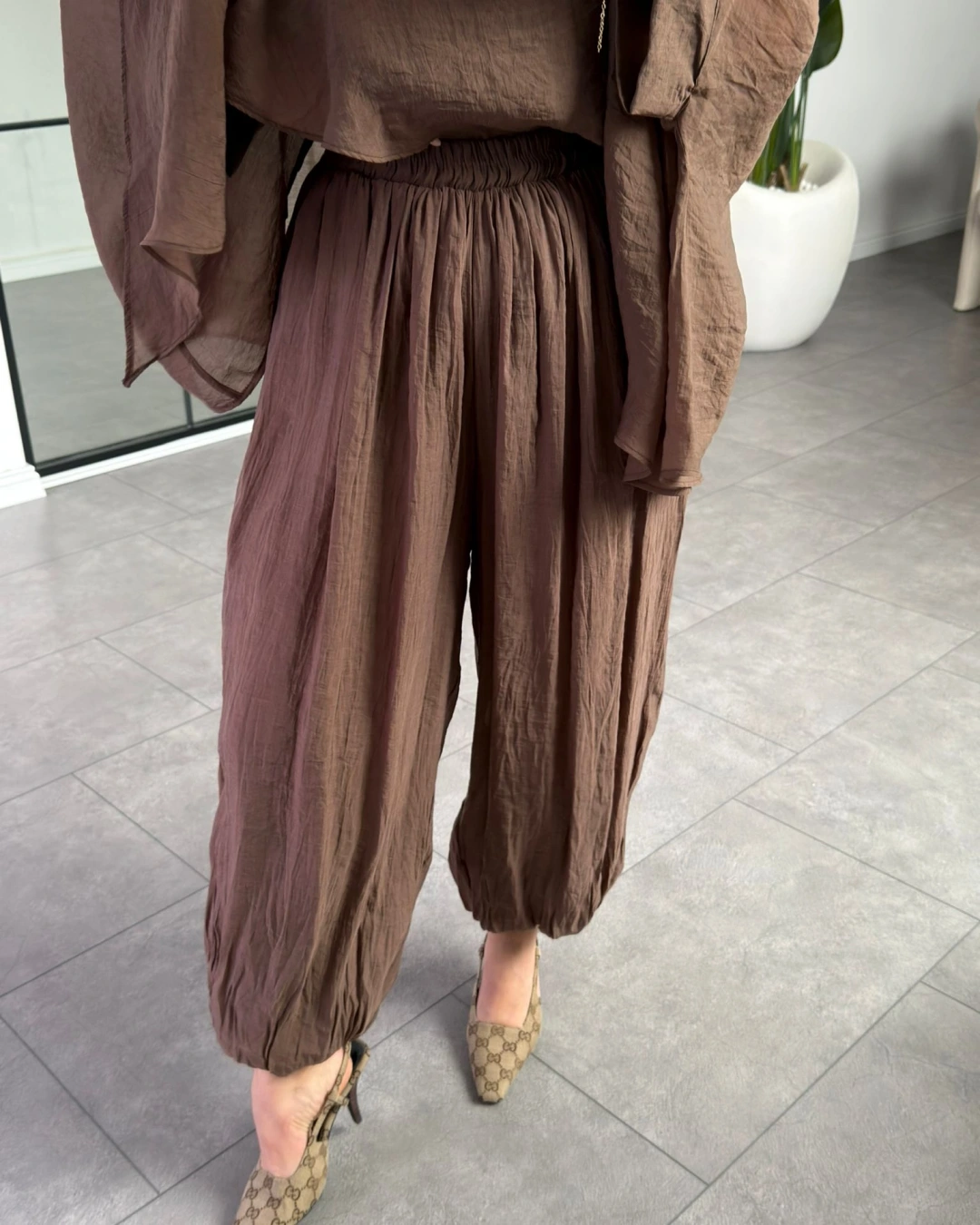 KAHVE DÖKÜMLÜ ŞİFON ŞALVAR PANTOLON