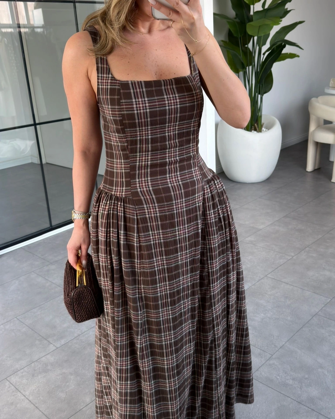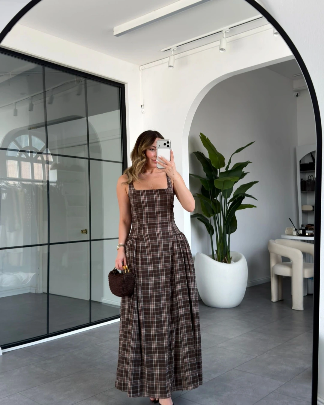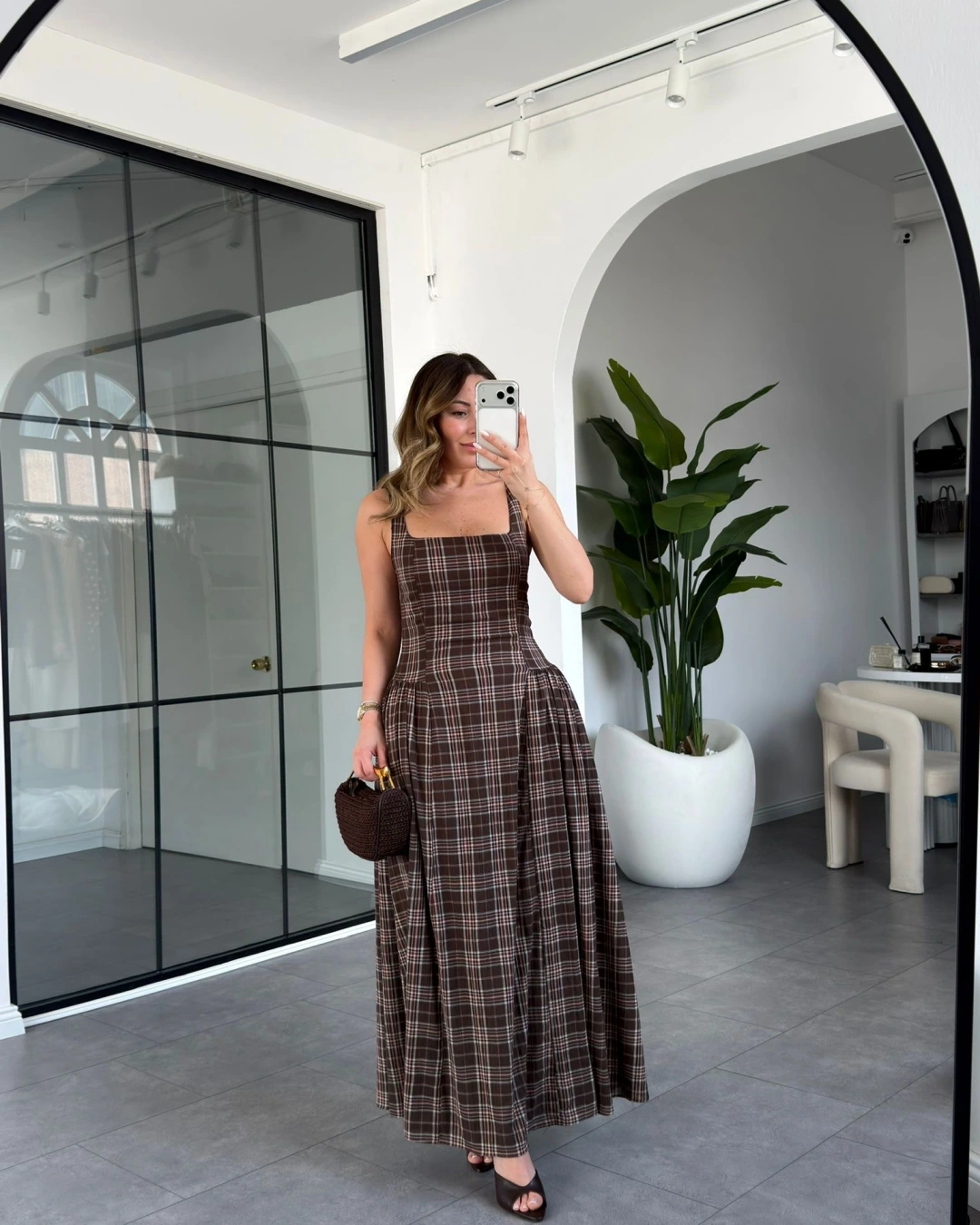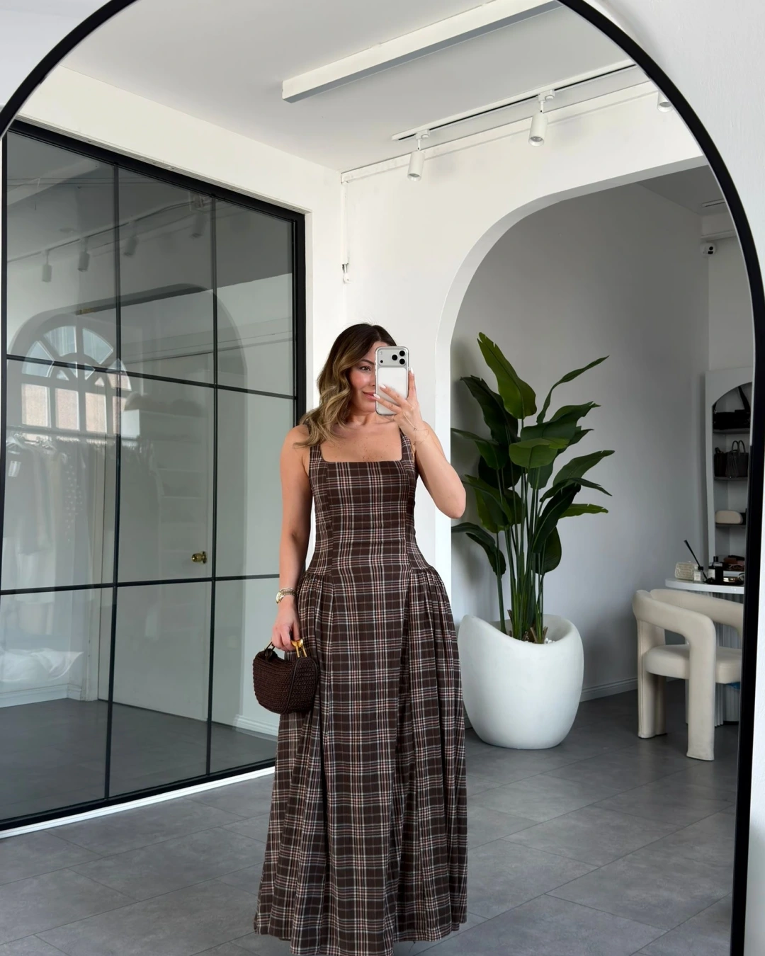 KAHVE EKOSE DESEN KETEN ELBİSE 0916