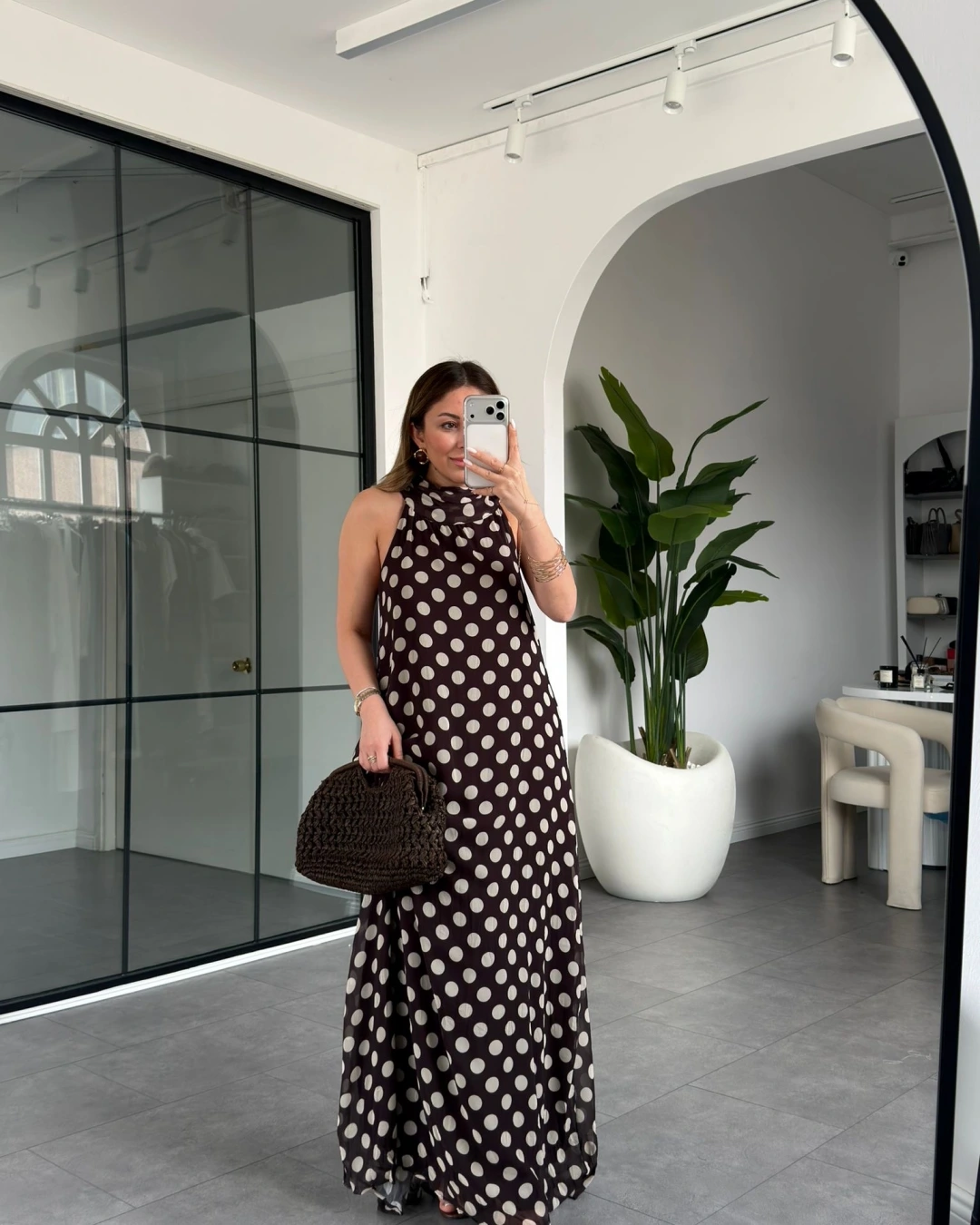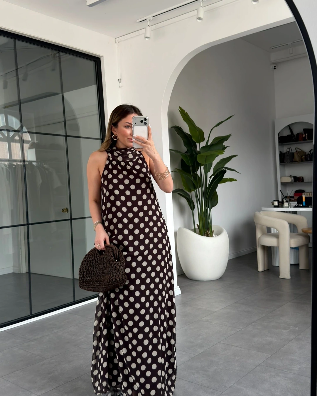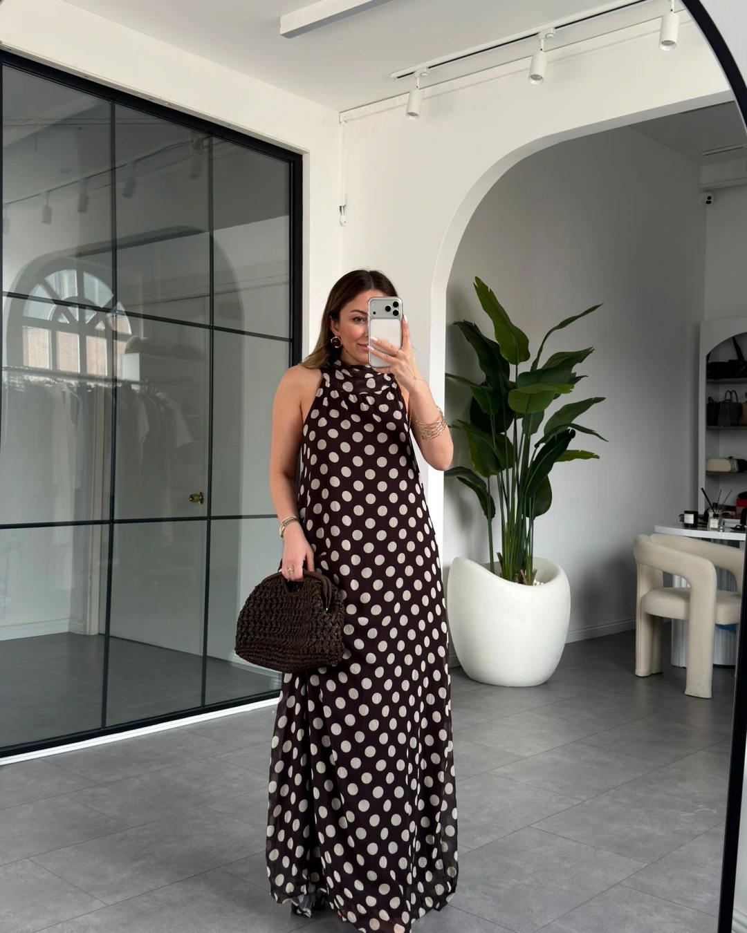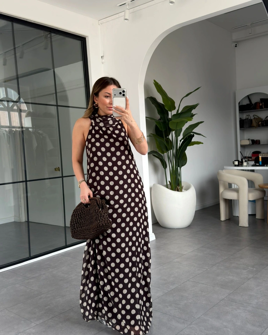 KAHVE EKRU PUANTİYELİ ŞİFON ELBİSE 261060