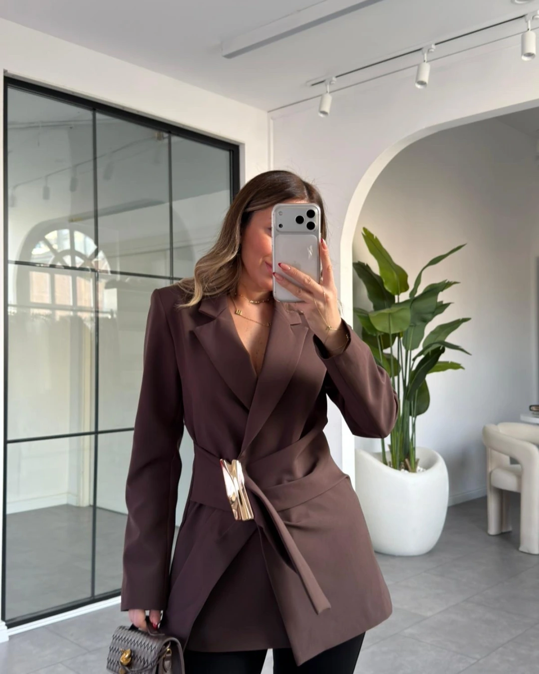 KAHVE GOLD AKSESUAR DETAY BAĞLAMALI BLAZER CEKET