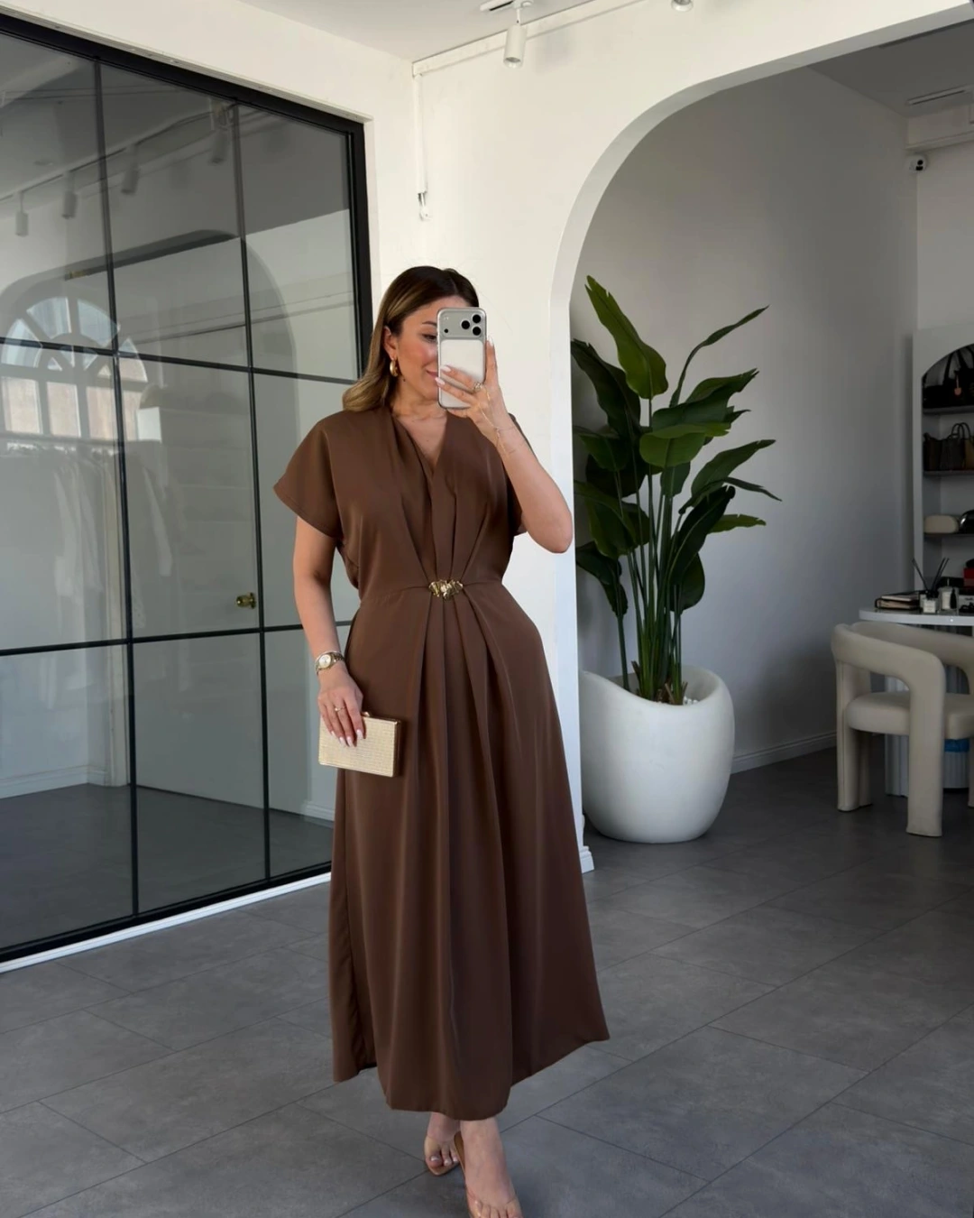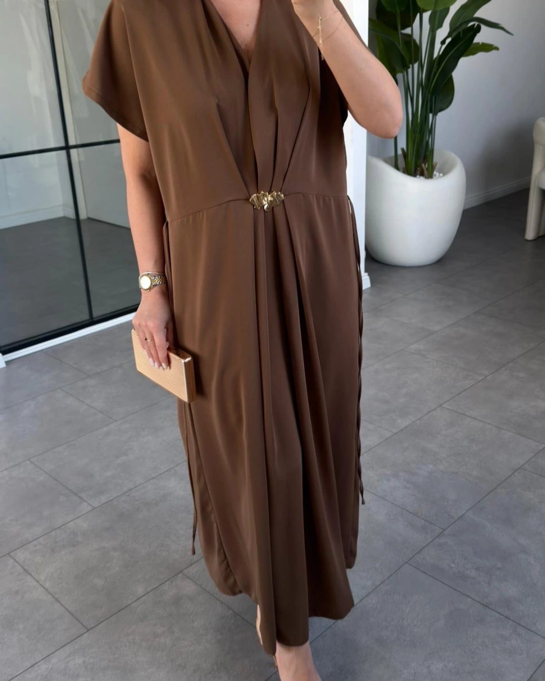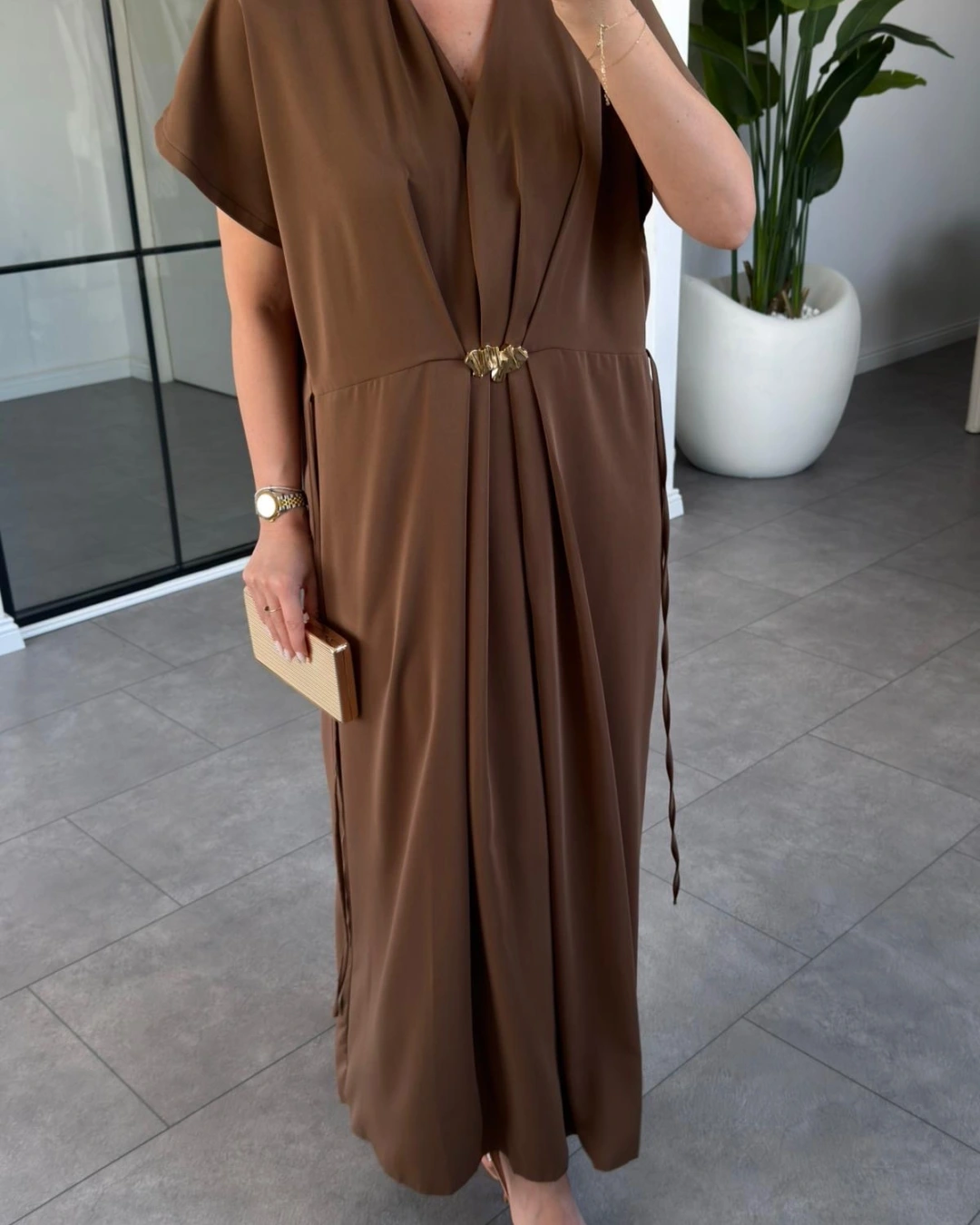 KAHVE GOLD AKSESUAR DETAYLI ELBİSE 37285