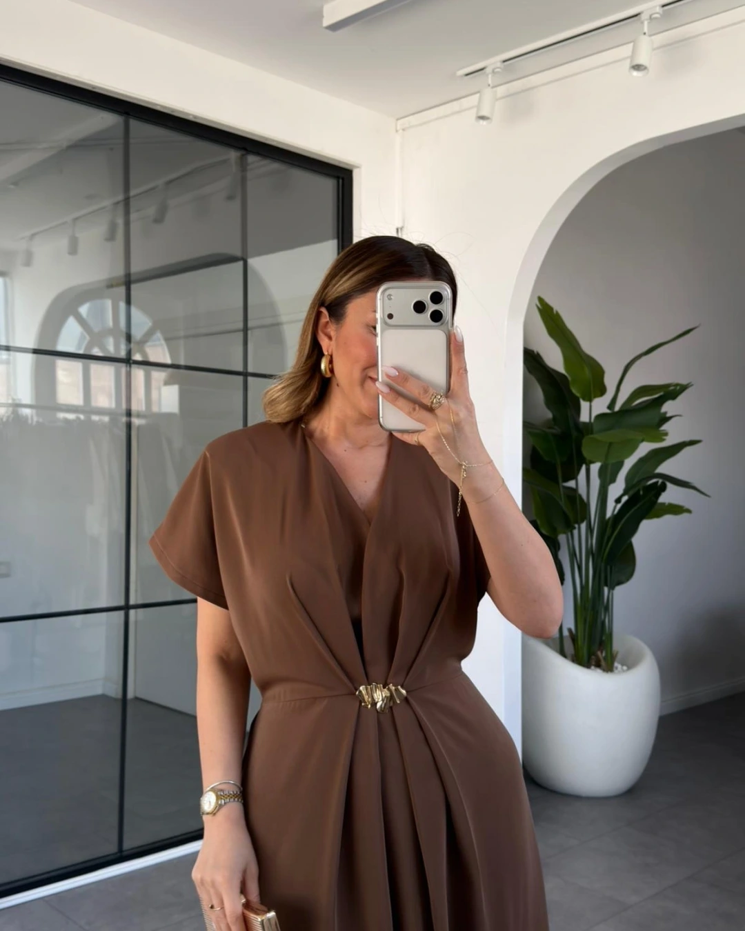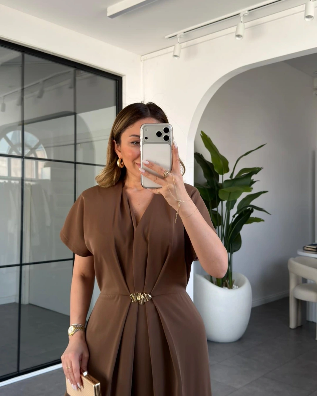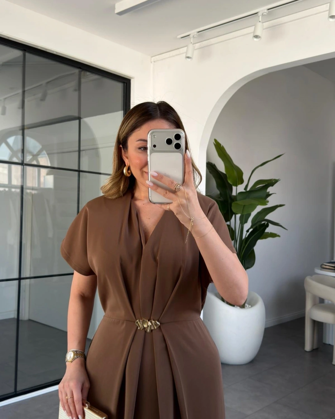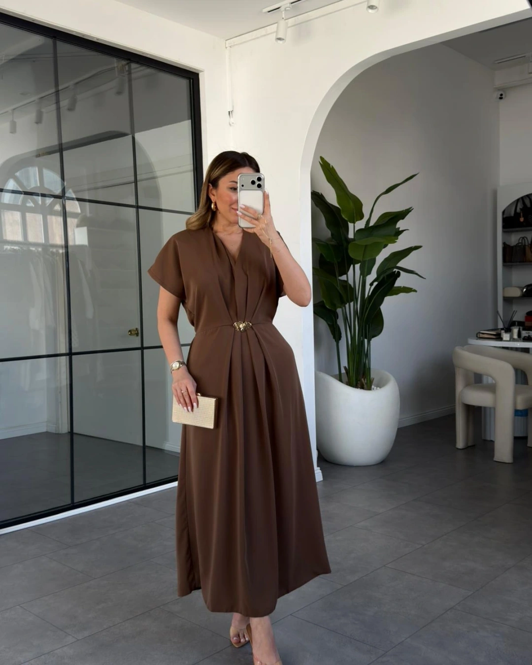 KAHVE GOLD AKSESUAR DETAYLI ELBİSE 37285