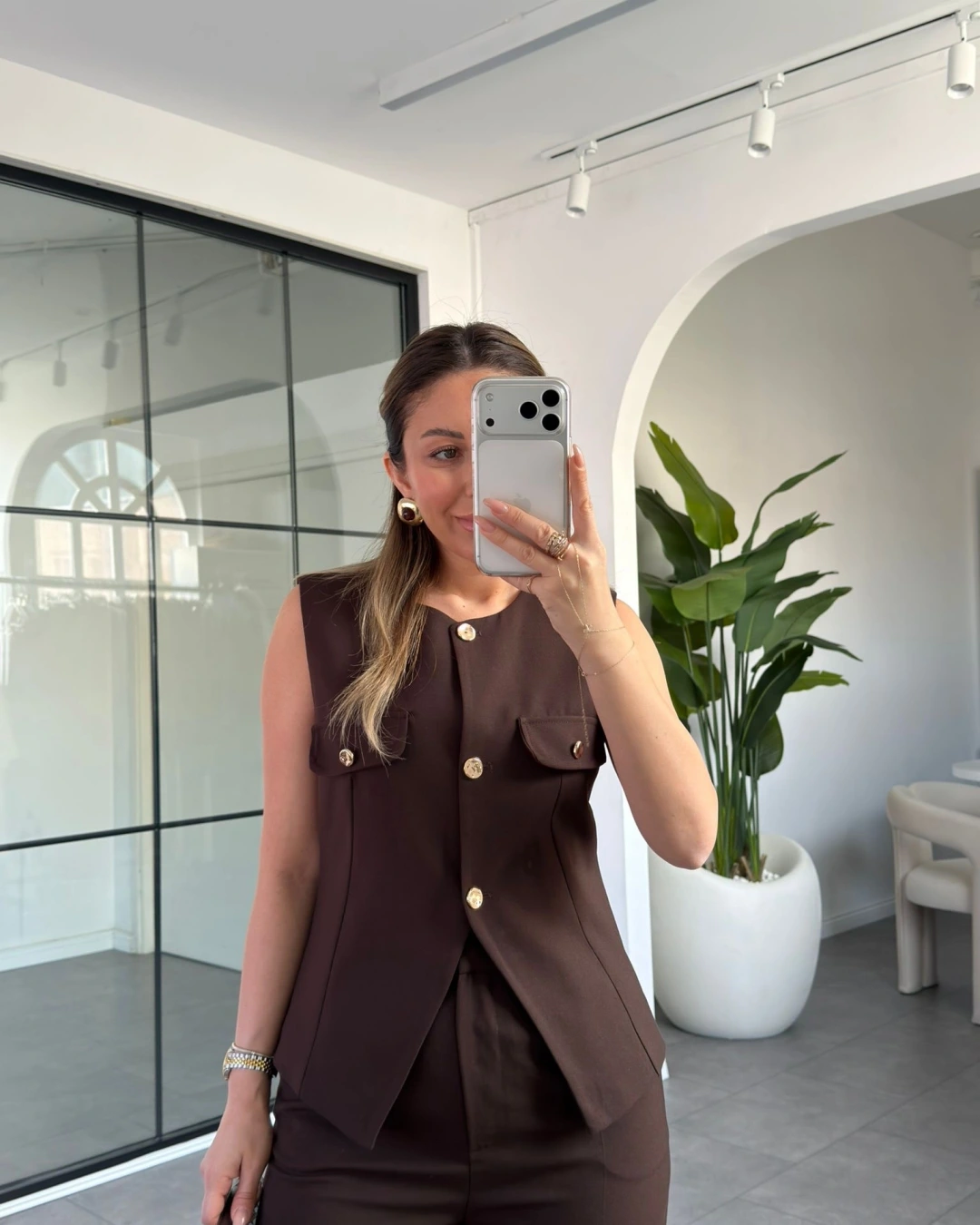 KAHVE GOLD DÜĞMELİ CEP KAPAKLI YELEK PANTOLON TAKIM