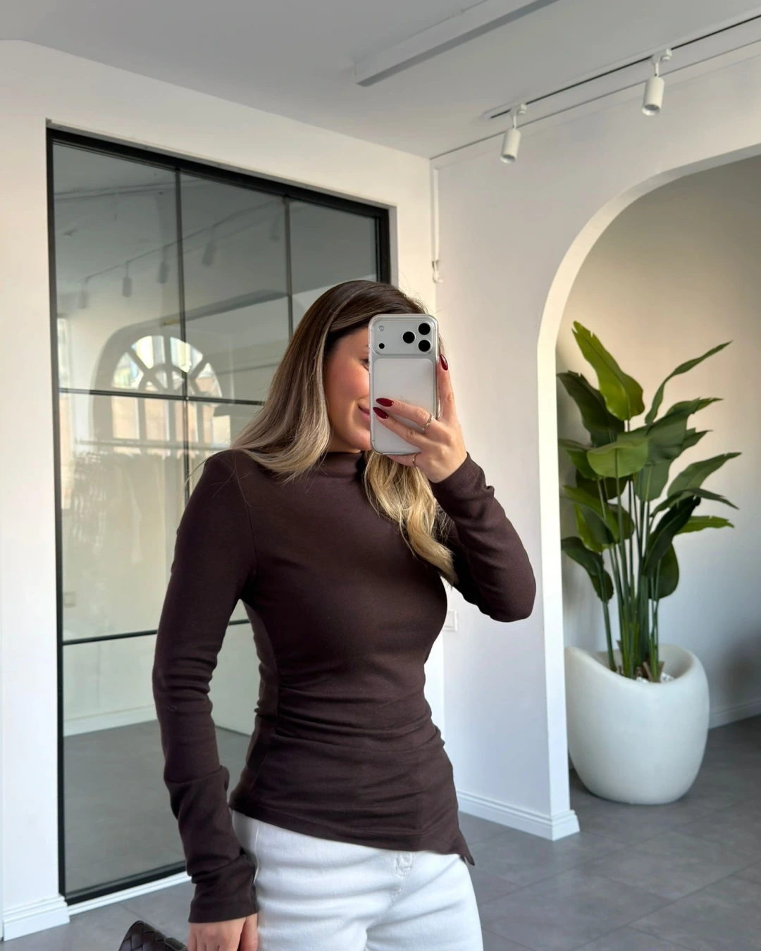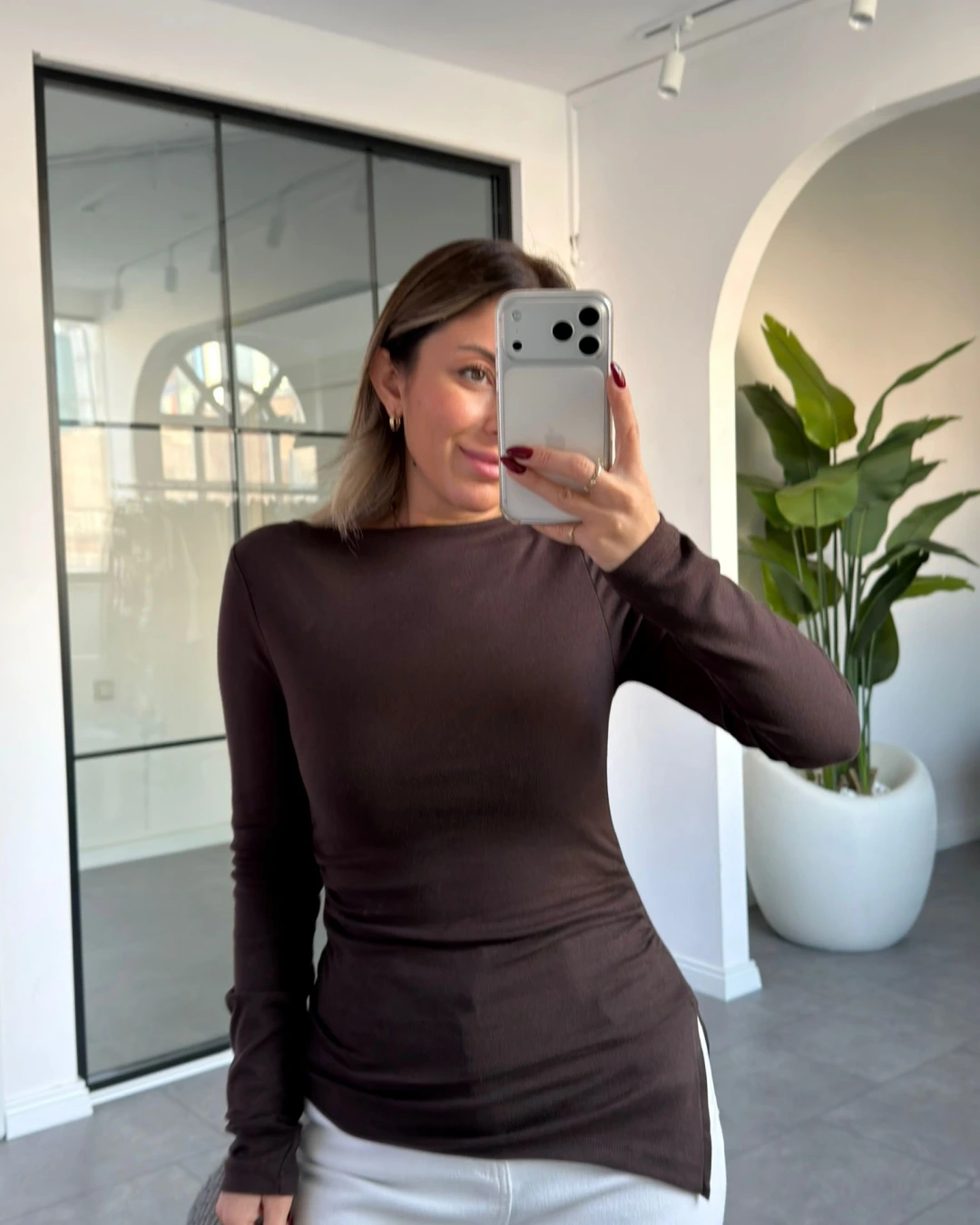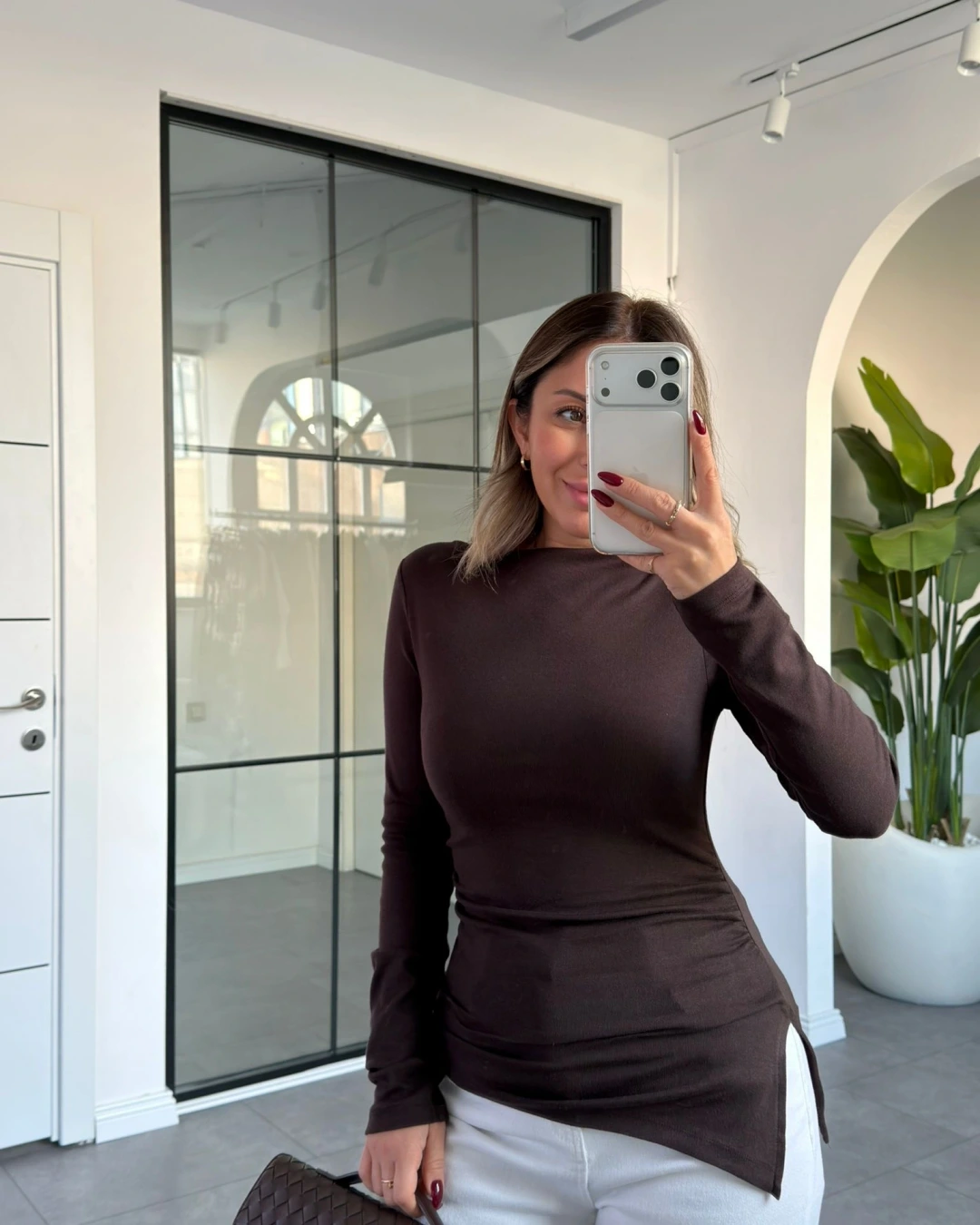 KAHVE KAYIK YAKA ASİMETRİK BLUZ