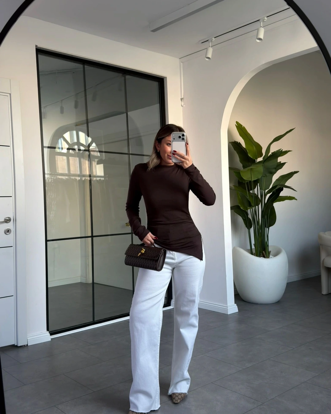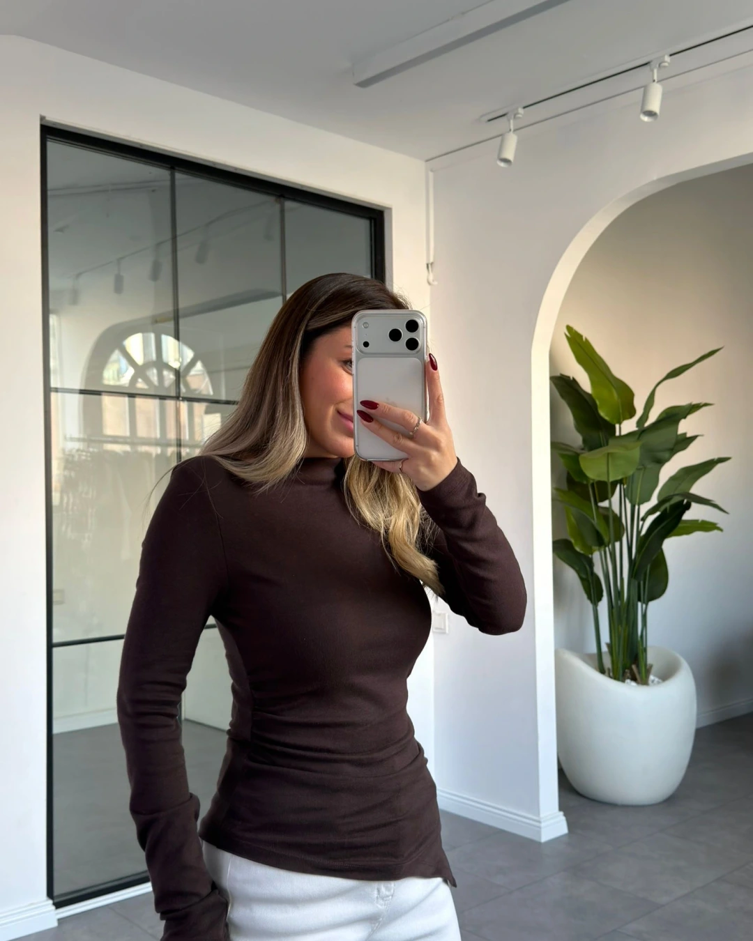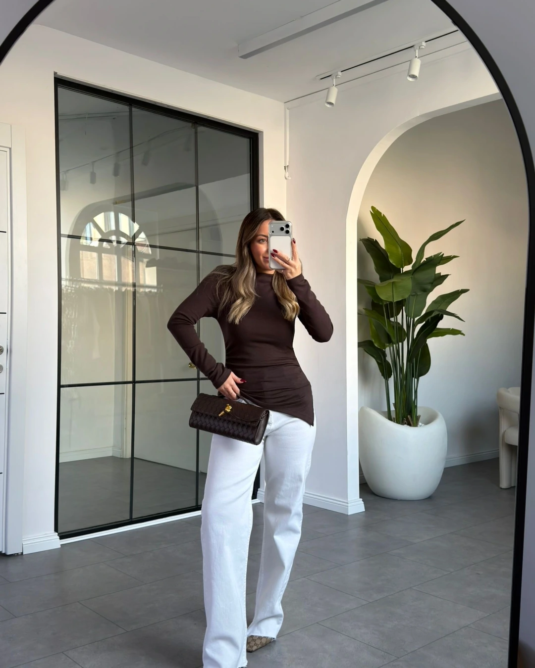 KAHVE KAYIK YAKA ASİMETRİK BLUZ