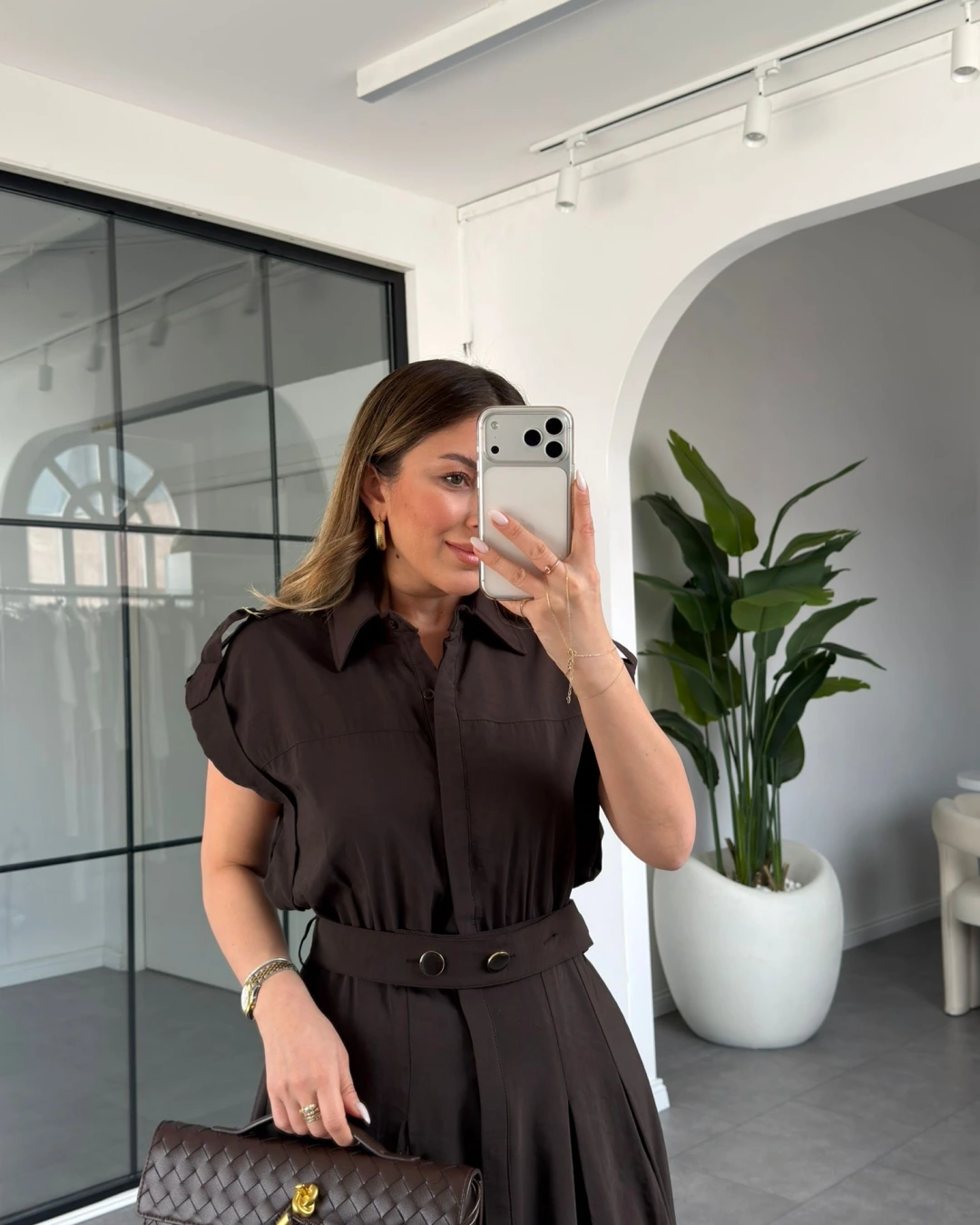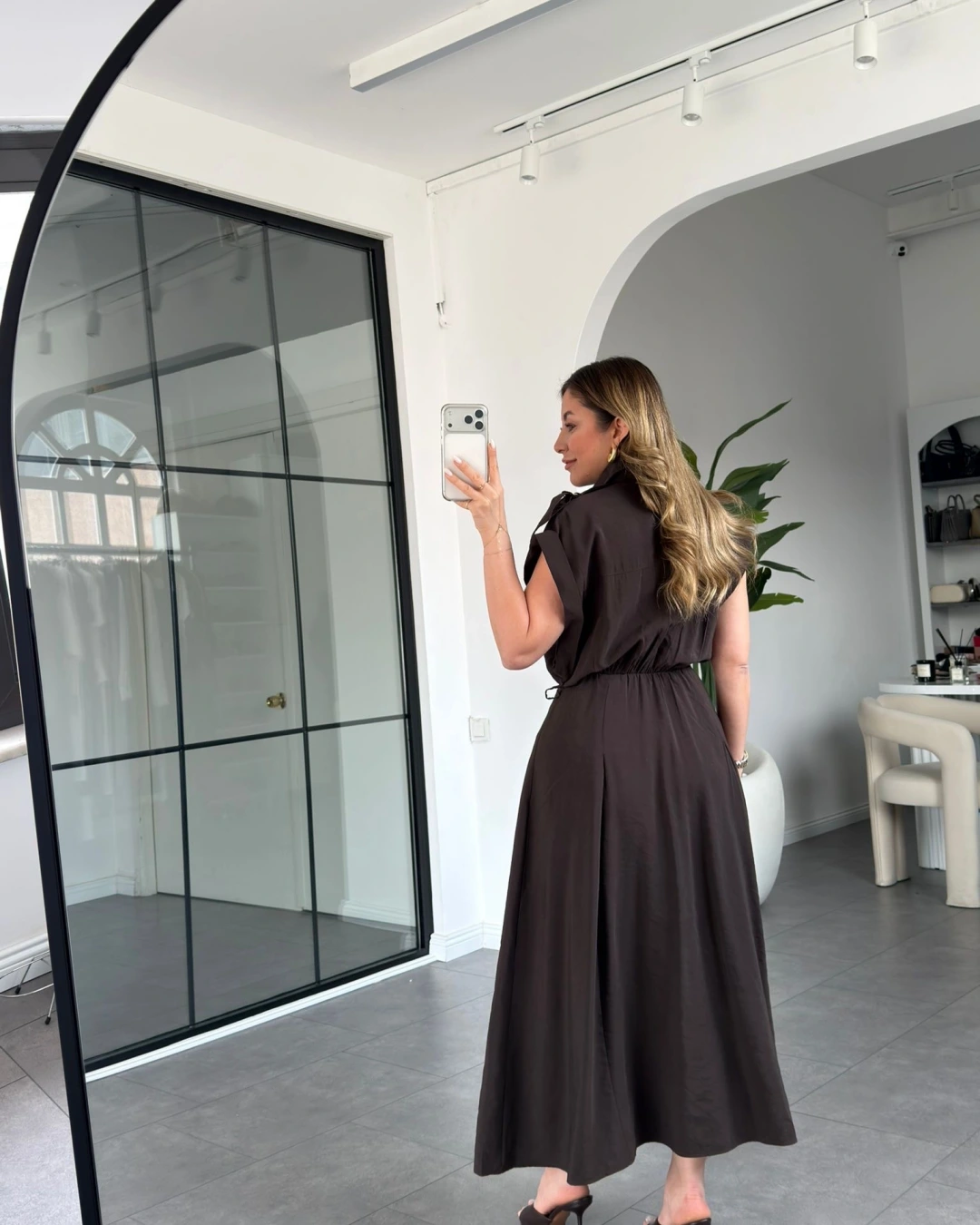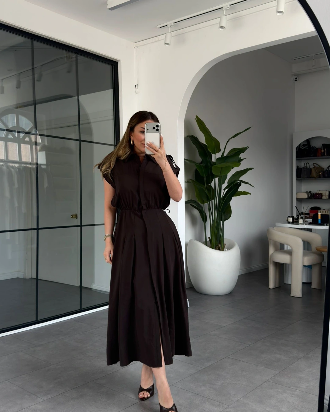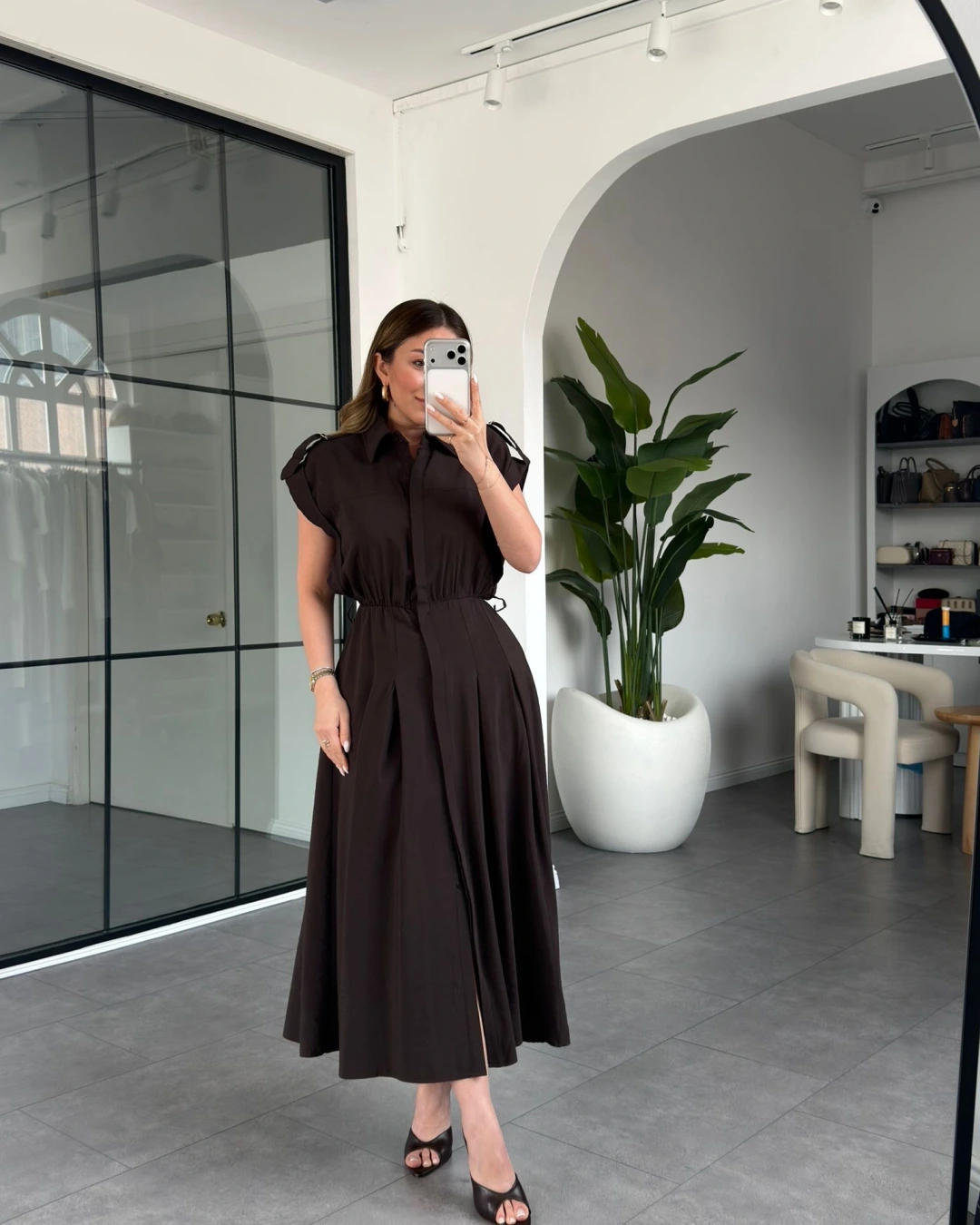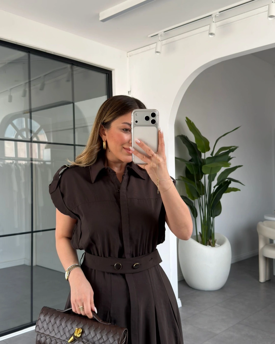 KAHVE KEMERLİ DÜŞÜK KOL ELBİSE 268262